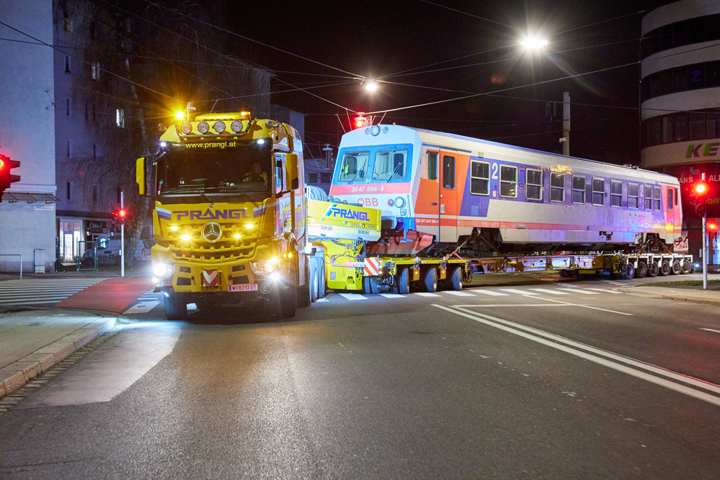 Prangl transportierte einen ÖBB-Triebwagen per Schienenfahrzeug-Transporter vom Linzer Stadthafen zum Mühlkreisbahnhof.