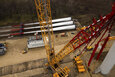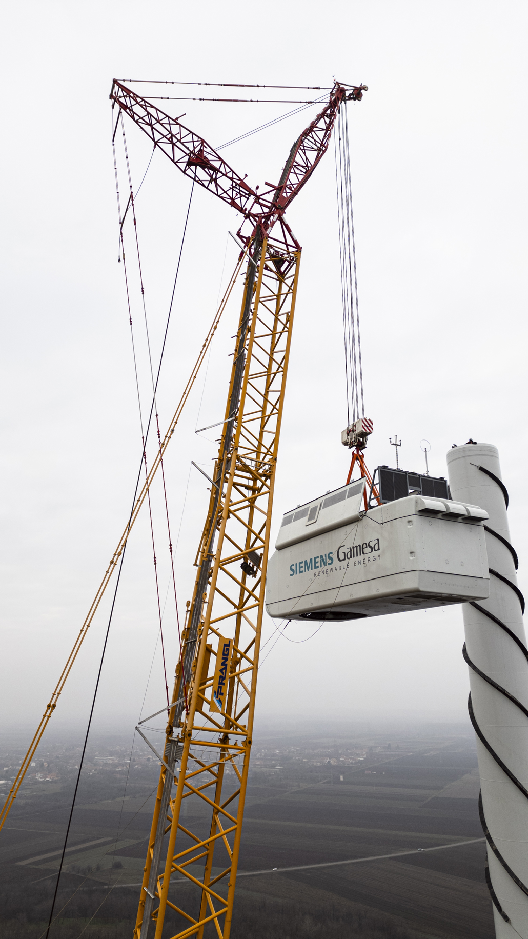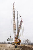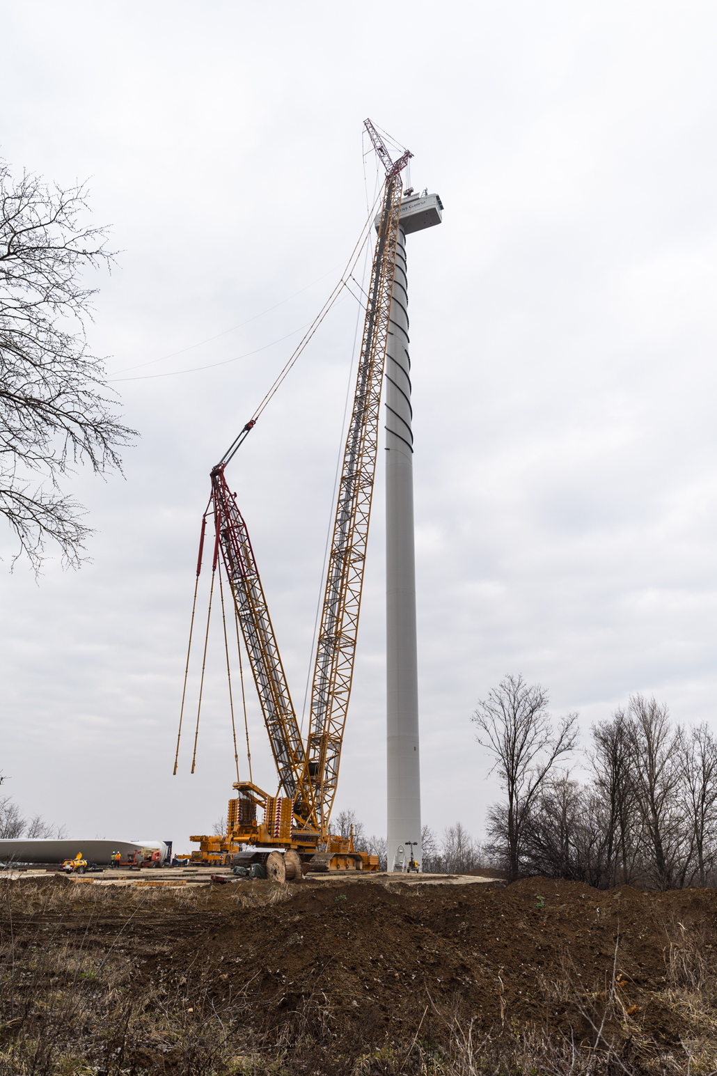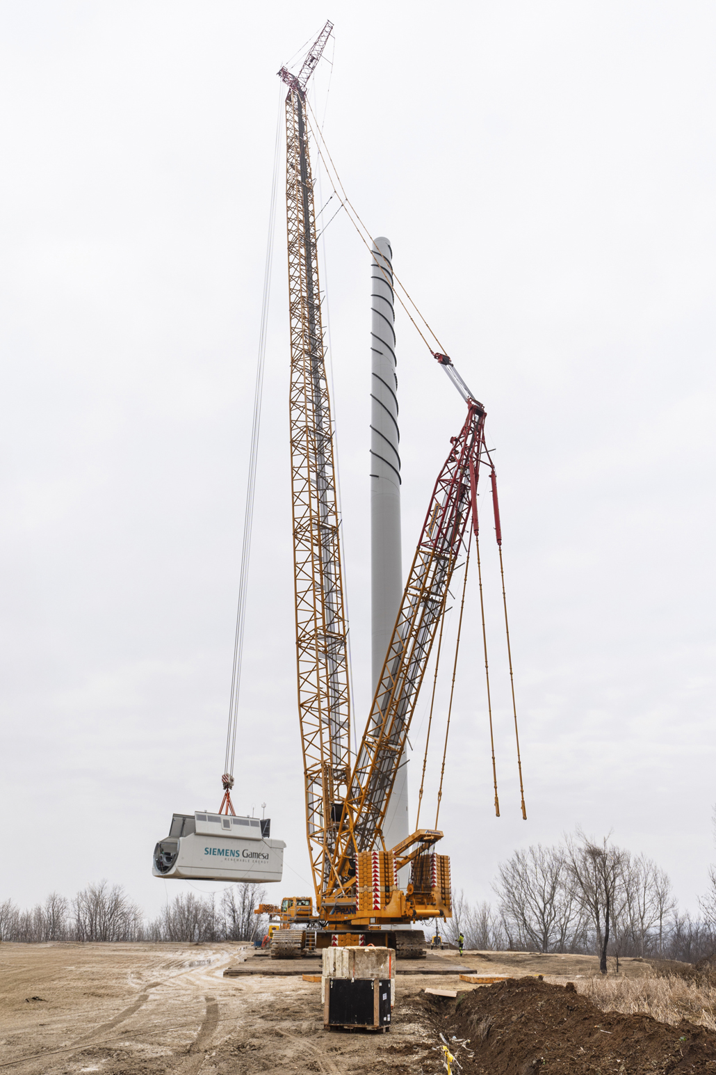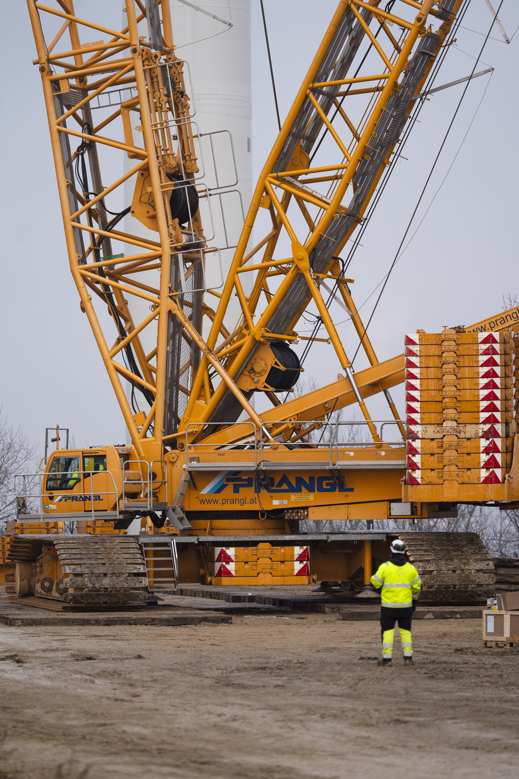 Dieser Raupenkran ist aufgrund seiner Spezifikation in der Lage, alle Komponenten zu bewegen, zu heben und auch in einem kleineren Radius als andere Krane zu verheben. Pro Windkraftwerk galt es, fünf Turmsegmente, die Gondel, Nabe und Antriebsstrang sowie die drei Flügel zu installieren. Im ersten Arbeitsschritt ging es an die Errichtung des Turmes. Für diese Aufgabe wurde ein 200 Tonnen Teleskopkran als Unterstützung bereitgestellt. Der 650 Tonnen Gigant verhob gemeinsam mit dem 200 Tonner die Turmteile (mit einem Gewicht von je 90,5 Tonnen, 82,1 Tonnen, 62,5 Tonnen, 53,9 Tonnen und 50,5 Tonnen) im Tandemhub.
