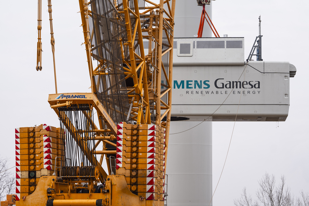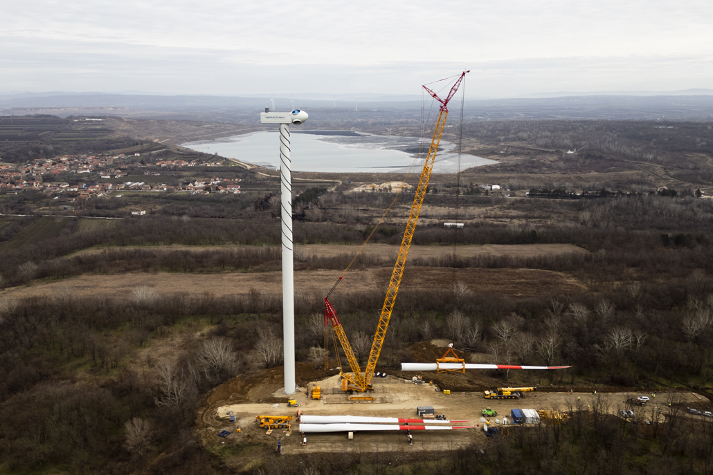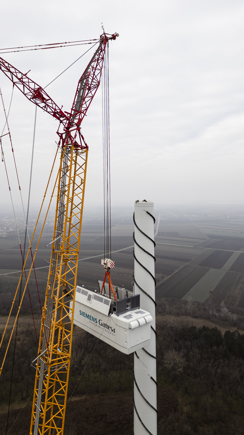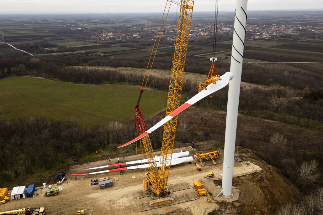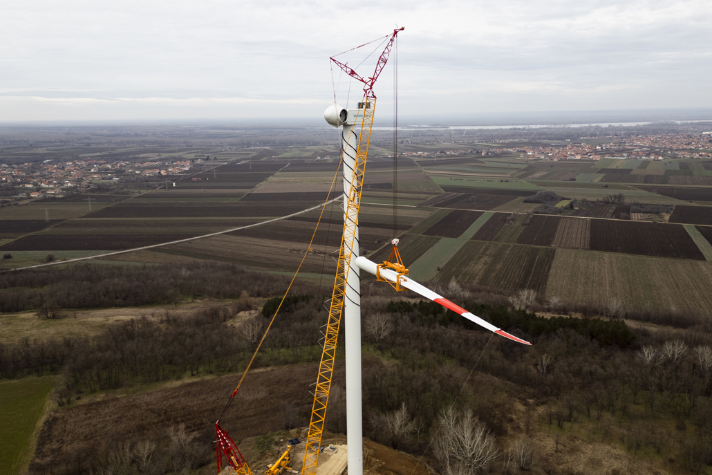 Die Gondel mit einem Gewicht von 91,8 Tonnen und den Abmessungen 12,5 x 4,2 x 4,2 Meter kam als nächstes an die Reihe, danach die einzelnen Rotorblätter mit einer Länge von je knapp 65 Meter und einem Gewicht von je 32,5 Tonnen. Nach der Fertigstellung jeder einzelnen Anlage wurde der Hauptkran mit einem zusätzlichen 90 Tonnen Teleskopkran von Baustelle zu Baustelle verlagert. Sowohl Menschen als auch Maschinen erledigten ihre Job vorbildlich. Nach der Eröffnung den Windparks Kostolac werden diese Turbinen die leistungsstärksten des Landes sein.