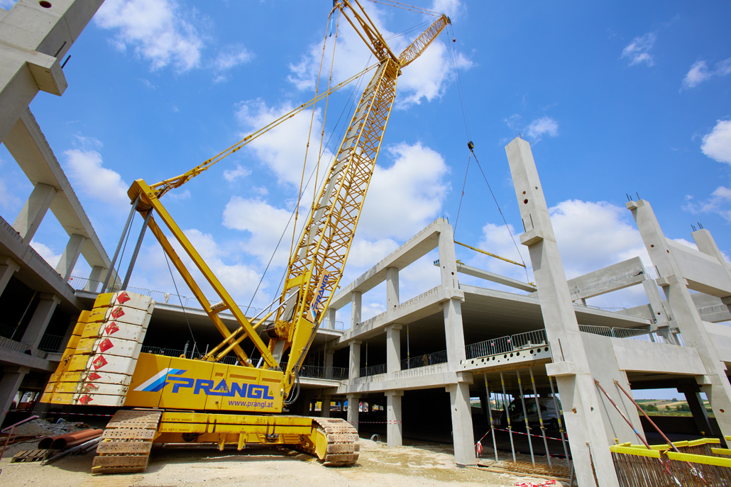Nach Abschluss dieses Bauabschnittes ging es weiter zum nächsten, wo die gleichen Arbeiten erfolgten. Insgesamt gab es vier Bauabschnitte am Hauptgebäude, welches am Ende eine Höhe von 14 Meter erreichte. Speziell das Aufdrehen der Ecksäulen mit je 12 Tonnen Eigengewicht brachte den Raupenkran durch die Ausladung von bis zu 44 Meter fast an die Grenzen seiner Kapazität. Doch die akribische Planung des Prangl-Teams ging auf und die Kranarbeiten konnten zur höchsten Zufriedenheit des Auftraggebers pünktlich abgeschlossen werden.