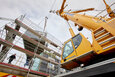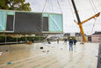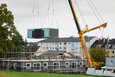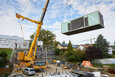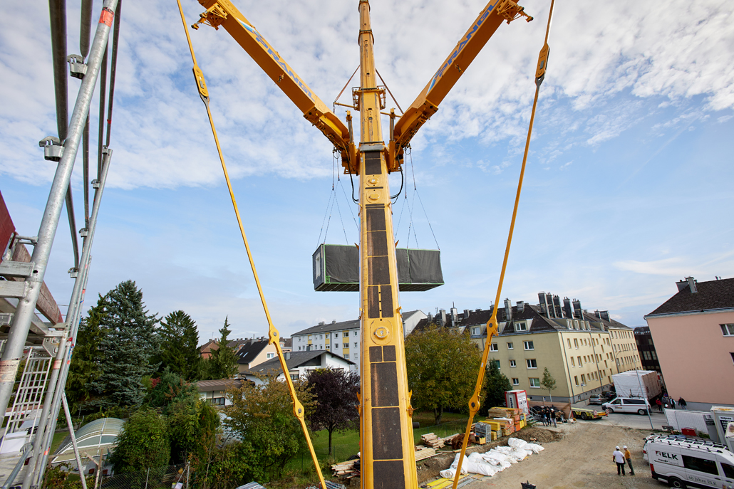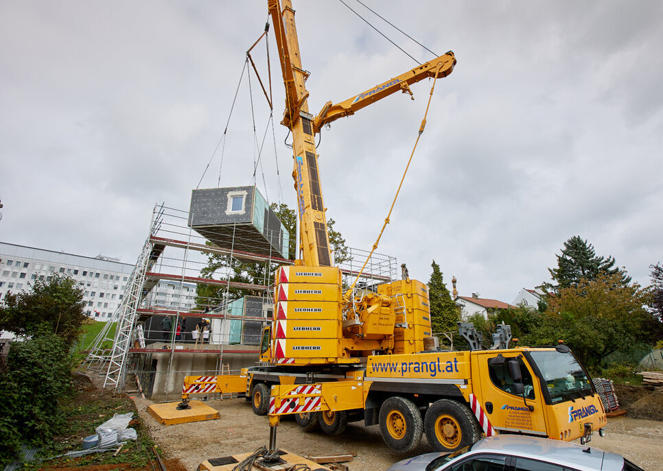 Der Autokran wurde nach dem Lastfall entsprechenden Hebewerten und Auslegerlänge gewählt: So kam ein 350 Tonnen Teleskopkran mit Y-Abspannung und 120 Tonnen Ballast zum Einsatz. Um möglichst effizient arbeiten zu können, wurde der gelbe Gigant so platziert, dass sämtliche Container (jeweils 20 Tonnen schwer, 12,5 Meter lang, 5,40 Meter breit und rund 3 Meter hoch) von einem Standplatz aus verhoben werden konnten. Die vorgefertigten Module wurden an der Baustelle angeliefert und danach vom Prangl-Team per Kran mit einer Ausladung von 29 Meter Stück für Stück und in höchster Präzision aneinandergefügt.