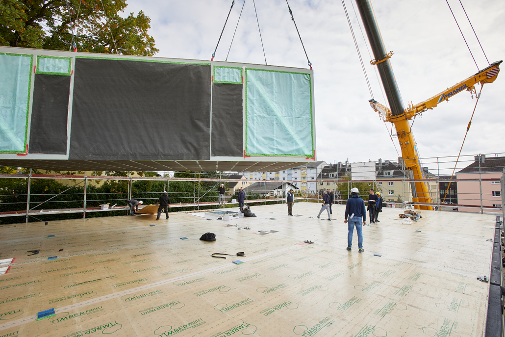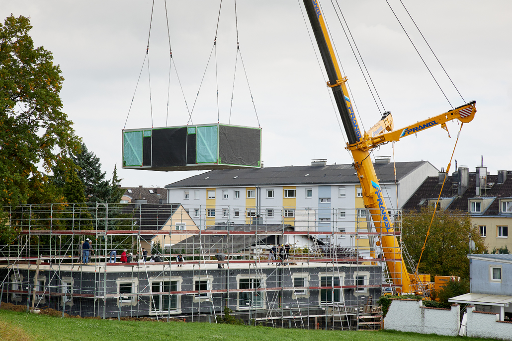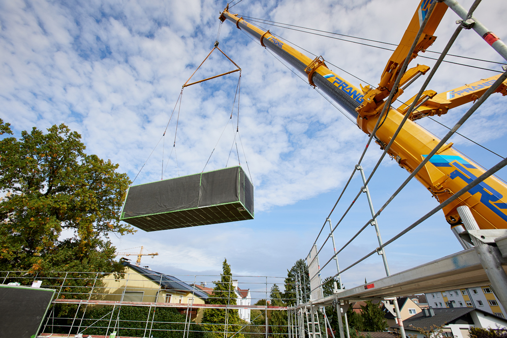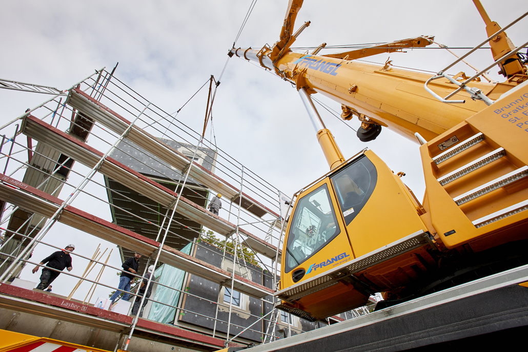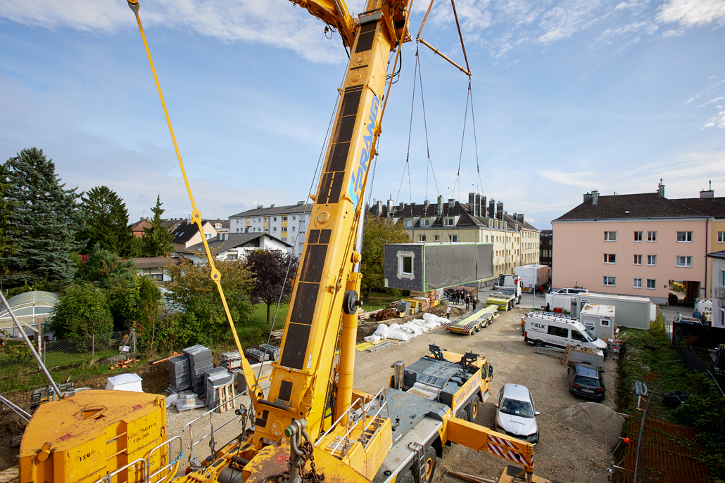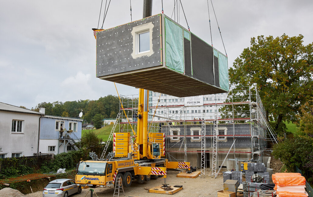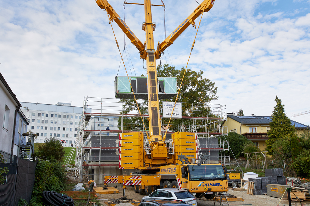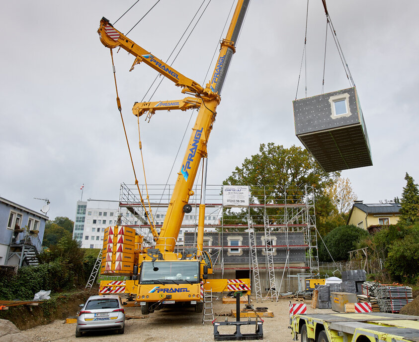 In Amstetten wurde Prangl für den Aufbau einer Wohnhausanlage, die aus vorgefertigten Raumzellen zusammengesetzt wird, engagiert. Die Herausforderung bestand in diesem Fall vor allem in der knapp bemessenen Zeit. Für die Recherche vorab, das Erwirken aller erforderlichen Genehmigungen sowie alle notwendigen Maßnahmen danach war nur wenig Puffer vorhanden.