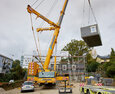 Fertigteilhäuser für Bauherren, die es eilig haben, gibt es schon längere Zeit. Jetzt gibt es einen neuen Trend: Gebäude aus einzelnen Raumzellen, die im Werk vollständig vorgefertigt werden – inklusive Elektrik und sanitärer Einrichtung. Mehrere dieser schlüsselfertigen Module ergeben zusammen ein komplettes Haus – und das in kürzester Zeit, sprich in wenigen Tagen. Für das Zusammensetzen der Module ist nicht nur der richtige Mobilkran gefragt, sondern auch eine erfahrene Mannschaft. Prangl übernahm den Aufbau der modernen Wohnhausanlage. Wobei zunächst grundlegende Vorarbeiten nötig waren…