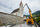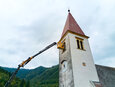 Die neue Allrad-Zugmaschine mit einem 225 Metertonnen Ladekran ist mit ihren Spezifikationen ideal für den Umbau der Sendeanlage im Kirchturm geeignet. Wegen der beengten Platzverhältnisse – schmale Zufahrtsstraße, Friedhofsmauer sowie Zäune von den Nachbargrundstücken – war keine Vollabstützung des Krans möglich. Die Lösung: die Hauptstütze des Krans wurde durch das Tor der Friedhofsmauer geführt, womit ein sicherer Stand garantiert war. Nach der sorgfältig durchgeführten Positionierung des Ladekrans konnte mit den Arbeiten laut Auftrag begonnen werden. Der erste Schritt war die gründliche Reinigung des Kirchturmes.