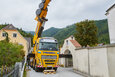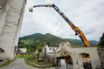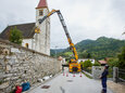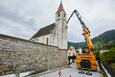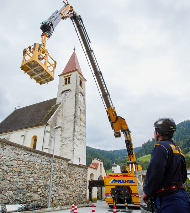 Die Pfarrkirche Übelbach ist eine spätgotische Wandpfeilerkirche. Die beiden Längsseiten der Kirche sind vom Friedhof gesäumt, die Zufahrt ist nur über die schmale Kirchengasse möglich. Eine Situation, welche das beauftragte Prangl-Team vor eine besondere Herausforderung stellte. Einerseits sollte das zum Einsatz kommende Gerät in der Gasse sicher platziert werden können und andererseits die notwendige Ausladung bei gleichzeitig erforderlicher Belastung erreichen. Mit einer im Prangl-Fuhrpark neuen Maschine konnten alle Aspekte einer unkomplizierten und effizienten Aufgabenbewältigung erfüllt werden.