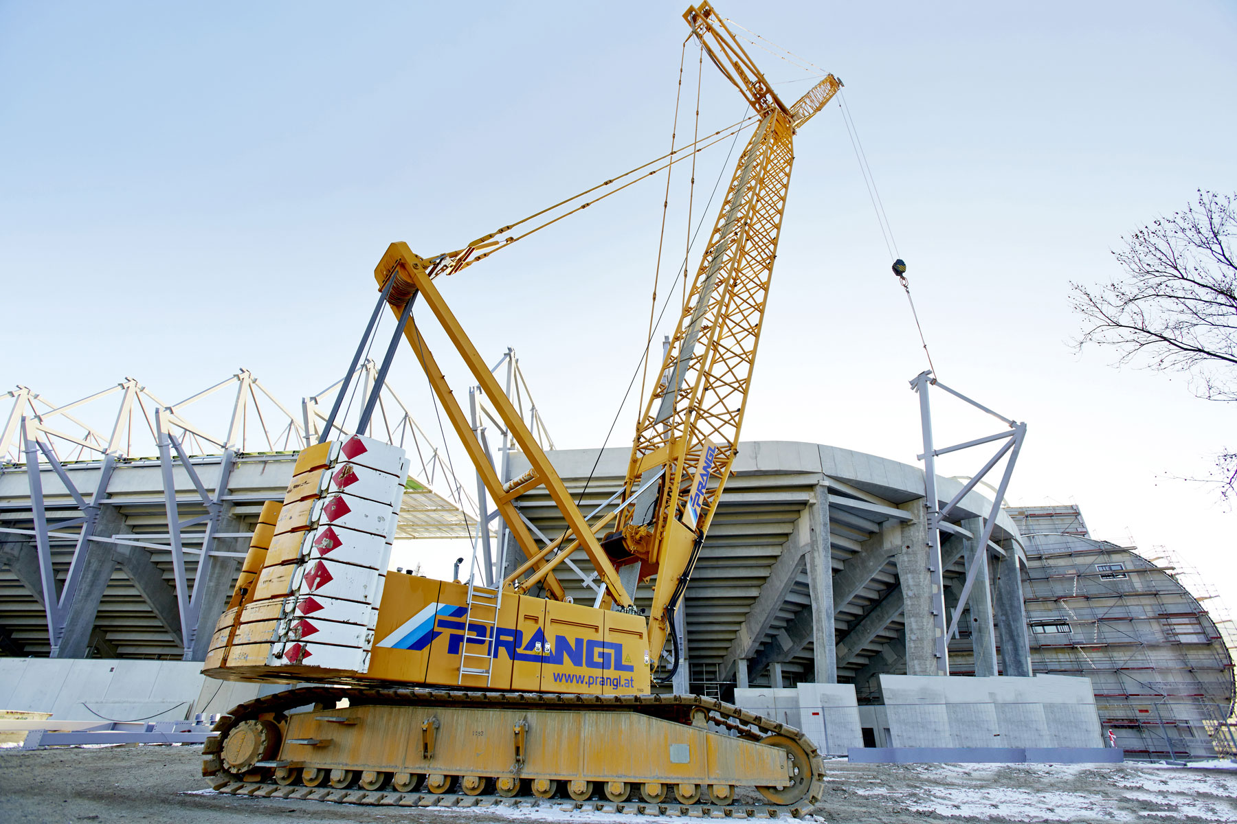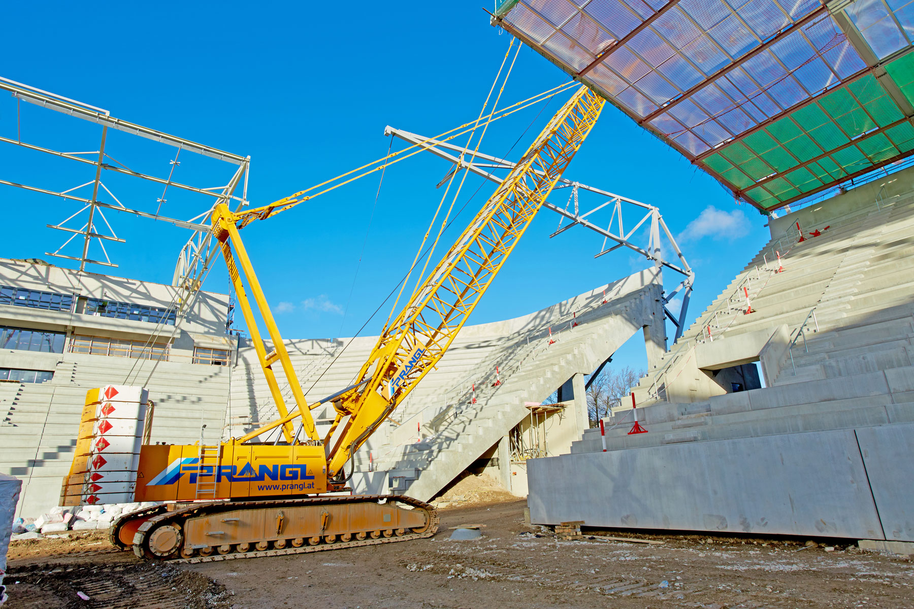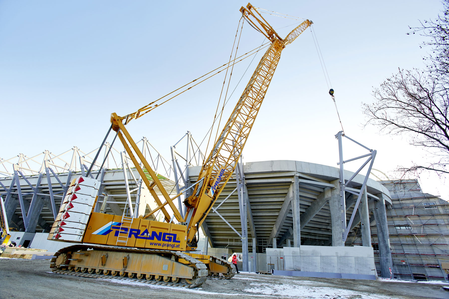 Mit einem Fassungsvermögen von 24.200 Sitzplätzen erfüllt die neue Arena des SK Rapid Wien alle UEFA-Kriterien für internationale Spiele. Prangl stellt nahezu das komplette Kran-Equipment für dieses imposante Bauwerk. Manchmal ist weniger die Kranarbeit das Spannende, sondern die Frage, wie ein großer Kran die Baustelle wieder verlassen kann …