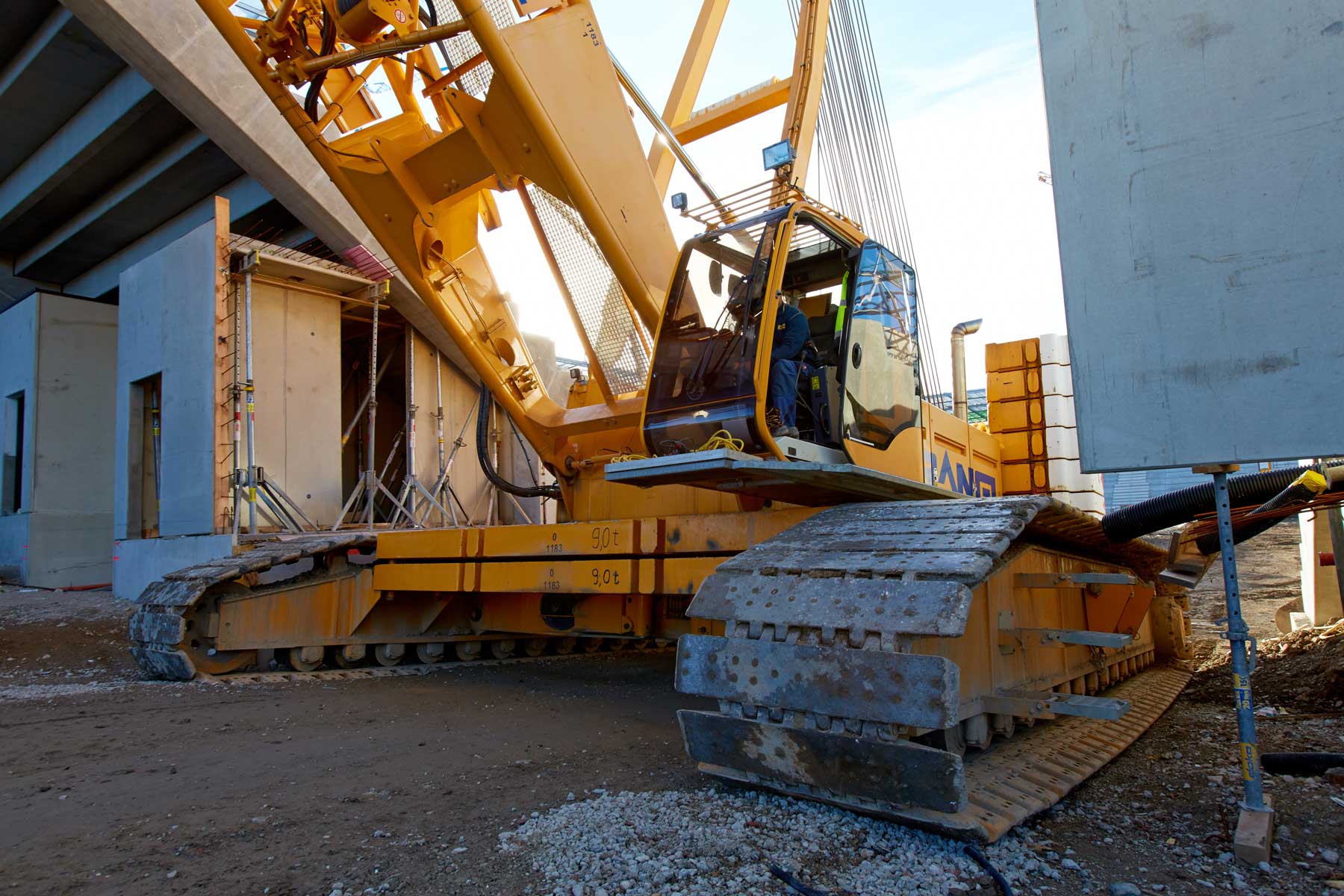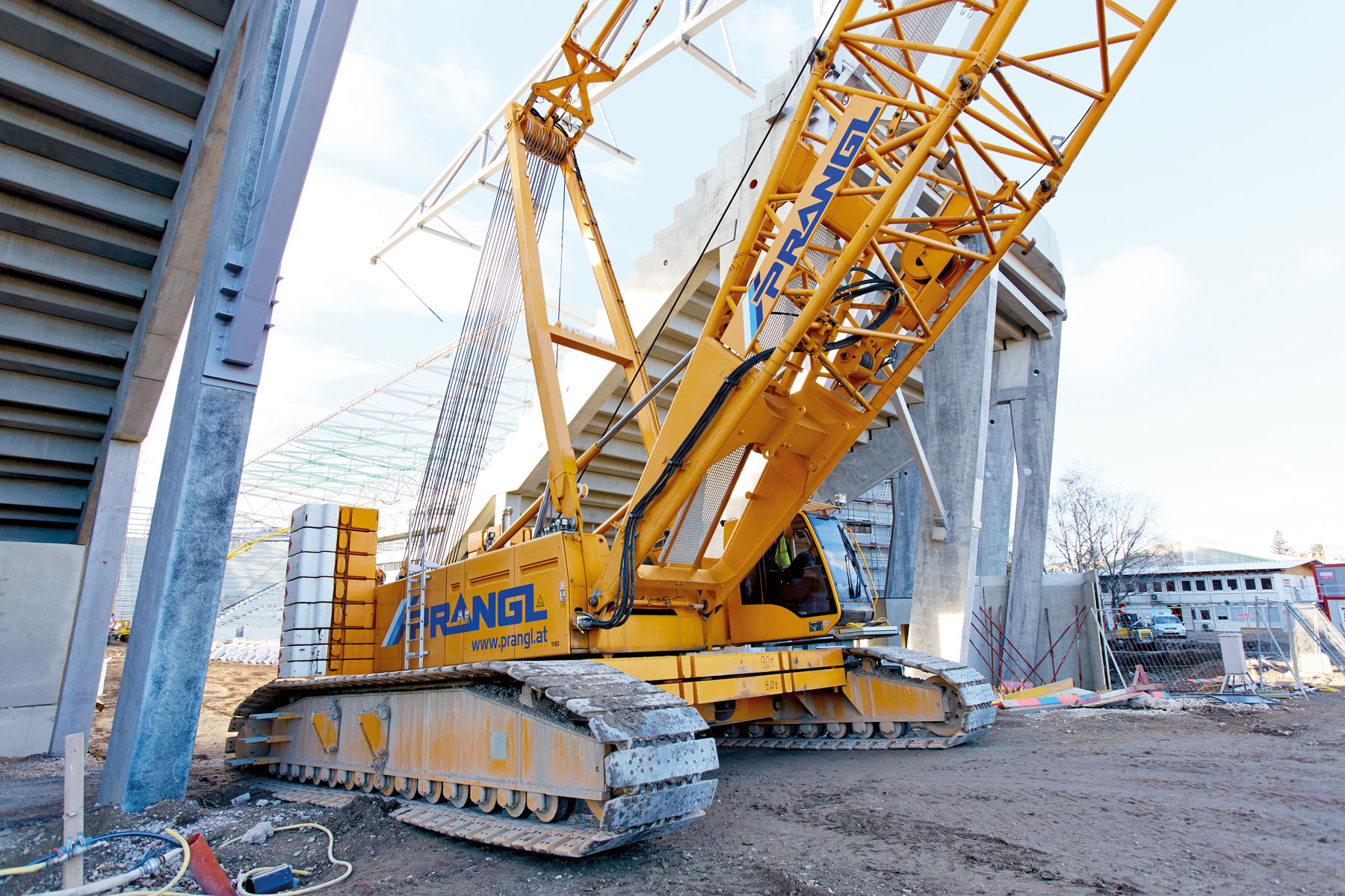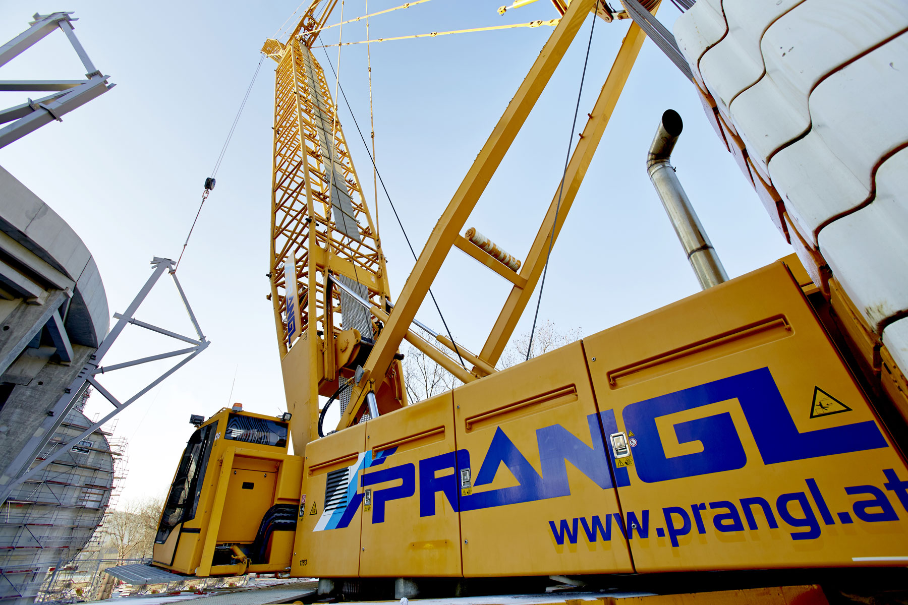 Mit einem Fassungsvermögen von 24.200 Sitzplätzen erfüllt die neue Arena des SK Rapid Wien alle UEFA-Kriterien für internationale Spiele. Prangl stellt nahezu das komplette Kran-Equipment für dieses imposante Bauwerk. Manchmal ist weniger die Kranarbeit das Spannende, sondern die Frage, wie ein großer Kran die Baustelle wieder verlassen kann …