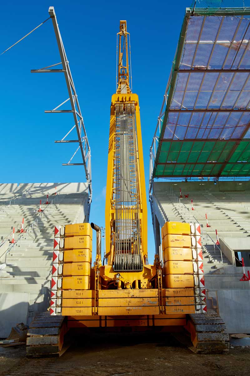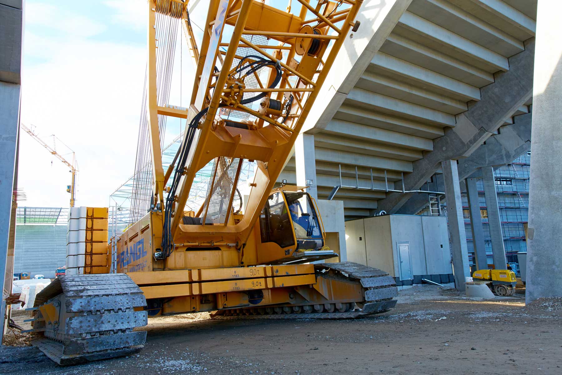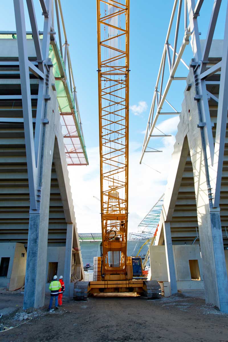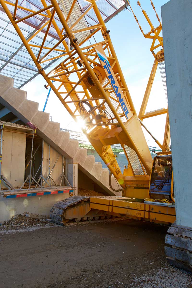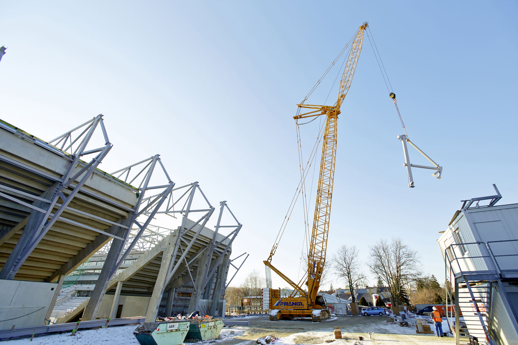 Um ein Kippen zu vermeiden, musste der Gitterausleger exakt ausbalanciert werden. Aufgrund der Steigung war es zwingend notwendig, den Raupendruck gleichmäßig auf die ganze Länge zu verteilen. Diese Aktion erforderte höchste Präzision und Fingerspitzengefühl des Kranfahrers. Außen angekommen unterstützte der 280 Tonnen Raupenkran noch bei diversen Hebearbeiten. So wurden beispielsweise die letzten schweren Stahlkonstruktionen von außen über die Hinterwand der Tribüne mit einem wippbaren Kranausleger eingehoben und montiert.