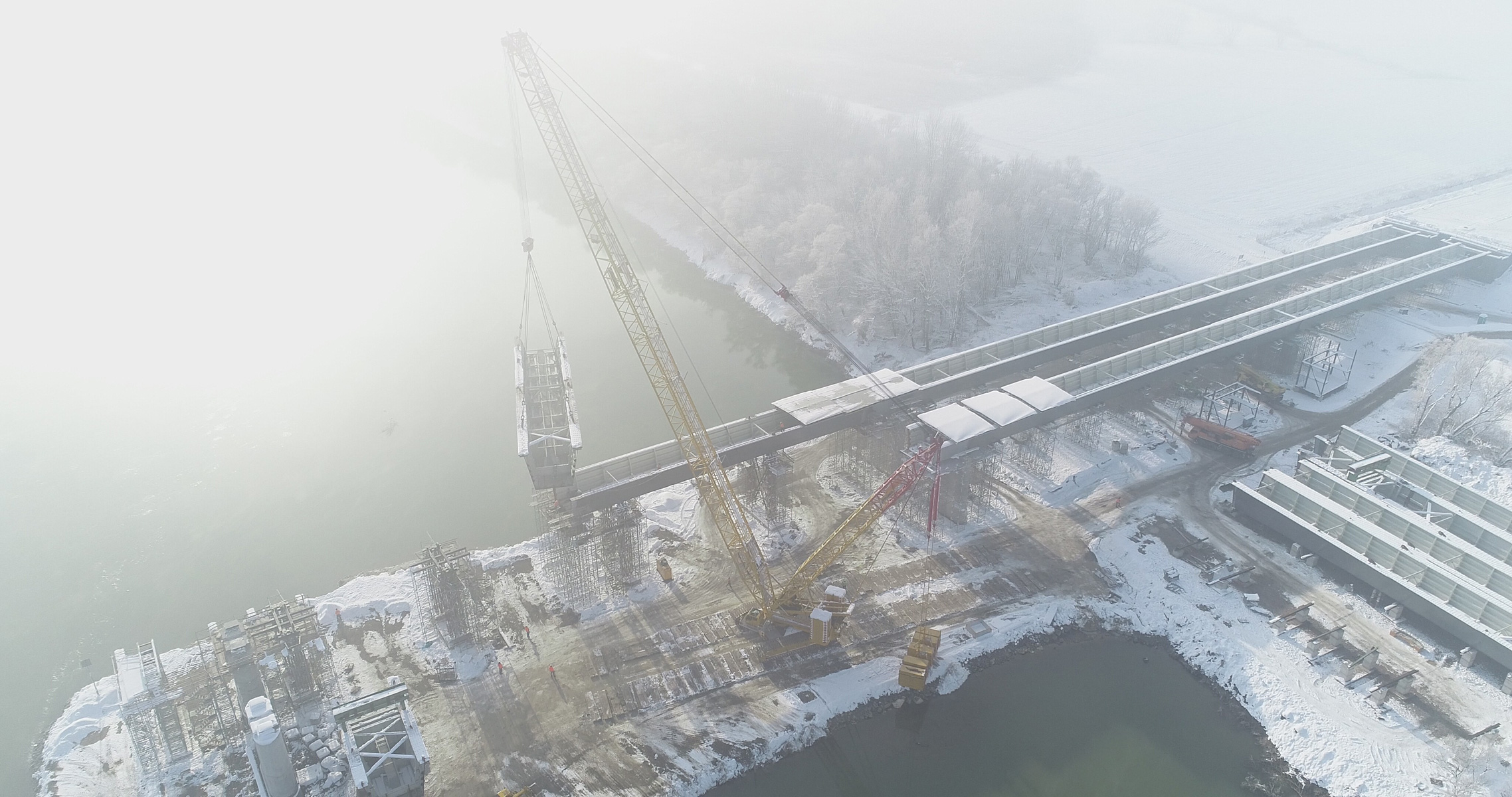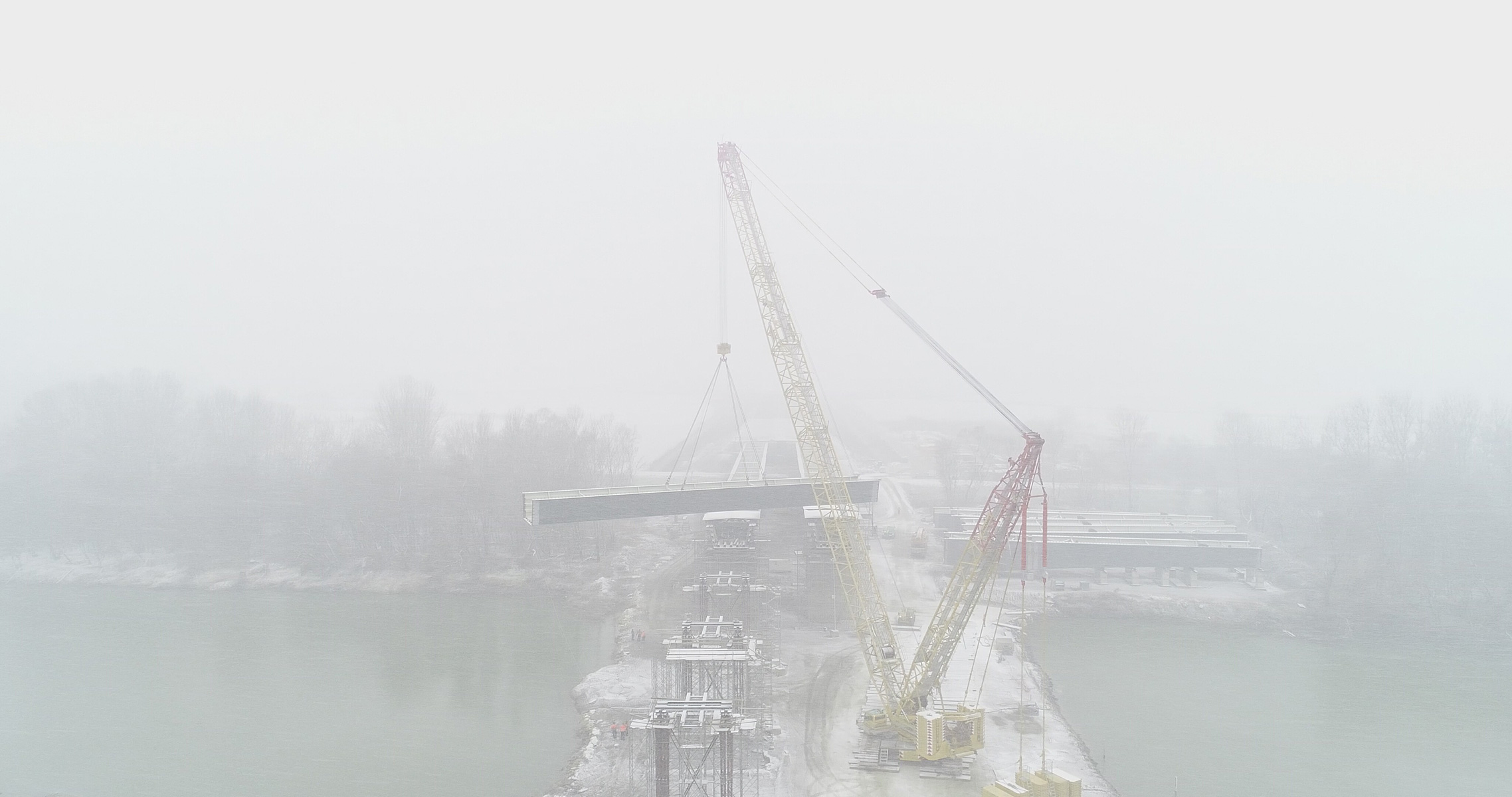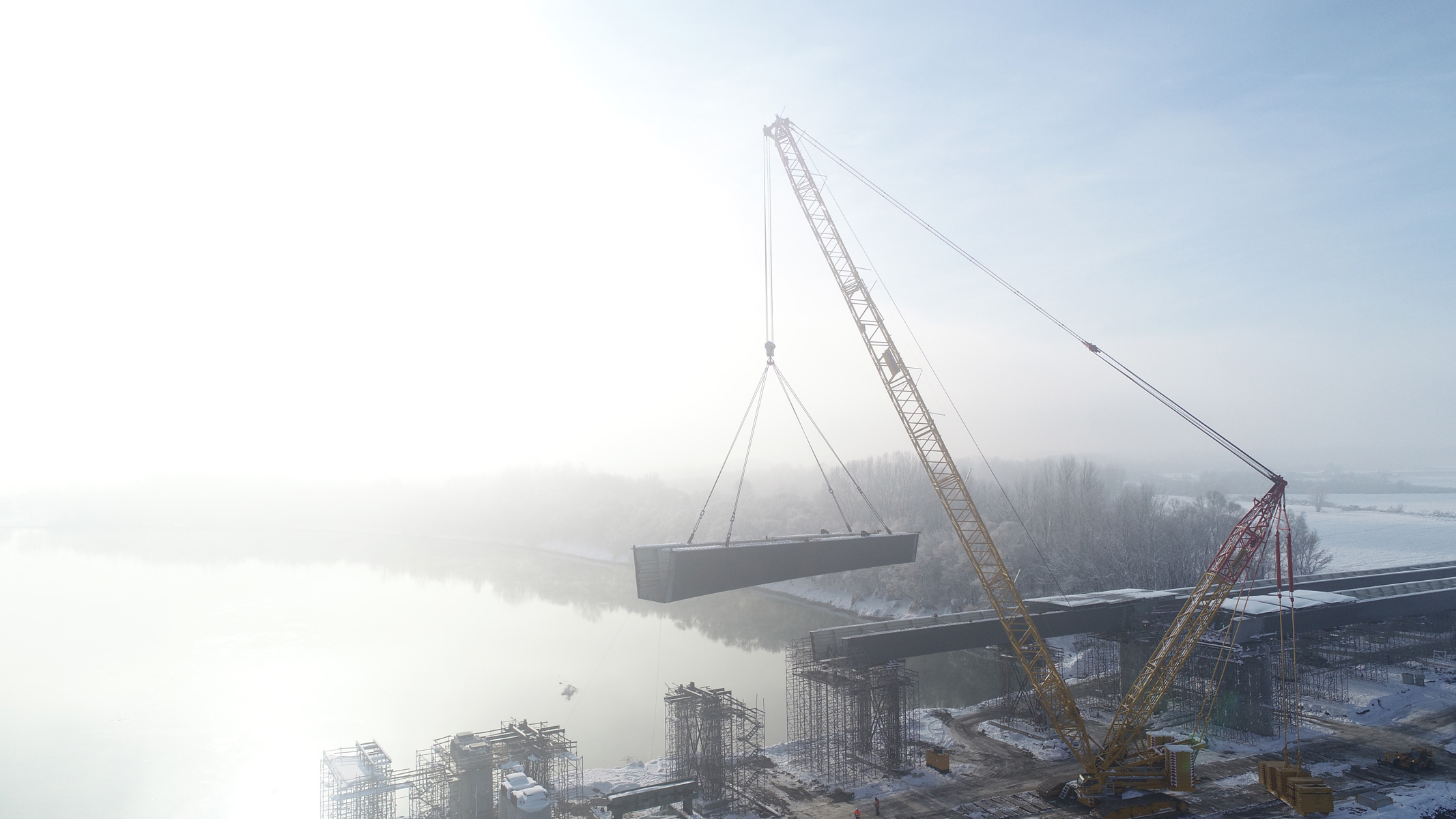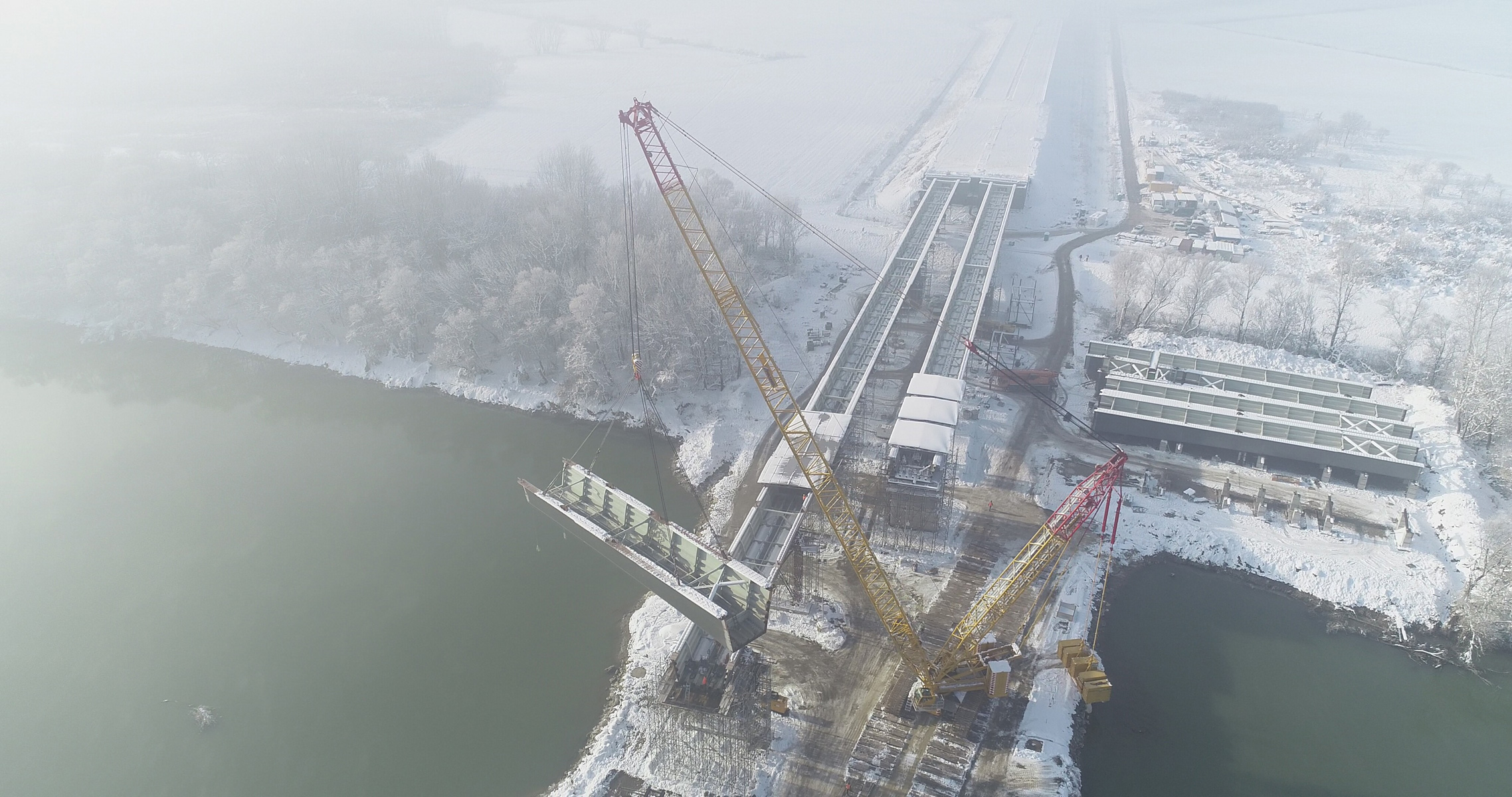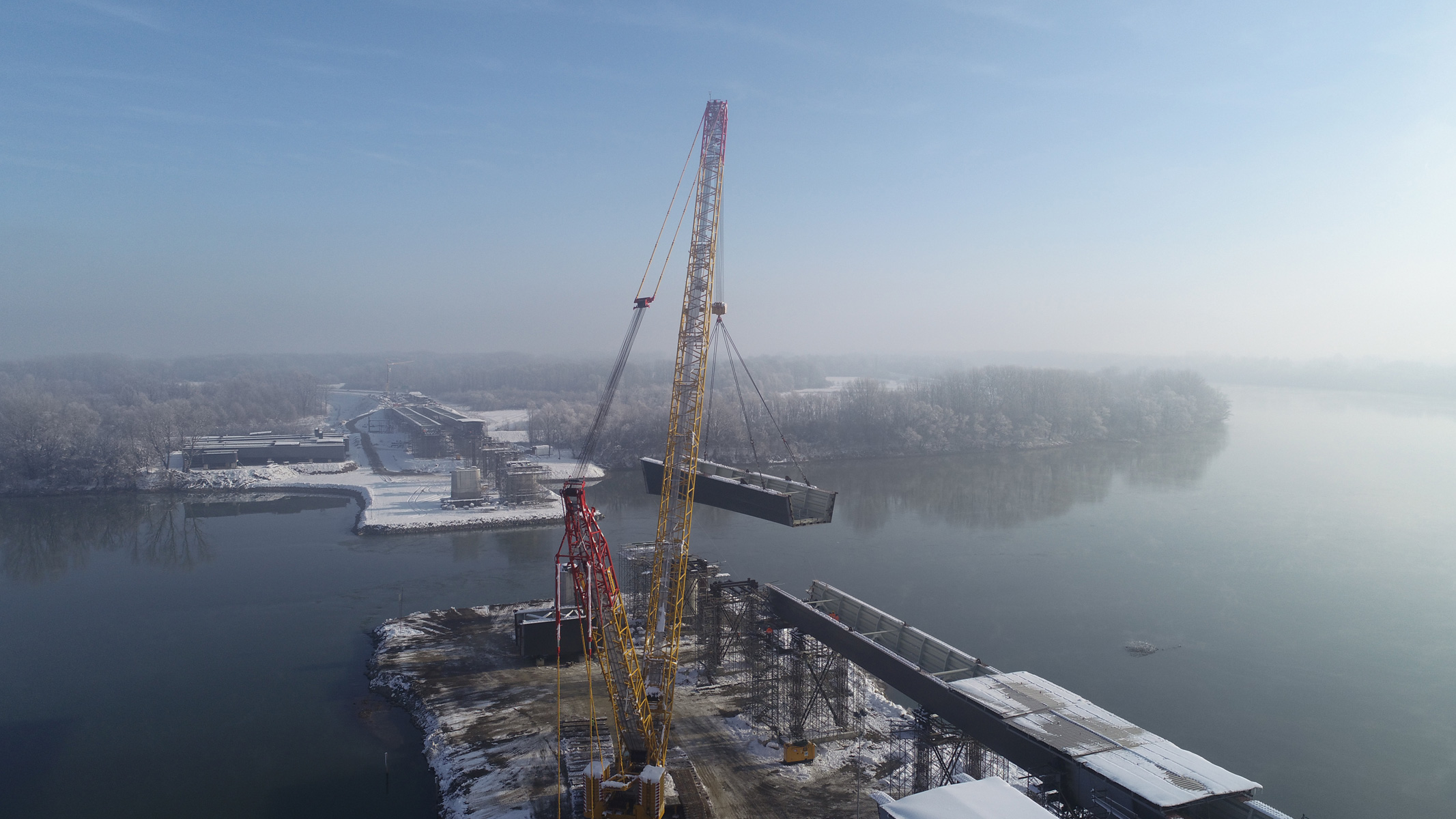 Die neue Brücke über die Sava ist die Kontaktstelle zwischen dem Autobahnnetz Kroatiens und jenem von Bosnien-Herzegowina. Am Ende wird es für jede Richtung drei Fahrspuren und je einen Schutzstreifen sowie einen Fußweg geben. Um dies zu verwirklichen, kam ein 650 Tonnen Raupenkran von Prangl zum Einsatz. Mit 50 LKWs wurden alle Krankomponenten zur Baustelle gebracht – eine logistische Meisterleistung. Im voll aufgebauten Zustand erreichte der Großkran (ohne Last) ein Gesamtgewicht von ca. 900 Tonnen.