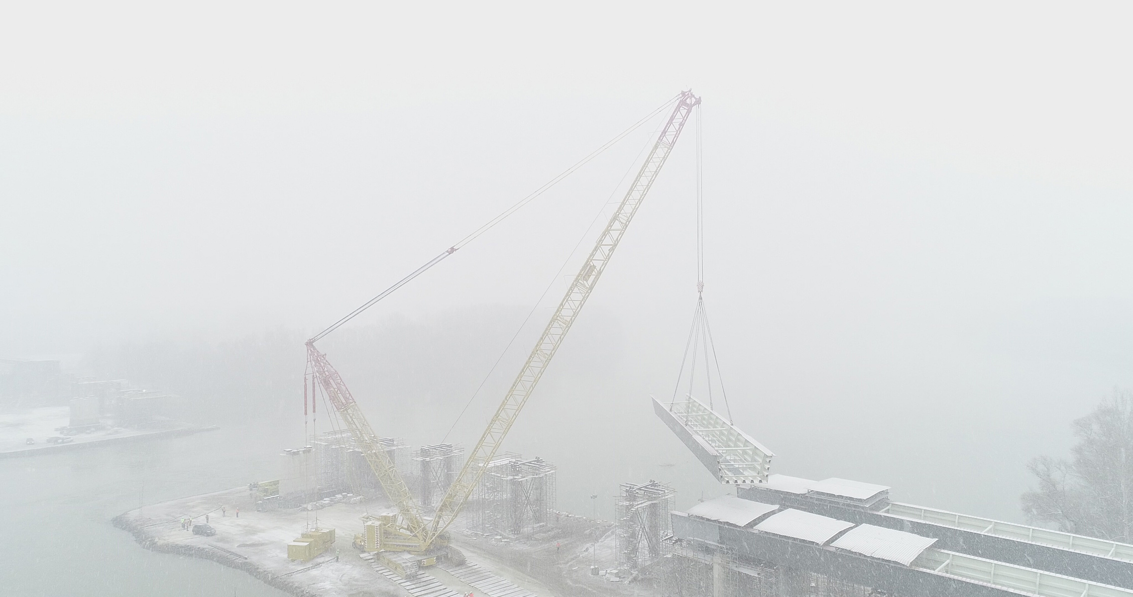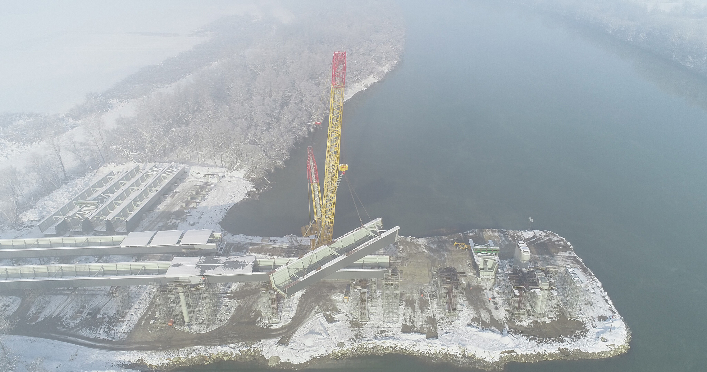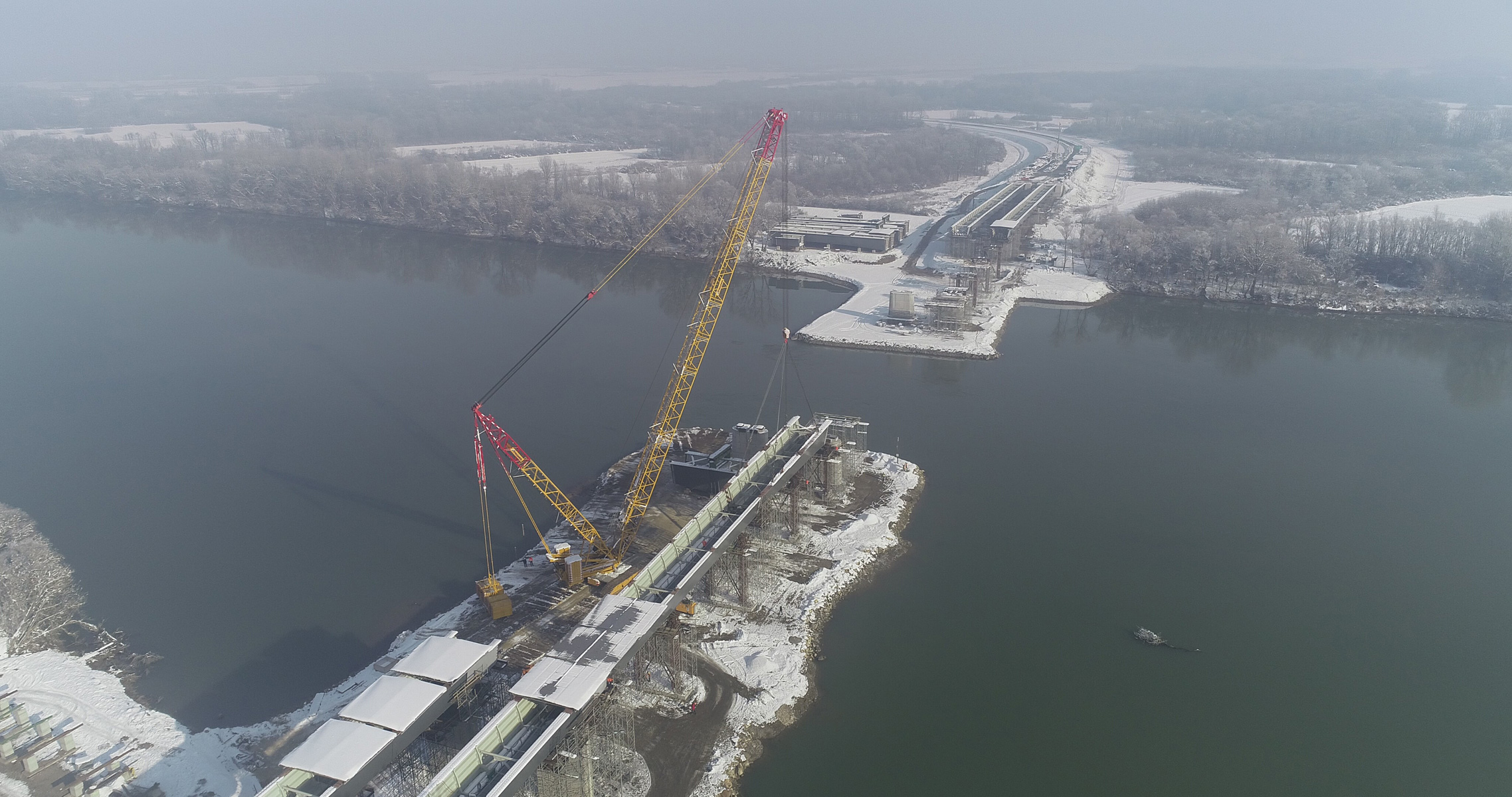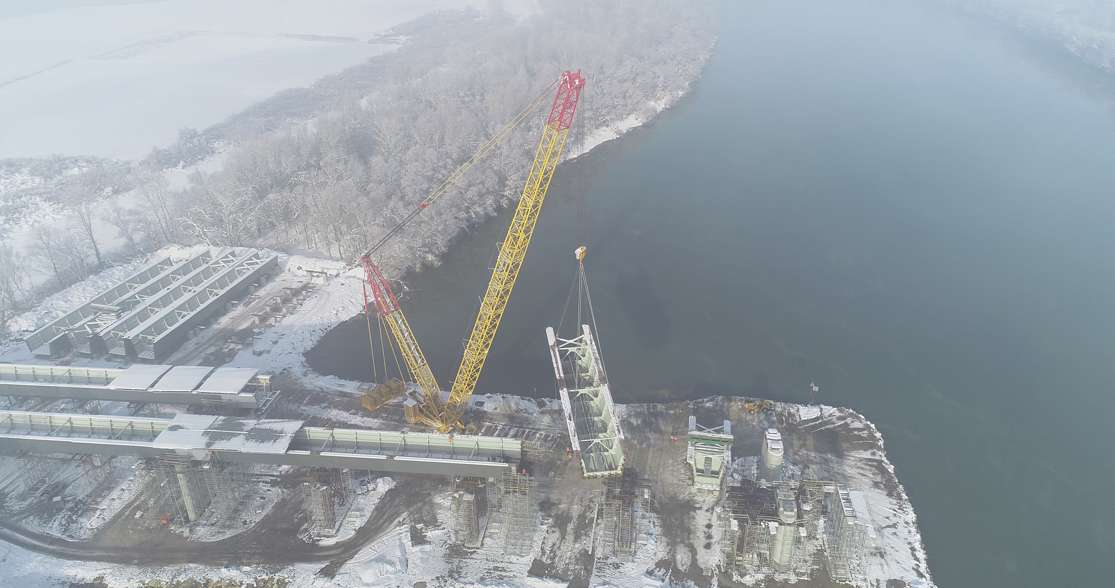 Die neue Brücke über die Sava ist die Kontaktstelle zwischen dem Autobahnnetz Kroatiens und jenem von Bosnien-Herzegowina. Am Ende wird es für jede Richtung drei Fahrspuren und je einen Schutzstreifen sowie einen Fußweg geben. Um dies zu verwirklichen, kam ein 650 Tonnen Raupenkran von Prangl zum Einsatz. Mit 50 LKWs wurden alle Krankomponenten zur Baustelle gebracht – eine logistische Meisterleistung. Im voll aufgebauten Zustand erreichte der Großkran (ohne Last) ein Gesamtgewicht von ca. 900 Tonnen.