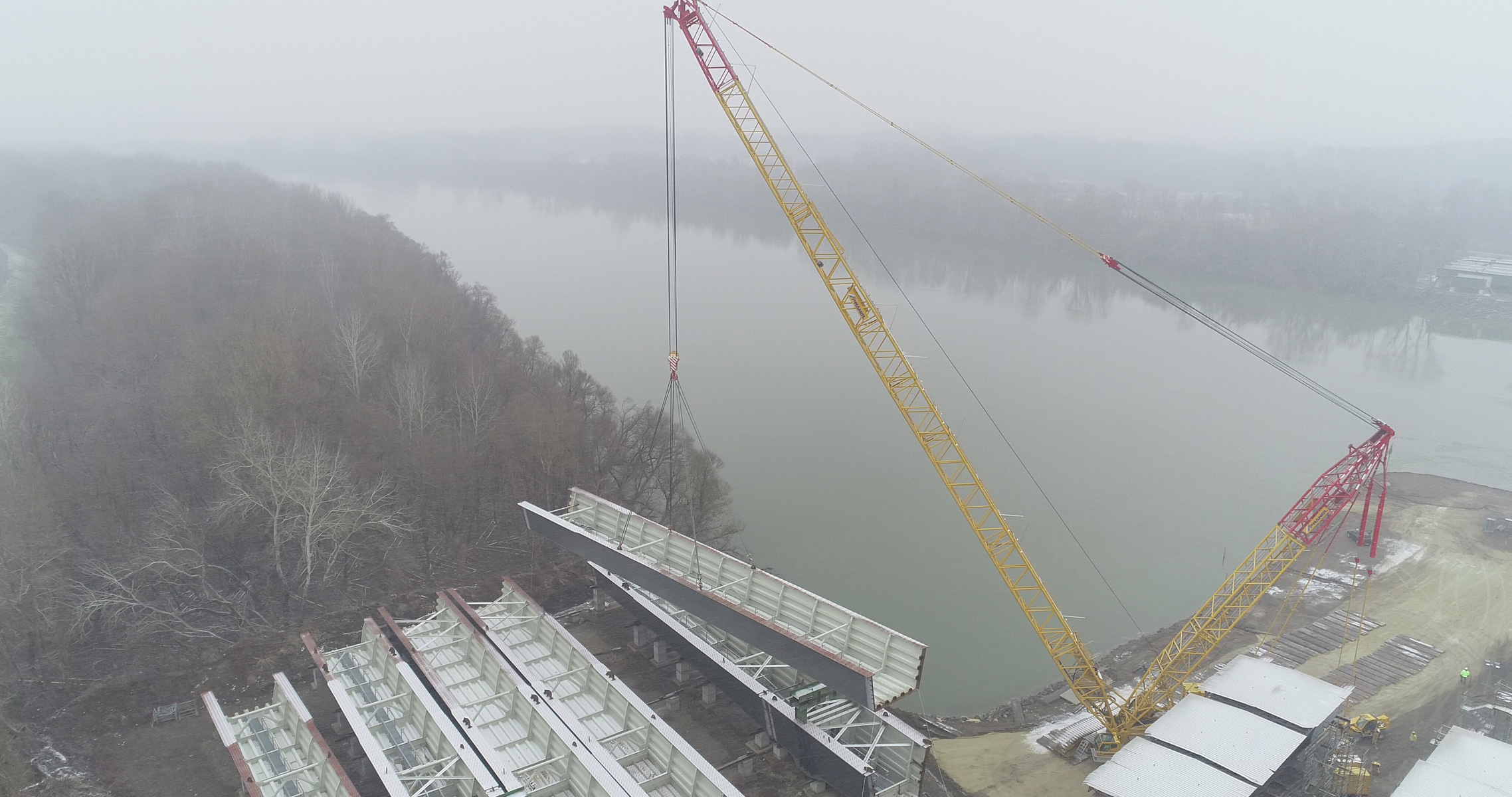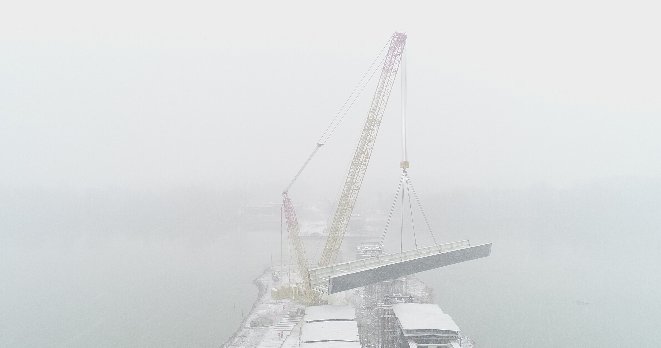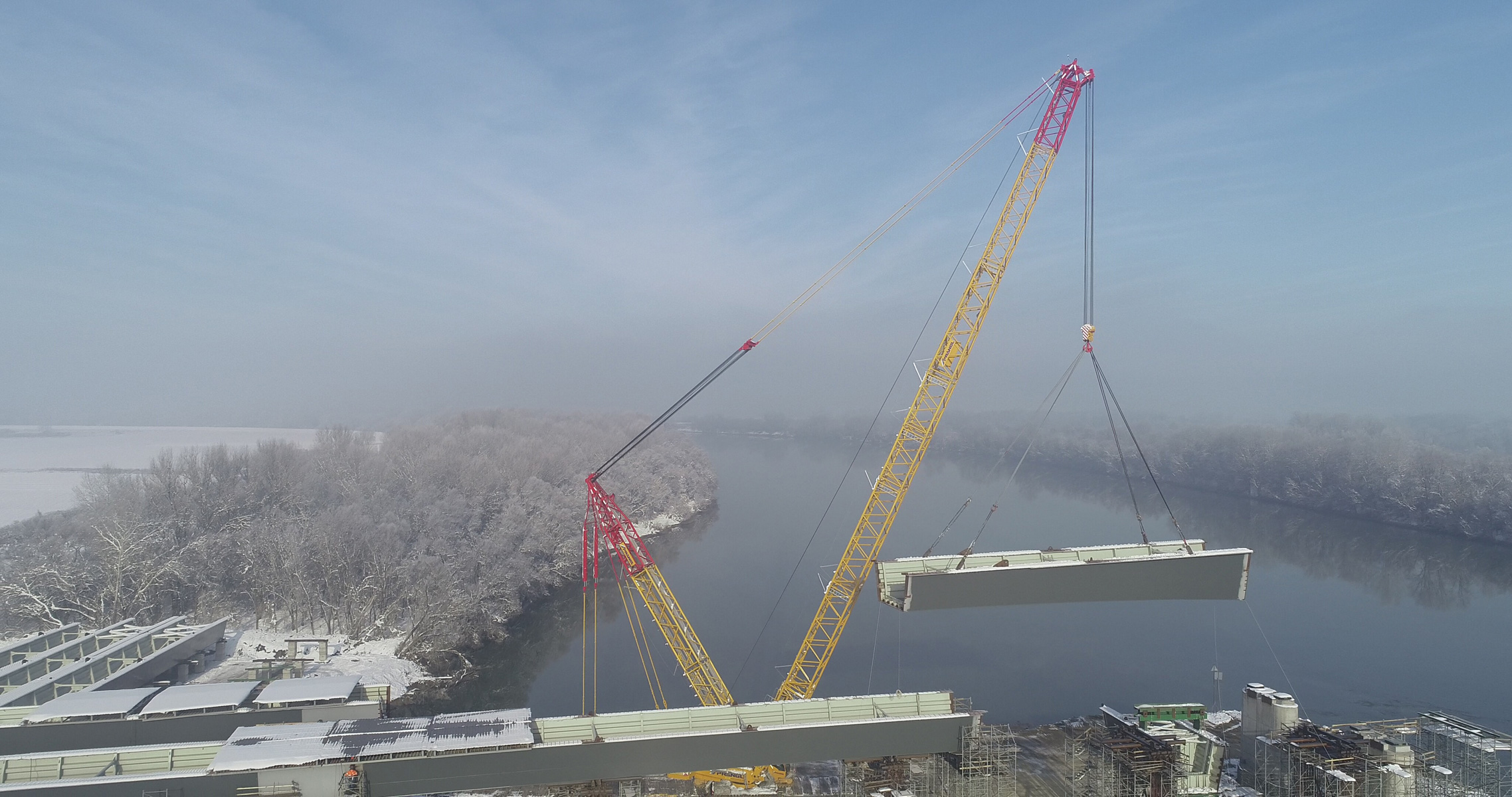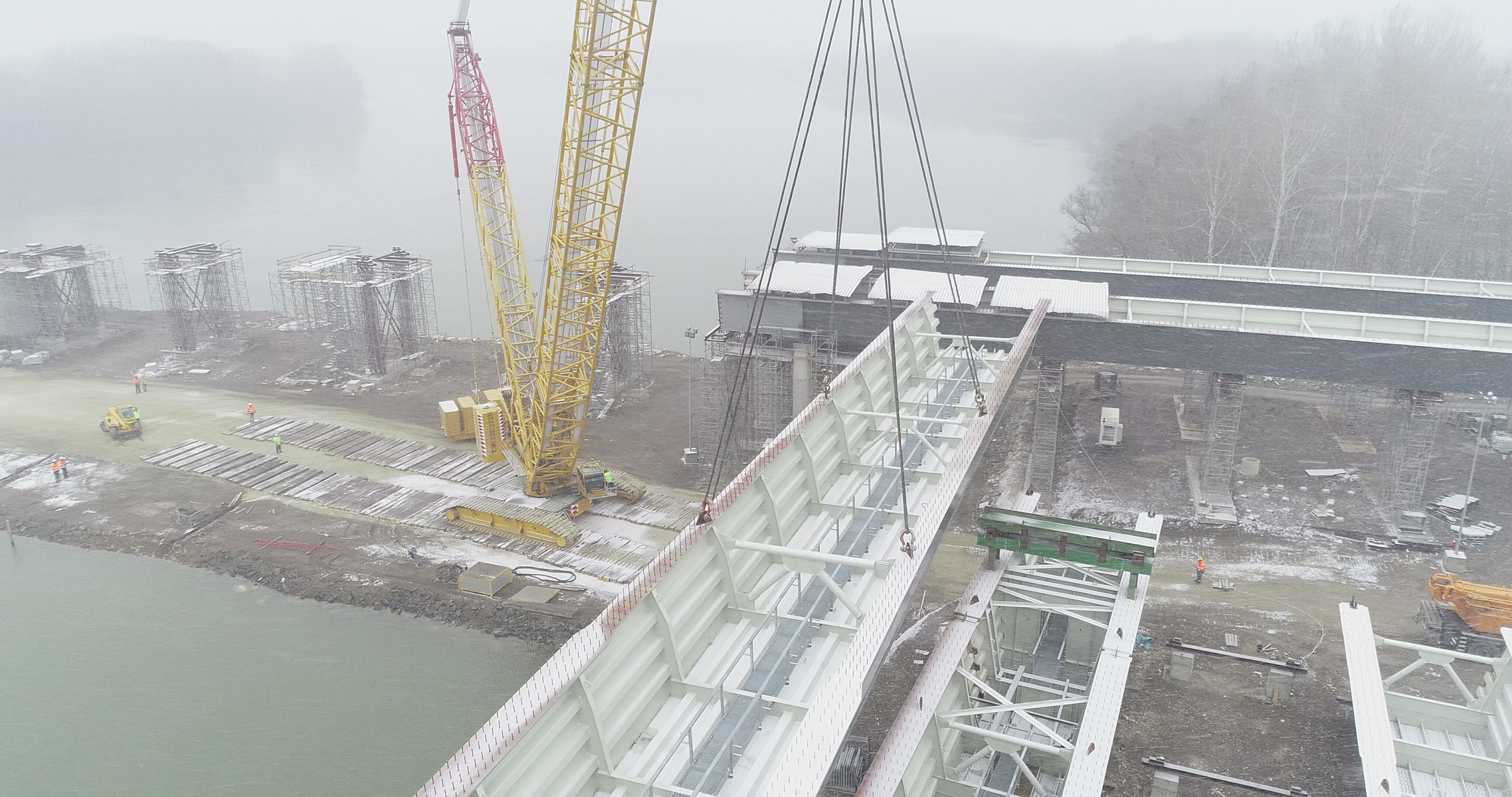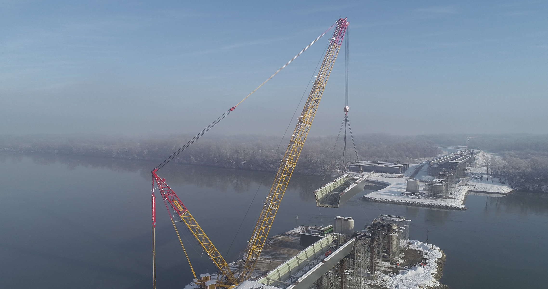 Die neue Brücke über die Sava ist die Kontaktstelle zwischen dem Autobahnnetz Kroatiens und jenem von Bosnien-Herzegowina. Am Ende wird es für jede Richtung drei Fahrspuren und je einen Schutzstreifen sowie einen Fußweg geben. Um dies zu verwirklichen, kam ein 650 Tonnen Raupenkran von Prangl zum Einsatz. Mit 50 LKWs wurden alle Krankomponenten zur Baustelle gebracht – eine logistische Meisterleistung. Im voll aufgebauten Zustand erreichte der Großkran (ohne Last) ein Gesamtgewicht von ca. 900 Tonnen.