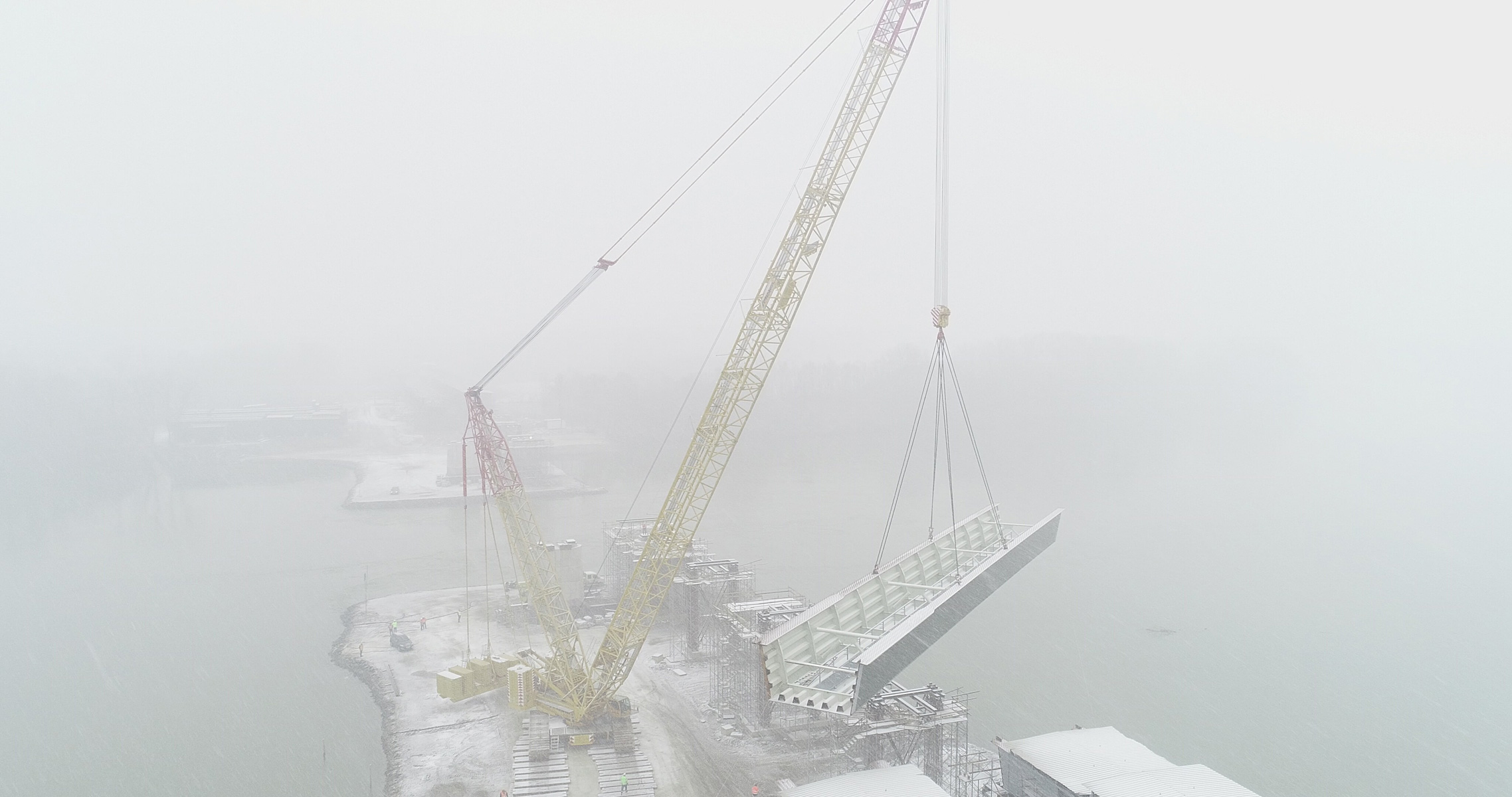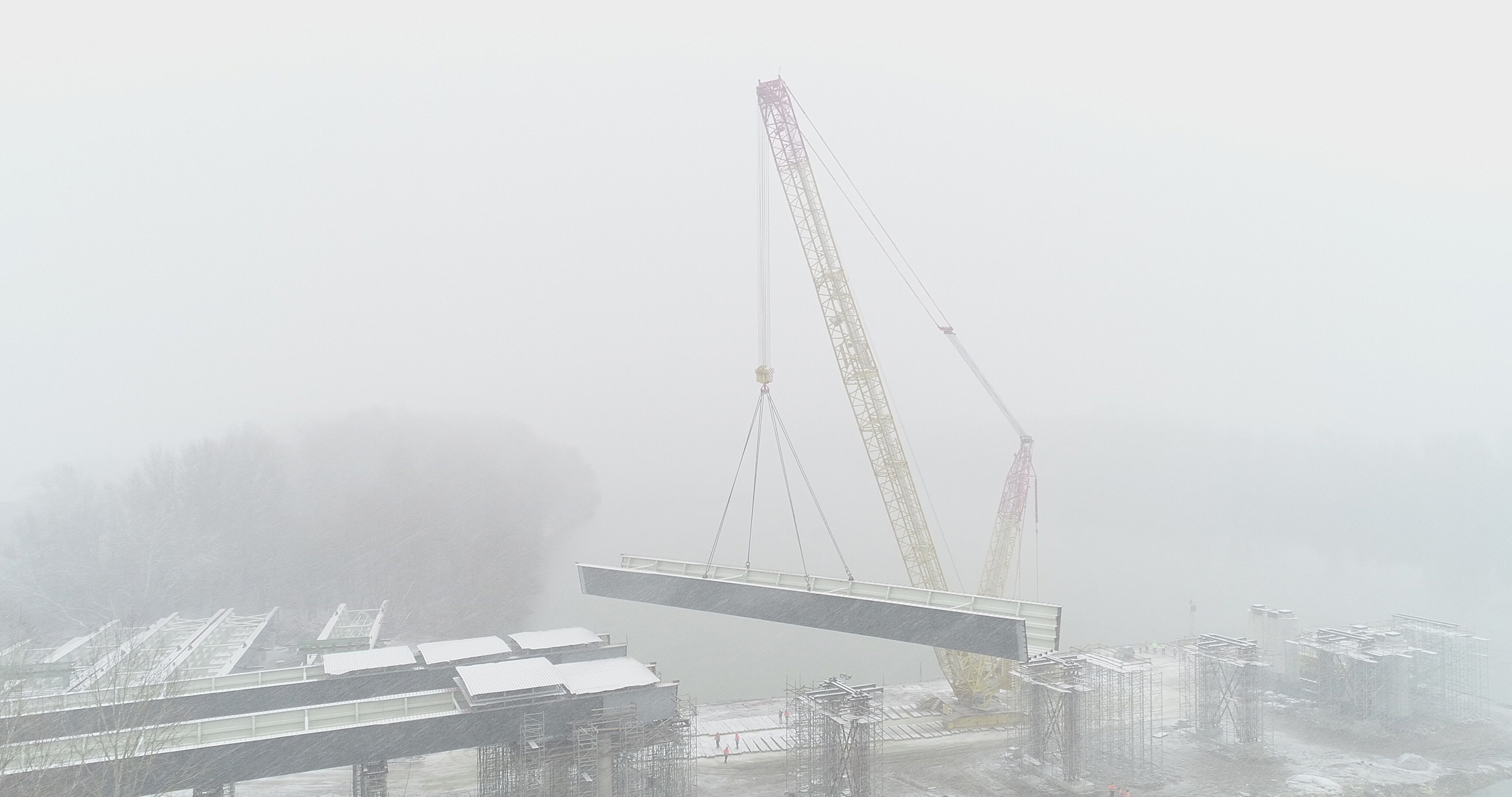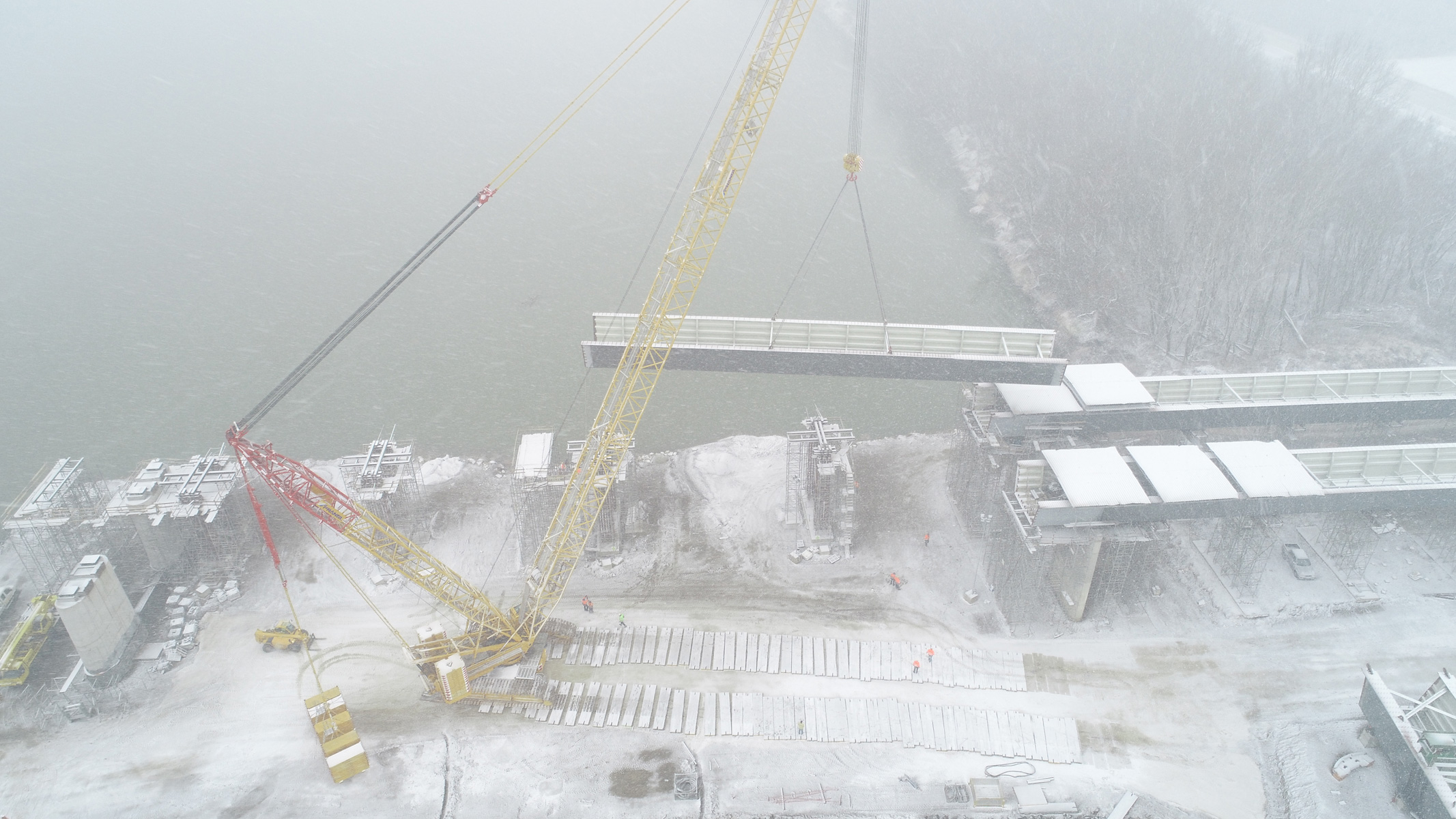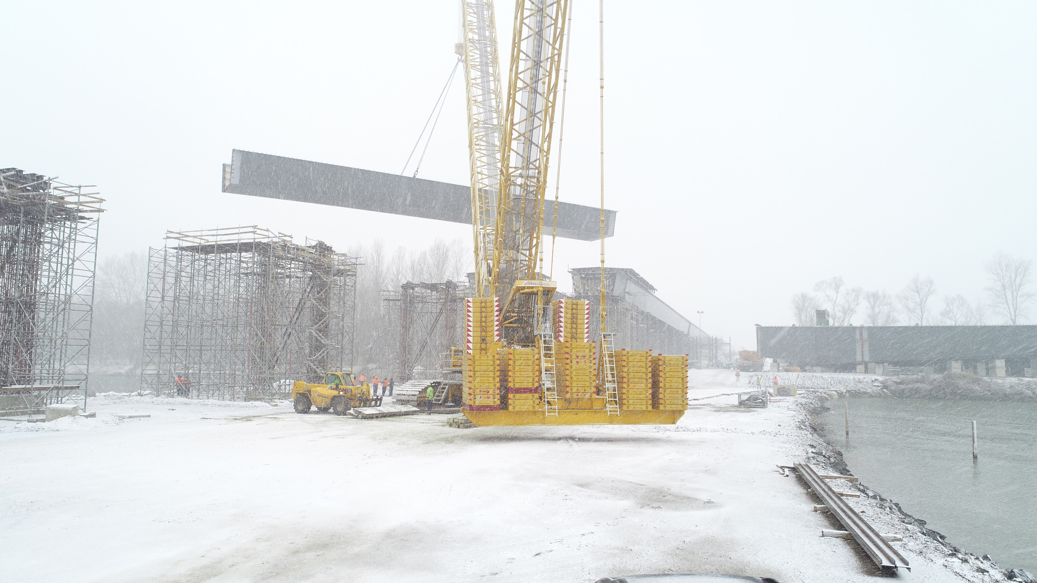 Der Lagerplatz der vorgefertigten Brückenträger lag knapp 100 Meter vom eigentlichen Versetzpunkt entfernt. Demnach musste das gelbe Monster jedes Mal mit einem Gesamtgewicht (inkl. Last) von 1.125 Tonnen verfahren werden. Zudem musste für jedes Brückenelement ein eigen geplantes und angefertigtes Gehänge zusammengebaut werden. Für alle diese Tätigkeiten war das Kran-Team vor Ort verantwortlich.