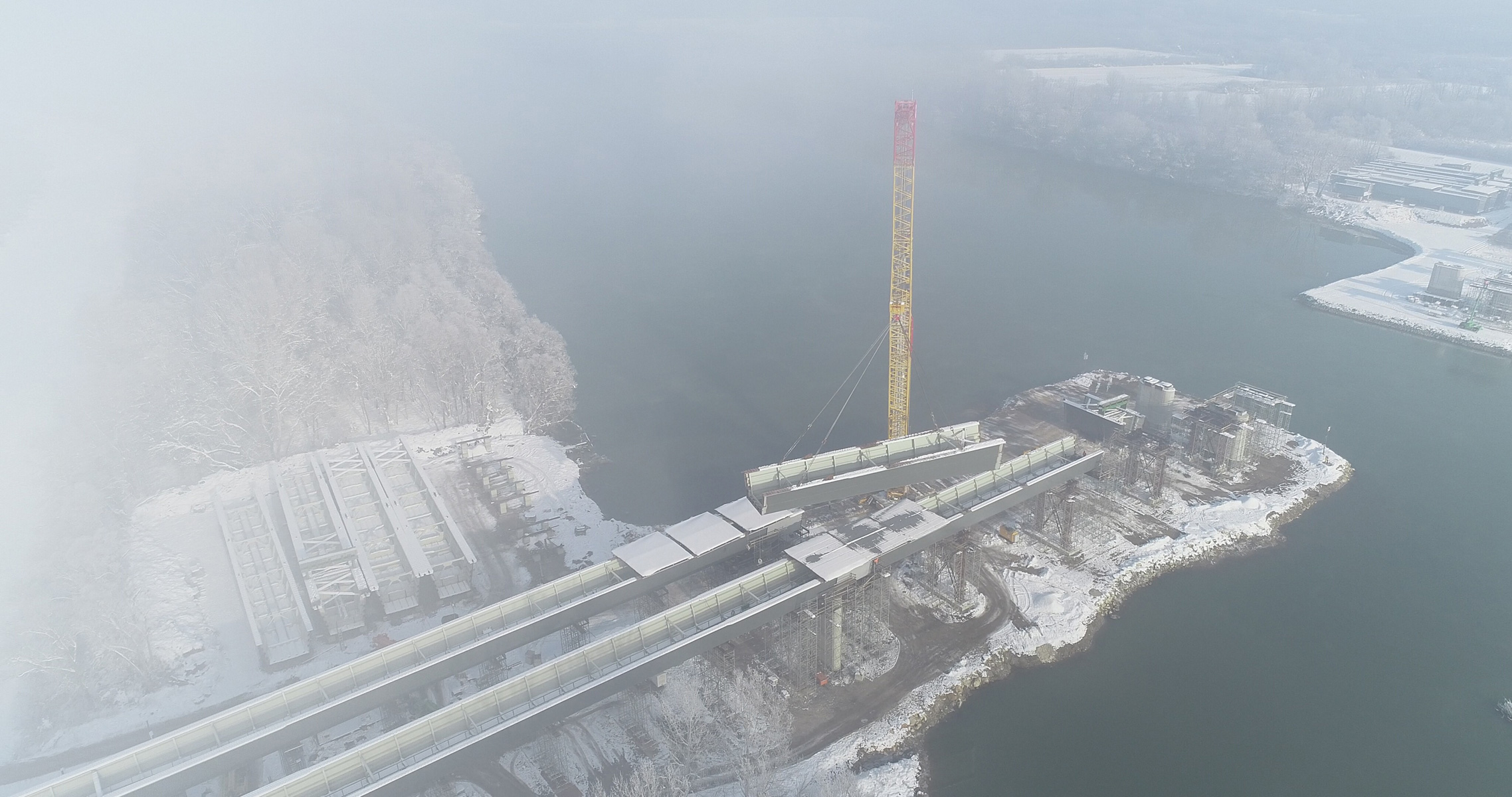 Doch mit dem Verheben alleine war es nicht getan. Der Raupenkran hob die Brückenelemente in Position, wo er sie noch einen halben bis ganzen Tag in der Luft hielt, sodass diese genau eingerichtet werden konnten. Erst danach wurde das jeweilige Brückensegment unterstellt und endgültig verschweißt. Das internationale Team hat sich bei allen Arbeitsschritten bestens bewährt. Bereits in der Planungsphase arbeiteten die Kollegen aus Slowenien, Kroatien und Österreich perfekt zusammen. Einmal mehr zeigte sich, dass Prangl in allen Destinationen seine international bekannte Dienstleistungsqualität erbringen kann.