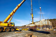 Die beiden exakt ausgerichteten Krane übernahmen die Last gemeinsam und hoben sie vorsichtig im Tandemhub auf den vorbereiteten Abladeplatz. Nach und nach wurden alle Teile übernommen und abgelegt. Manche davon mussten erst zwischengelagert und danach umgehängt werden, um sie in der passenden Ausrichtung absetzen zu können. Schließlich musste der verfügbare Platz am Abladeort optimal verwaltet werden. Vor allem auch, als die Schwertransporter die Schiffsteile übernahmen. Dazu wurde Last nach Last im Tandemhub hoch gehoben und der Transporter direkt darunter positioniert.