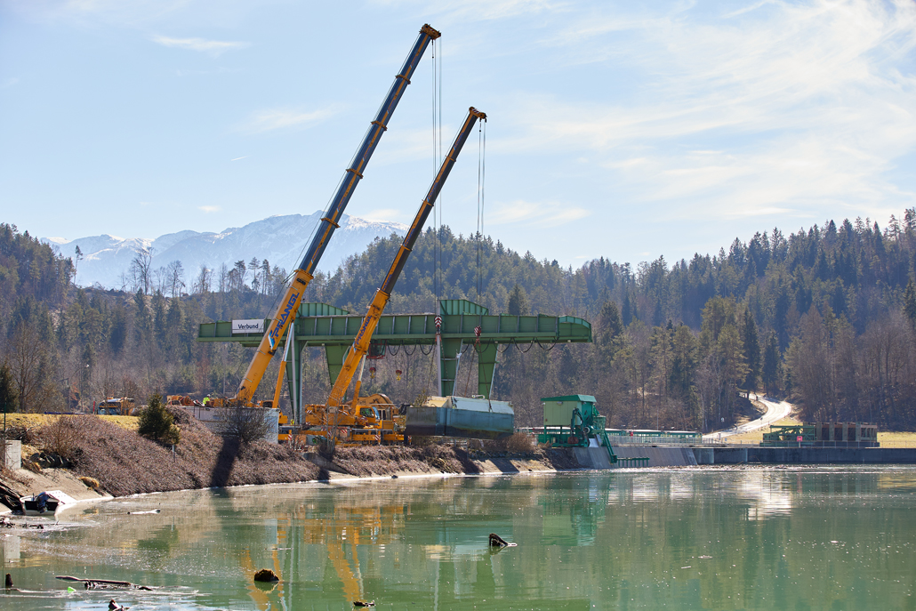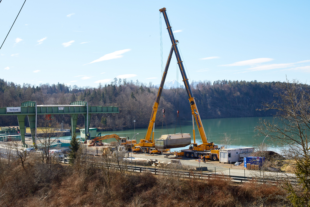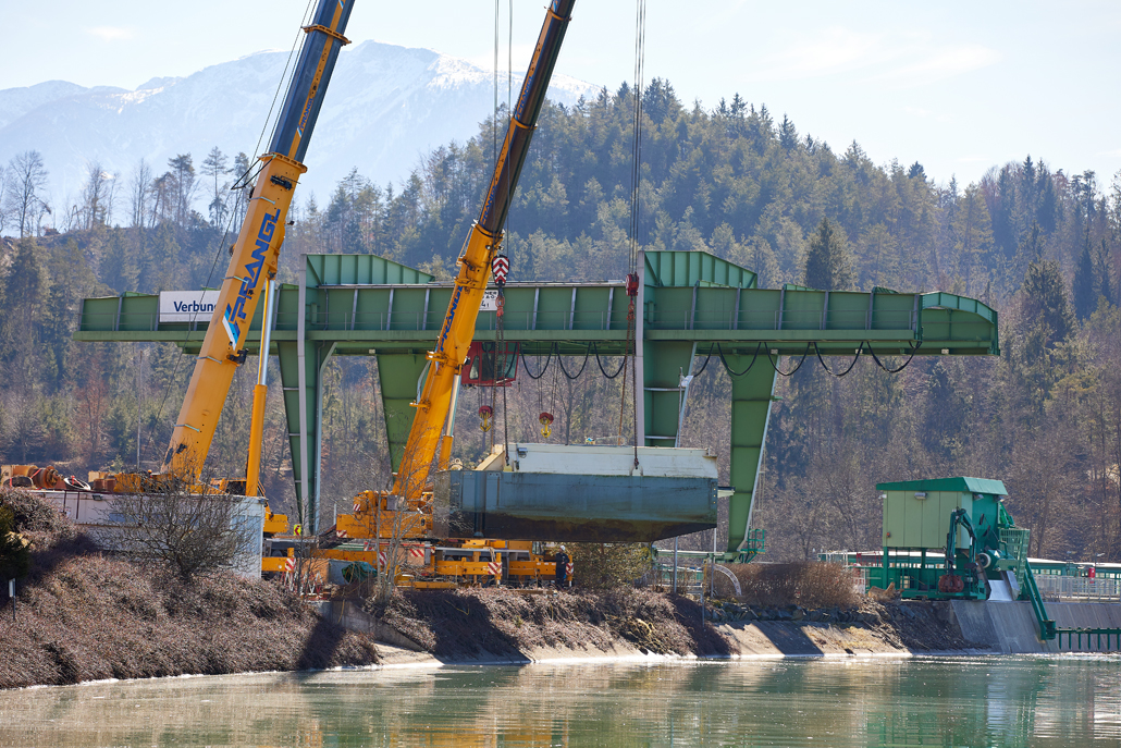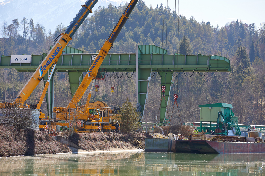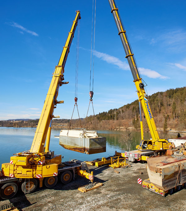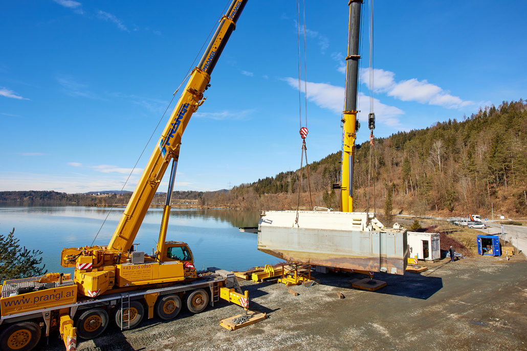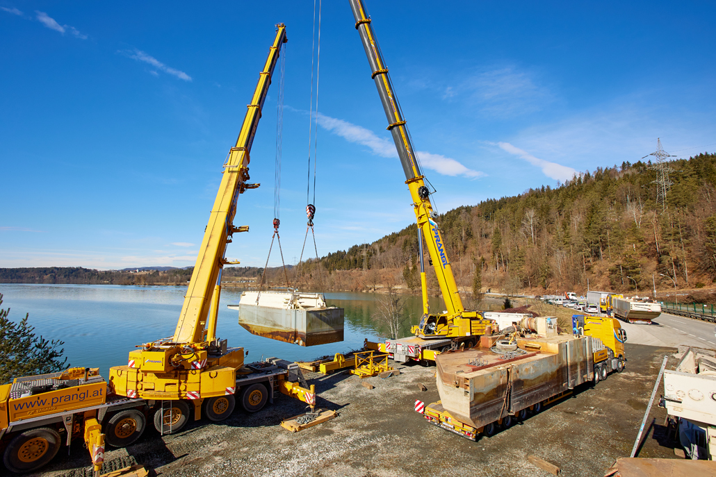 Die Schiffe haben die nächsten vier Jahre die Aufgabe, rund 400.000 bis 500.000 Kubikmeter Geschiebematerial beim Verbund-Kraftwerk Oberaudorf-Ebbs am Inn in der Nähe von Kufstein auszubaggern. Für den Transport nach Tirol mussten die Schuten in jeweils vier Teile mit je 40 Tonnen und einer Länge von je 22 Meter zerlegt und danach auf Schwertransporter verladen werden. Dann war es in Edling so weit: An einer geeigneten Stelle am Völkermarkter Stausee wurden ein 130 Tonnen Teleskopkran und ein 220 Tonnen Teleskopkran positioniert. Die Schuten-Komponenten kamen per Lastschiff dazu.