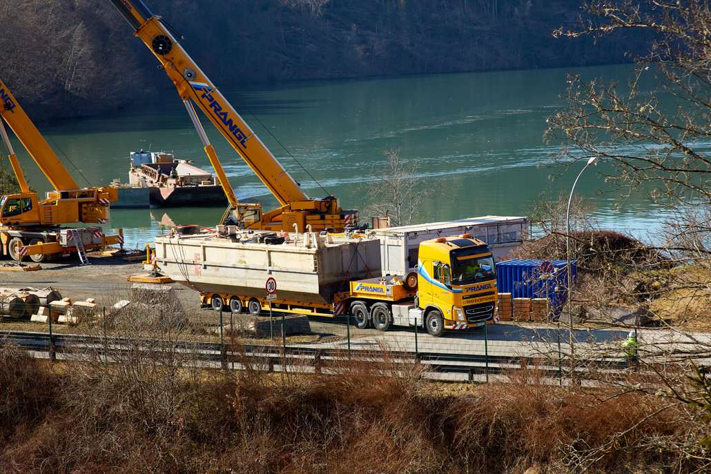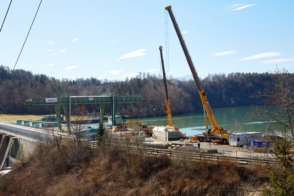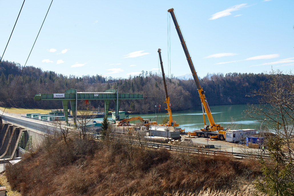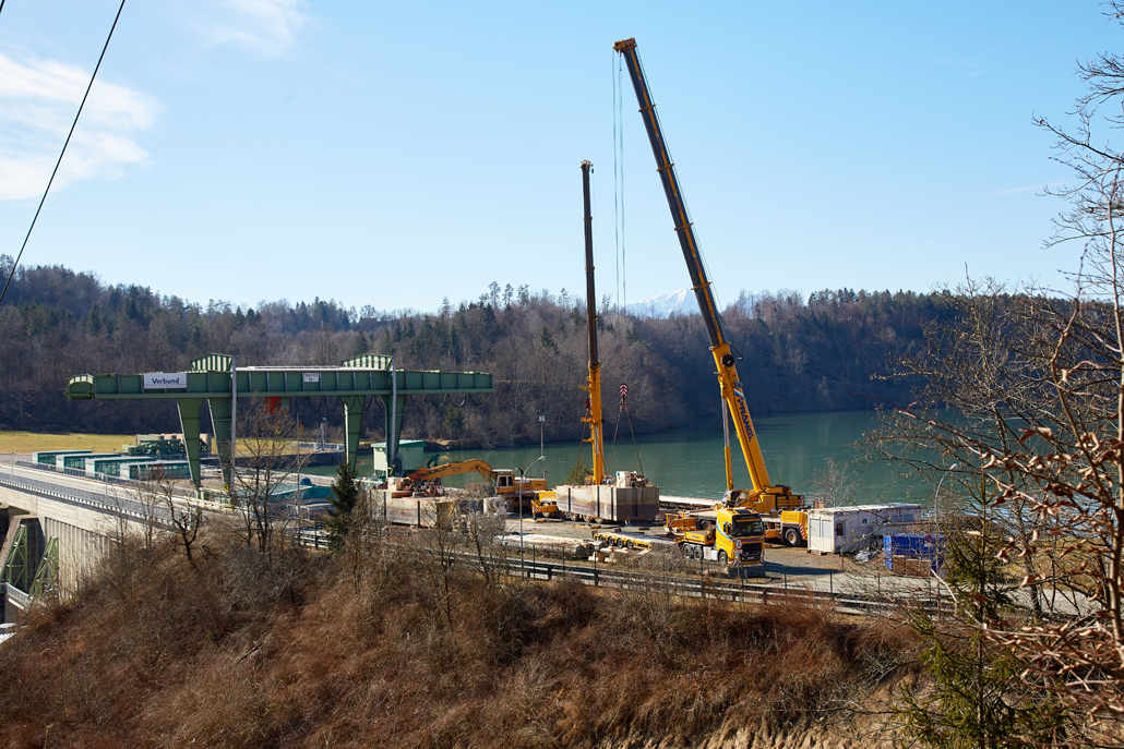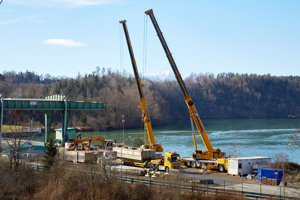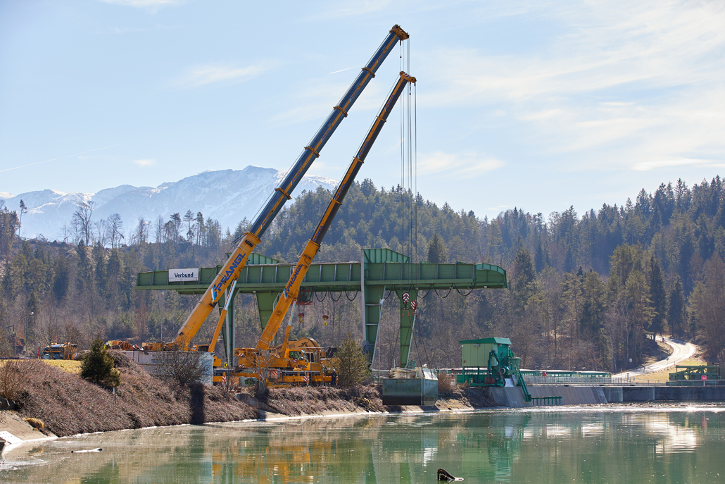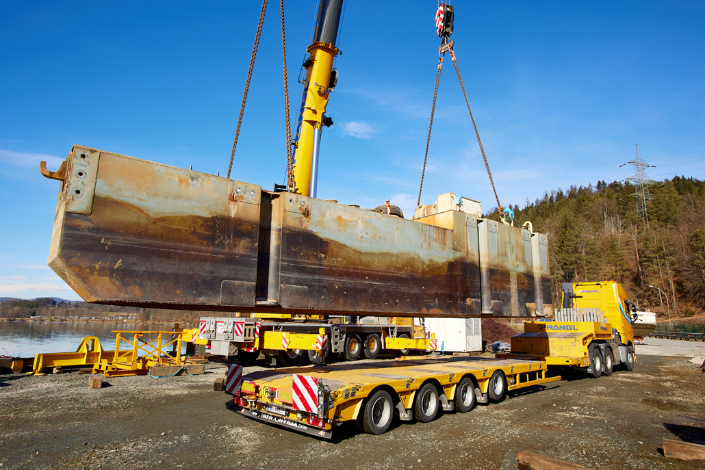 Die Schiffe haben die nächsten vier Jahre die Aufgabe, rund 400.000 bis 500.000 Kubikmeter Geschiebematerial beim Verbund-Kraftwerk Oberaudorf-Ebbs am Inn in der Nähe von Kufstein auszubaggern. Für den Transport nach Tirol mussten die Schuten in jeweils vier Teile mit je 40 Tonnen und einer Länge von je 22 Meter zerlegt und danach auf Schwertransporter verladen werden. Dann war es in Edling so weit: An einer geeigneten Stelle am Völkermarkter Stausee wurden ein 130 Tonnen Teleskopkran und ein 220 Tonnen Teleskopkran positioniert. Die Schuten-Komponenten kamen per Lastschiff dazu.