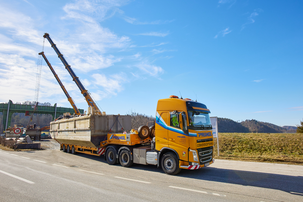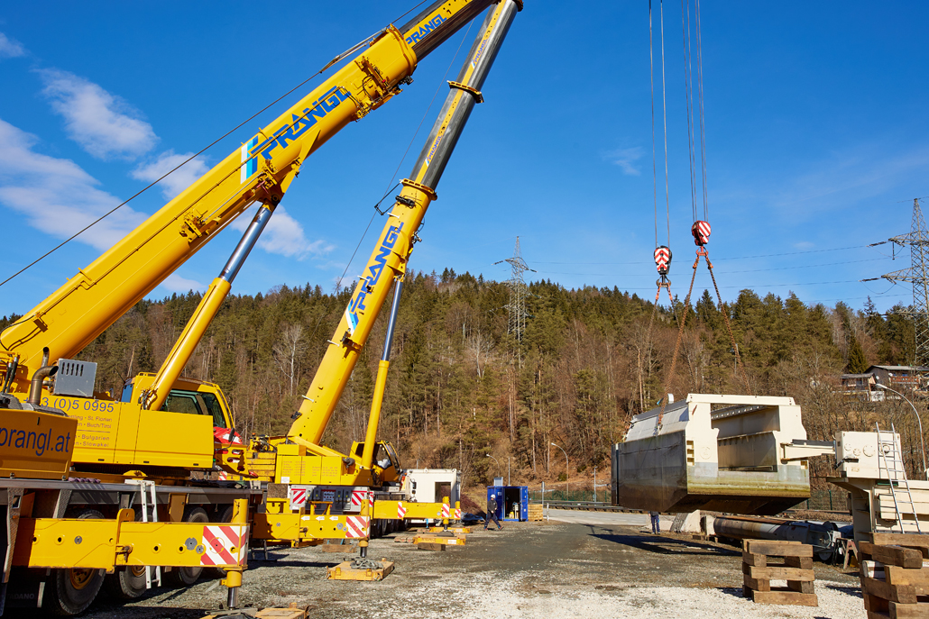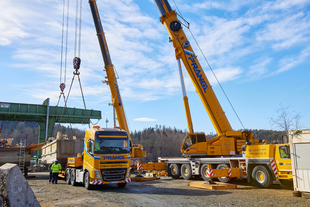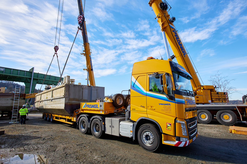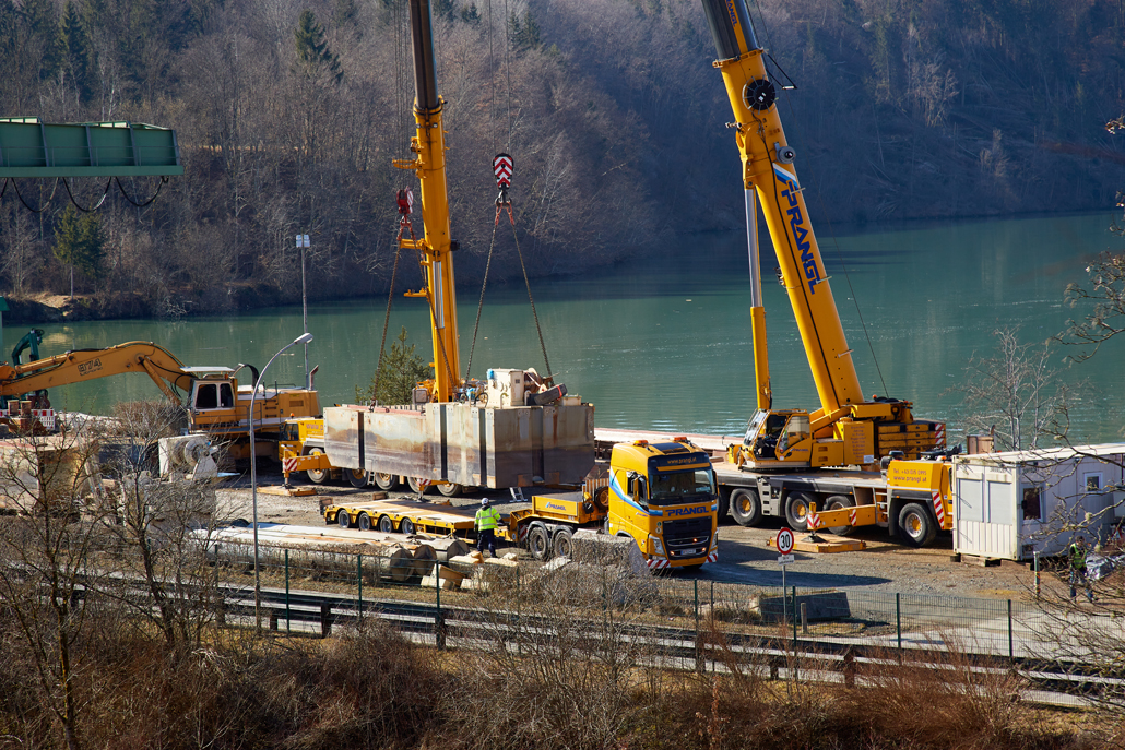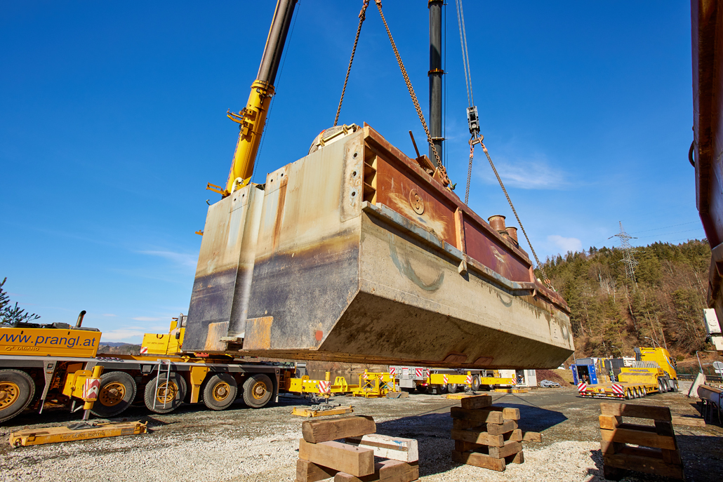 Nachdem die Mobilkrane die Teile langsam abgesetzt hatten, wurden sie gesichert und für den Transport vorbereitet. Die Strecke nach Tirol wurde natürlich im Vorfeld sorgfältig geprüft und man musste lange Umwege über Bayern in Kauf nehmen. Die Schiffsteile aus Edling landeten ebenso wie jene aus St. Jakob im Rosental wohl behalten in Tirol. Am Abladeort in Kufstein – der vorab erst nach Absprache mit dem Prangl-Team hergestellt und auf seine Tauglichkeit geprüft wurde – wurden die Schiffsteile von einem 250 Tonnen Teleskopkran und einem 160 Tonnen Teleskopkran erwartet und abgeladen.