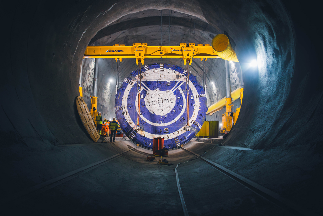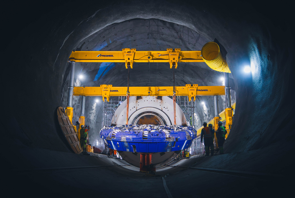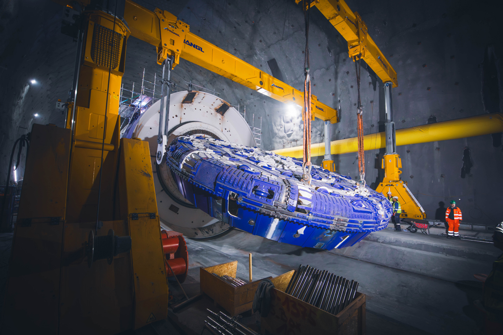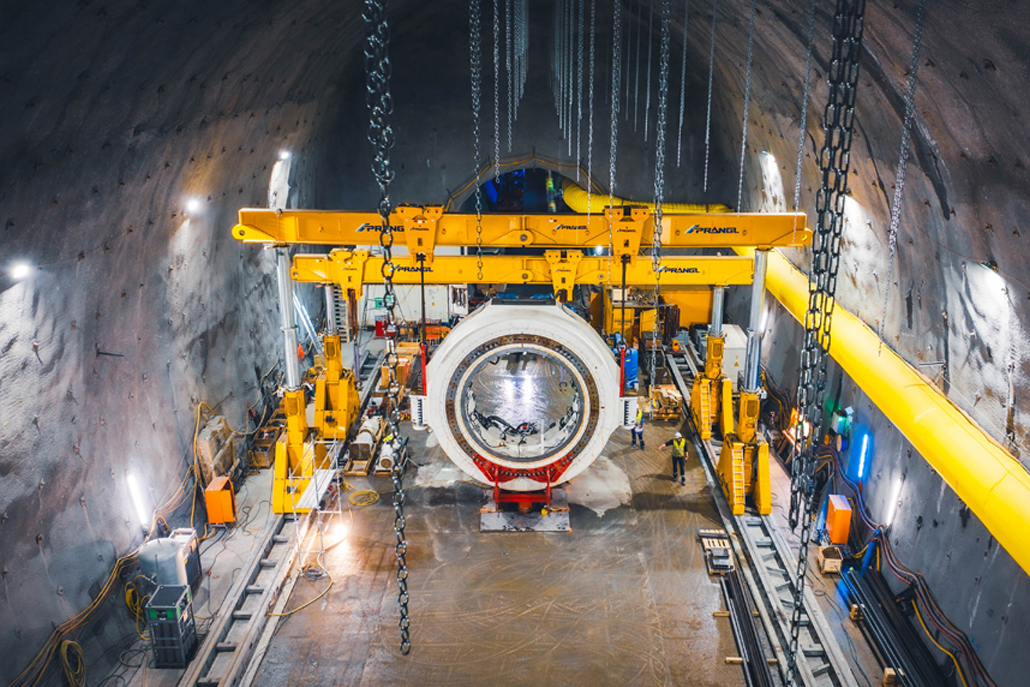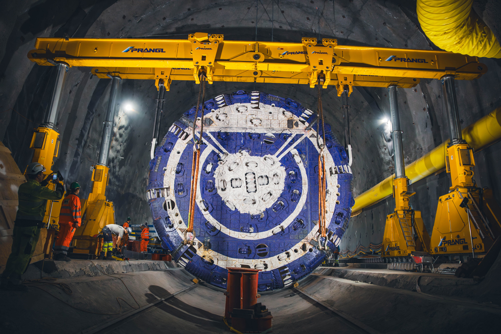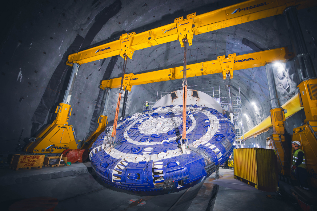 Der Aufbau des Hubportales startete am 25. März 2024 – rund vier Kilometer tief im Berg. Ab 02. April 2024 begann die Montage der Tunnelbohrmaschine, die in Kleinteilen (Maximalgewicht 90 Tonnen) in die Montagekaverne angeliefert wurde. Die wichtigsten Komponenten waren dabei der Hauptantrieb inklusive Schneiderad. Die größte Herausforderung stellte das Aufdrehen des Schneiderades mit einem Durchmesser von 10,6 Meter dar, welches nach dem Zusammenbau 269 Tonnen auf die Waage brachte. Mit höchster Konzentration konnte diese Aufgabe ohne Zwischenfälle bewältigt werden – ebenso wie das Aufdrehen des Antriebs mit einem Gewicht von 234 Tonnen.