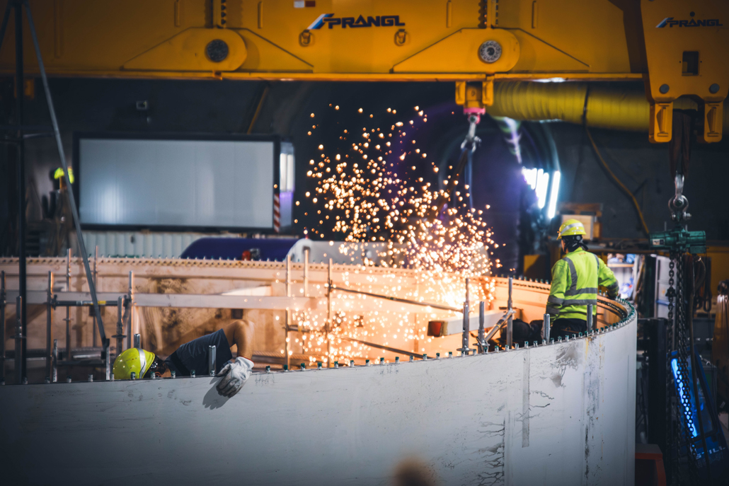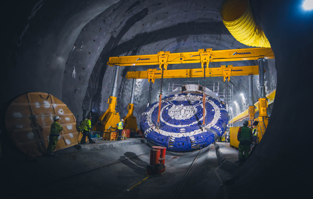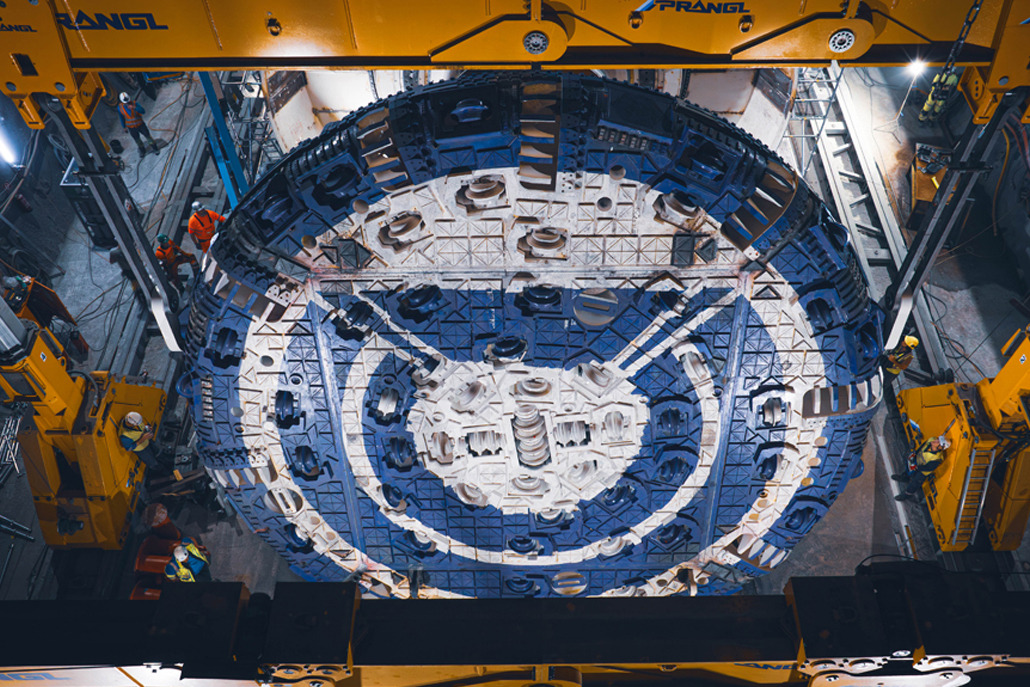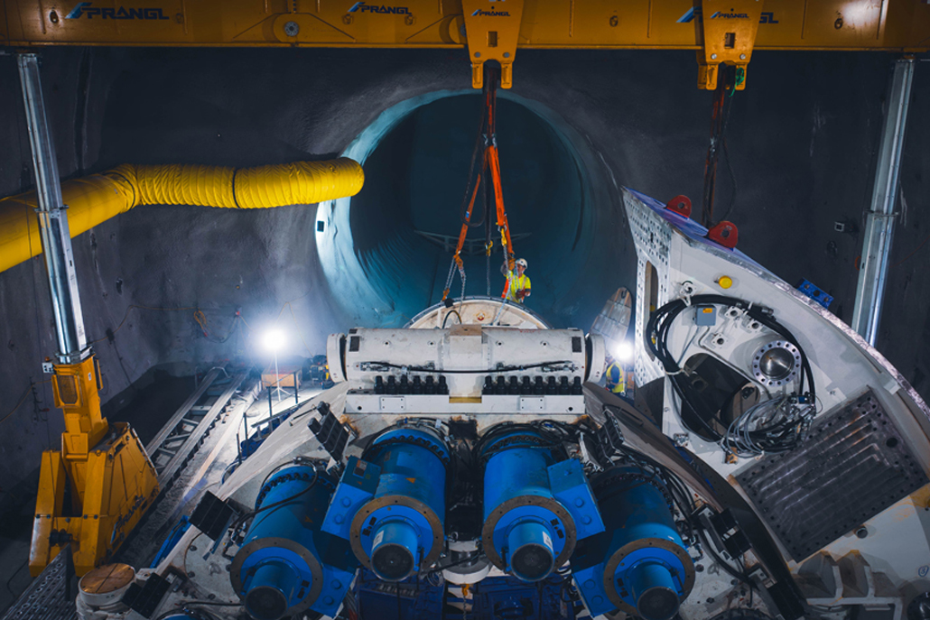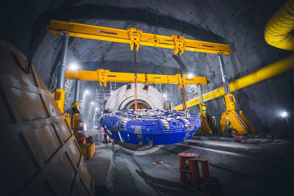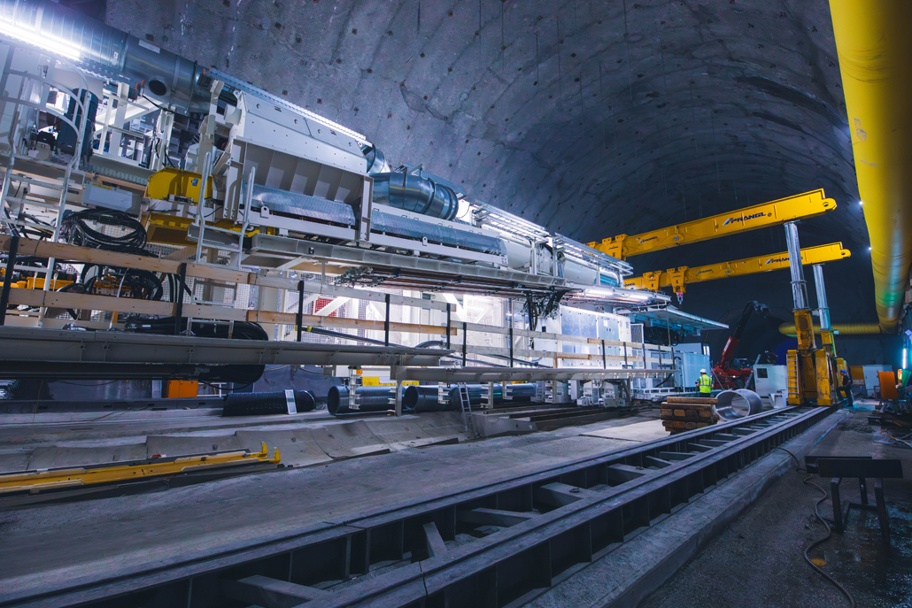 Der Aufbau des Hubportales startete am 25. März 2024 – rund vier Kilometer tief im Berg. Ab 02. April 2024 begann die Montage der Tunnelbohrmaschine, die in Kleinteilen (Maximalgewicht 90 Tonnen) in die Montagekaverne angeliefert wurde. Die wichtigsten Komponenten waren dabei der Hauptantrieb inklusive Schneiderad. Die größte Herausforderung stellte das Aufdrehen des Schneiderades mit einem Durchmesser von 10,6 Meter dar, welches nach dem Zusammenbau 269 Tonnen auf die Waage brachte. Mit höchster Konzentration konnte diese Aufgabe ohne Zwischenfälle bewältigt werden – ebenso wie das Aufdrehen des Antriebs mit einem Gewicht von 234 Tonnen.