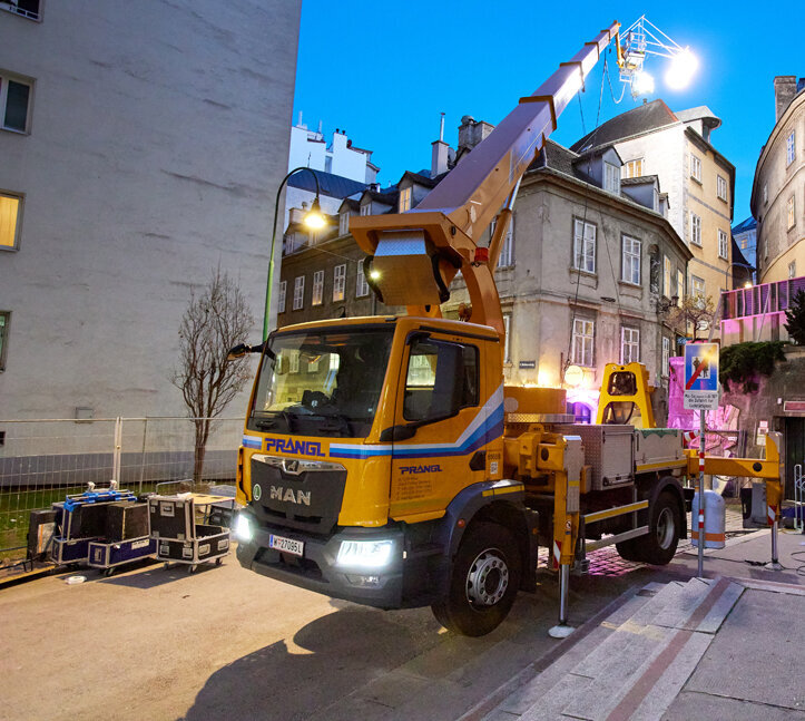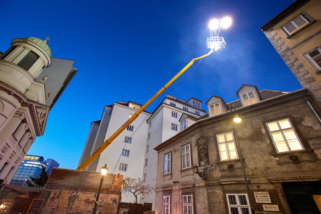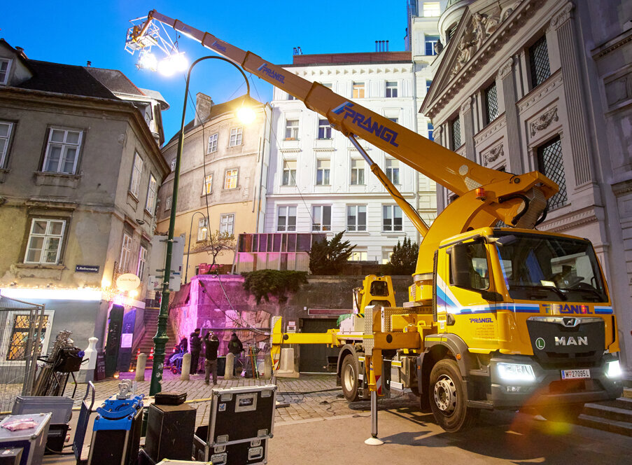Nach dem Motto: “Vorbereitung ist alles!“, wurde etwa der neue Schwenkgabelträger vor Beginn der Dreharbeiten vorgeführt und fix in den Geräteplan aufgenommen. Gebucht wurden LKW-Arbeitsbühnen mit Fahrer, zwei Anhänger-Arbeitsbühnen, Scheren-Arbeitsbühnen mit unterschiedlichen Arbeitshöhen, eine Gelenk-Arbeitsbühne und ein Teleskop-Stapler mit dem neuen Schwenkgabelträger. Die Maschinen von Prangl waren an insgesamt 15 Motiven im Großraum Wien beteiligt. Für jedes davon wurde individuell ein passendes Gerät ausgewählt – wie z.B. für eine Szene in der Griechengasse in der Wiener Innenstadt.