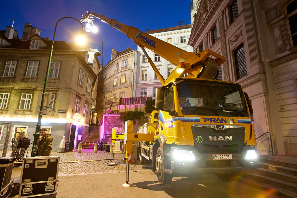 Nur ganz selten wird bei einem Film mit dem gerade verfügbaren Licht gearbeitet. Um eine Szene mit dem gewollten Effekt darzustellen, braucht es die passende Lichtstimmung. Die Filmcrew dabei mit den richtigen Geräten zu unterstützen ist eine wichtige Aufgabe. Prangl ist auf diesem Gebiet sehr versiert, denn schon unzählige Male waren Arbeitsbühnen oder auch Mobilkrane des Unternehmens an Filmproduktionen beteiligt. Ausgestattet mit diesem Erfahrungsschatz, kann man den verantwortlichen Beleuchtern mit Rat und Tat zur Seite stehen und die adäquate Palette an Maschinen bereitstellen.
