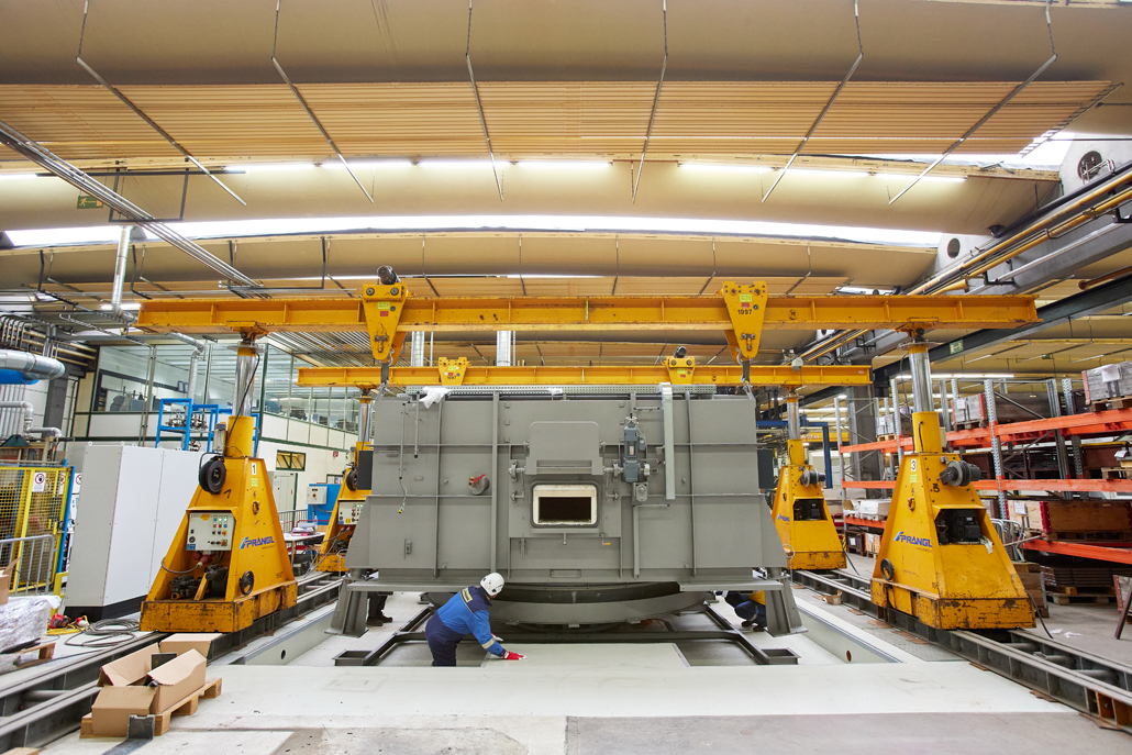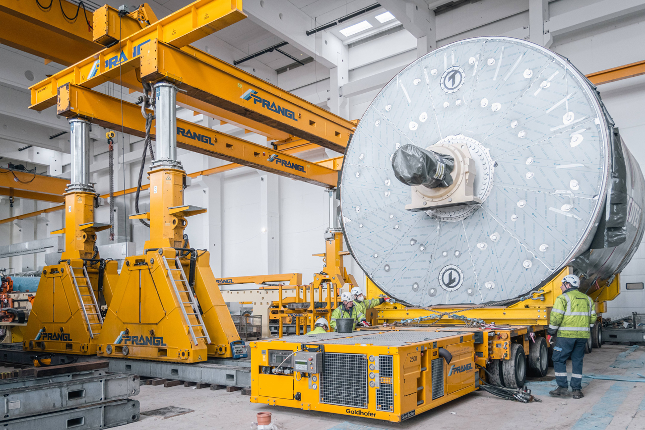 Die heikle Aufgabe des Prangl-Teams: Ein 4,4 Meter hoher Drehofen mit einem Durchmesser von 4,0 Meter sollte in eine Halle eingebracht und dort abgestellt werden, wo die 10 Tonnen schwere Maschine künftig ihren Dienst leisten wird. Herausfordernd dabei war die Tatsache, dass es sich um eine mit Produktionsanlagen bestückte Halle handelte und der verfügbare Platz äußerst gering war und der laufende Betrieb keinesfalls gestört werden durfte.