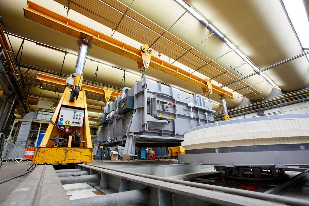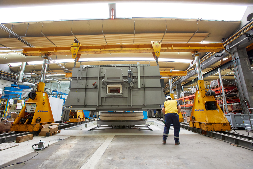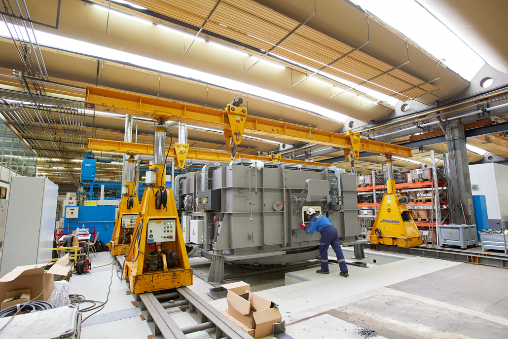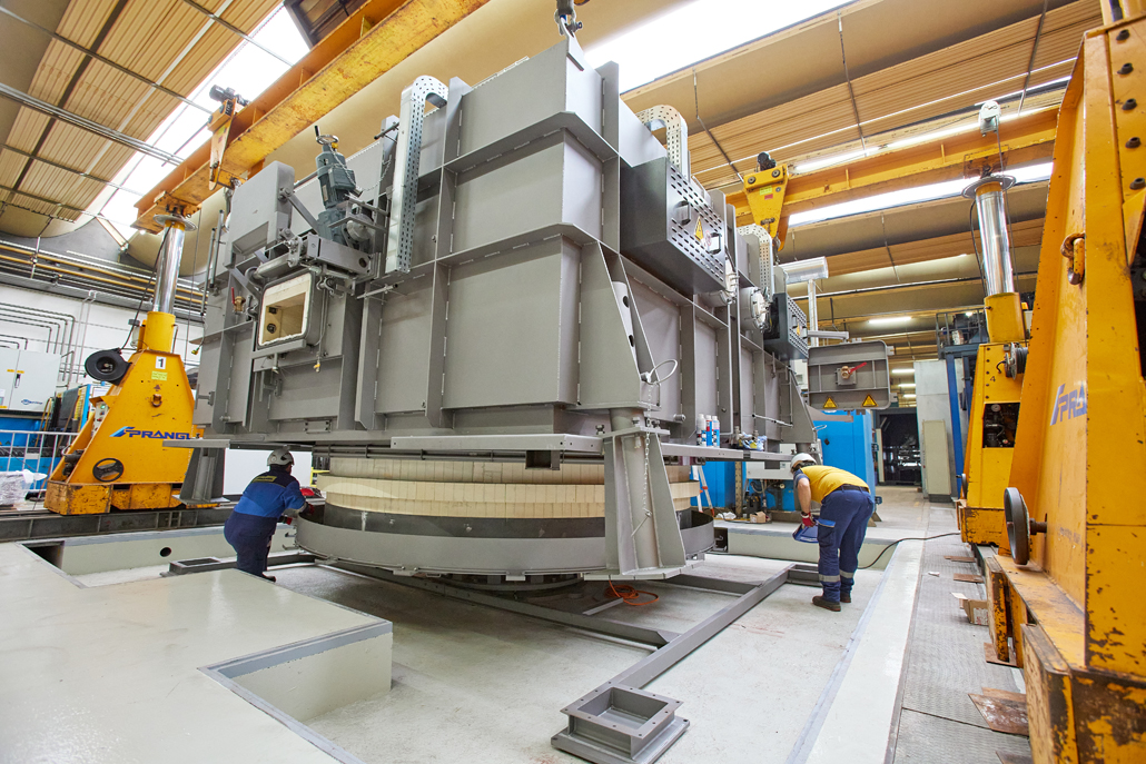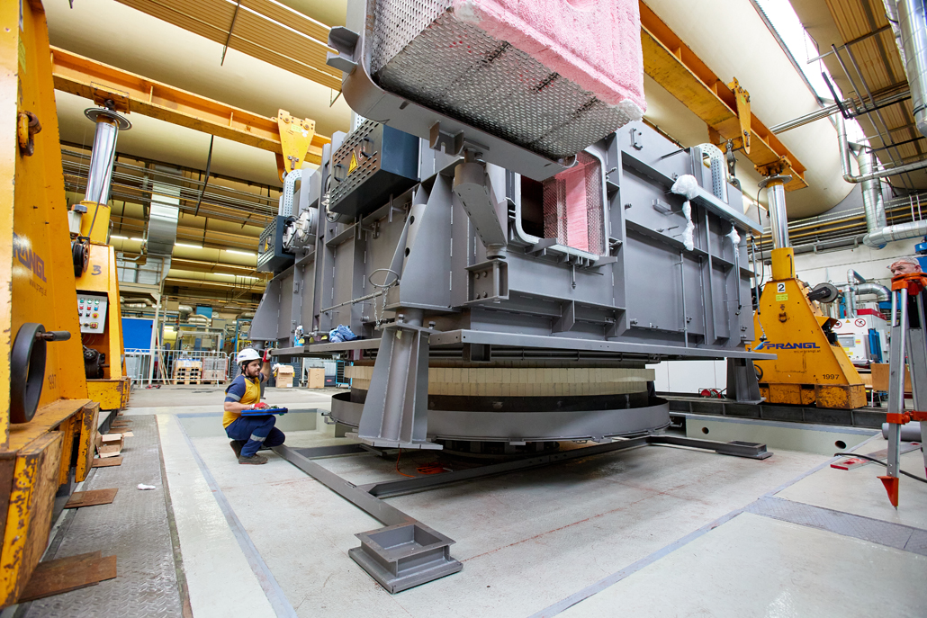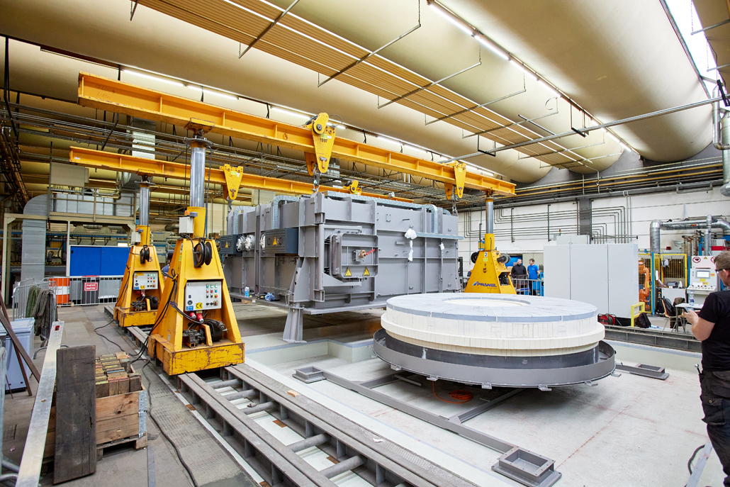 Zunächst waren wegen der beengten Platzverhältnisse in der Produktionshalle vorab Demontagearbeiten erforderlich. Erst dann konnten die tatsächlichen Arbeiten begonnen werden. Den ersten Arbeitsschritt übernahm ein 70 Tonnen Teleskopkran, der das Abladen der angelieferten Ofenteile vom Tieflader erledigte. Danach kamen ein Hubstapler mit 3,5 Tonnen Tragfähigkeit und einer maximale Hubhöhe von 4,5 Meter, sowie Schwerlastrollen zum Einsatz. Diese hatten gemeinsam die Aufgabe, die einzelnen Teile in die Halle einzubringen und dort an einem im Vorfeld definierten Montageplatz abzulegen.