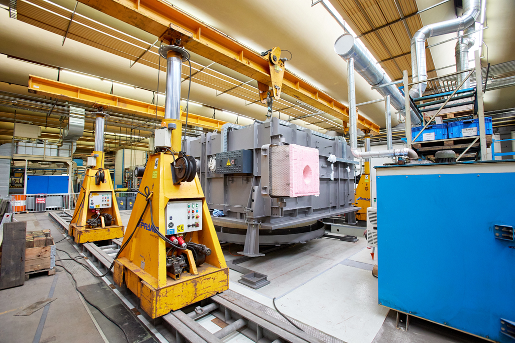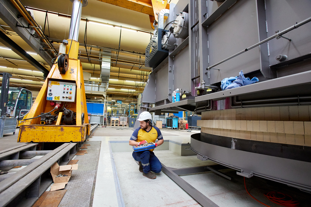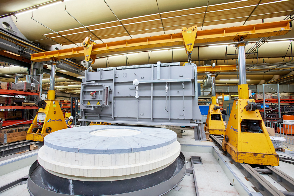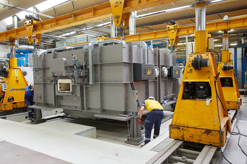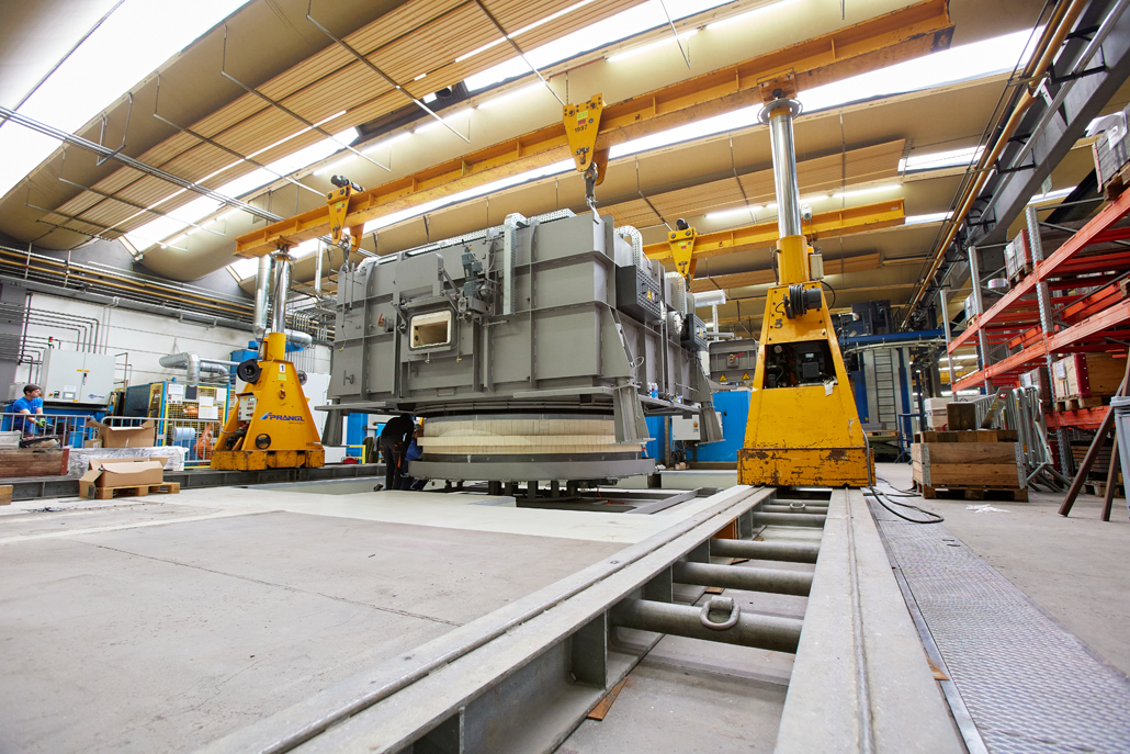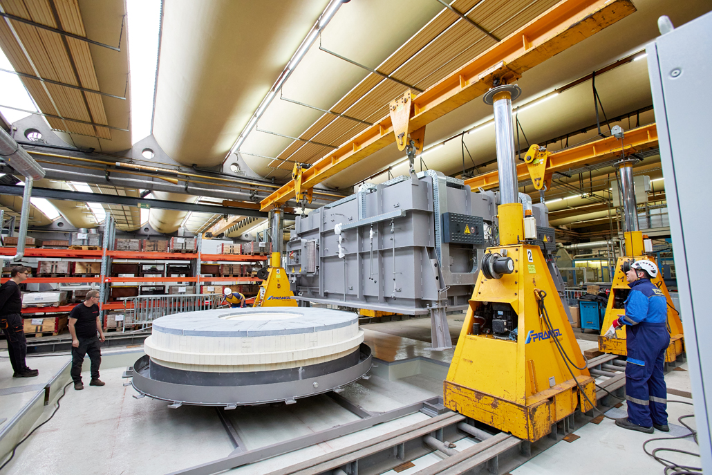 Zunächst waren wegen der beengten Platzverhältnisse in der Produktionshalle vorab Demontagearbeiten erforderlich. Erst dann konnten die tatsächlichen Arbeiten begonnen werden. Den ersten Arbeitsschritt übernahm ein 70 Tonnen Teleskopkran, der das Abladen der angelieferten Ofenteile vom Tieflader erledigte. Danach kamen ein Hubstapler mit 3,5 Tonnen Tragfähigkeit und einer maximale Hubhöhe von 4,5 Meter, sowie Schwerlastrollen zum Einsatz. Diese hatten gemeinsam die Aufgabe, die einzelnen Teile in die Halle einzubringen und dort an einem im Vorfeld definierten Montageplatz abzulegen.