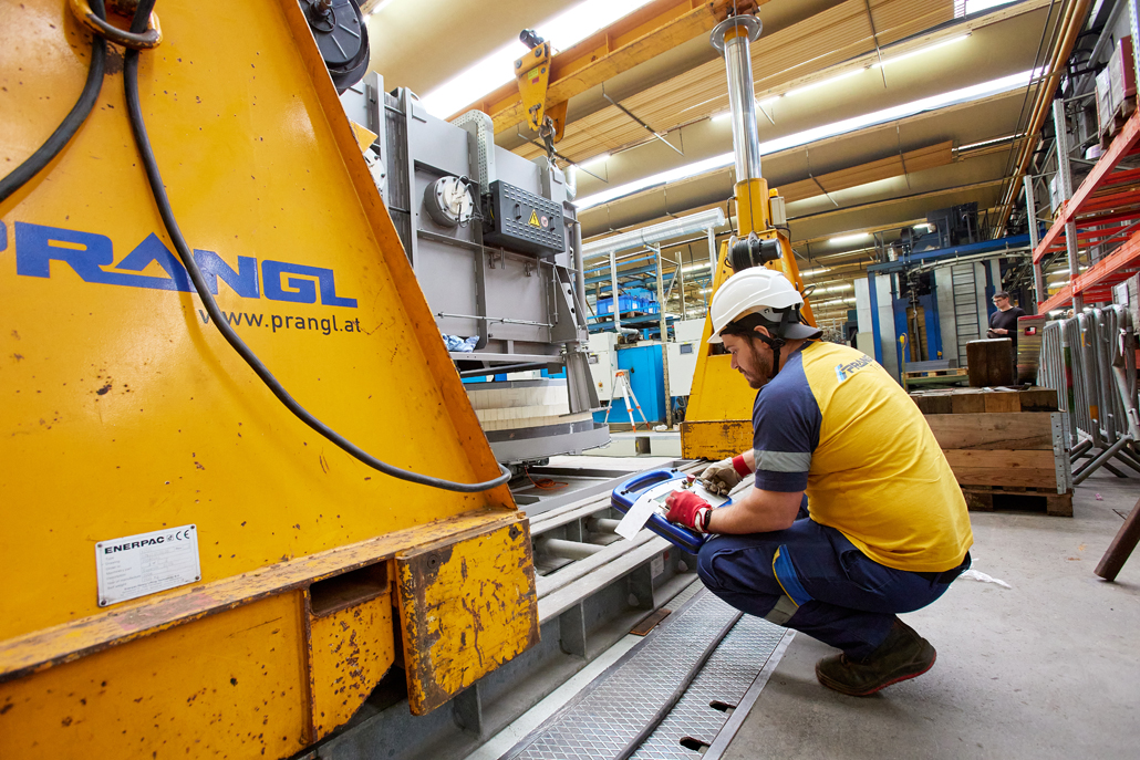 Der Auftraggeber – ein Spezialist für Mäh- und Schneidtechnik in der Land- und Forstwirtschaft – ließ sich von Prangl ein komplettes Dienstleistungspaket für diesen Job mit Indoor-Einsatz schnüren: Abladung, Einbringung und Endpositionierung des Drehofens in der Halle. Dementsprechend wurde die Auswahl der notwendigen Prangl-Geräte an die speziellen Anforderungen angepasst. Sie sollten den beengten Platzverhältnissen entsprechen und trotzdem in der Lage sein, die teilweise sehr schweren Teile zu manipulieren. Dabei durfte außerdem auch nicht die Effizienz außer Acht gelassen werden.