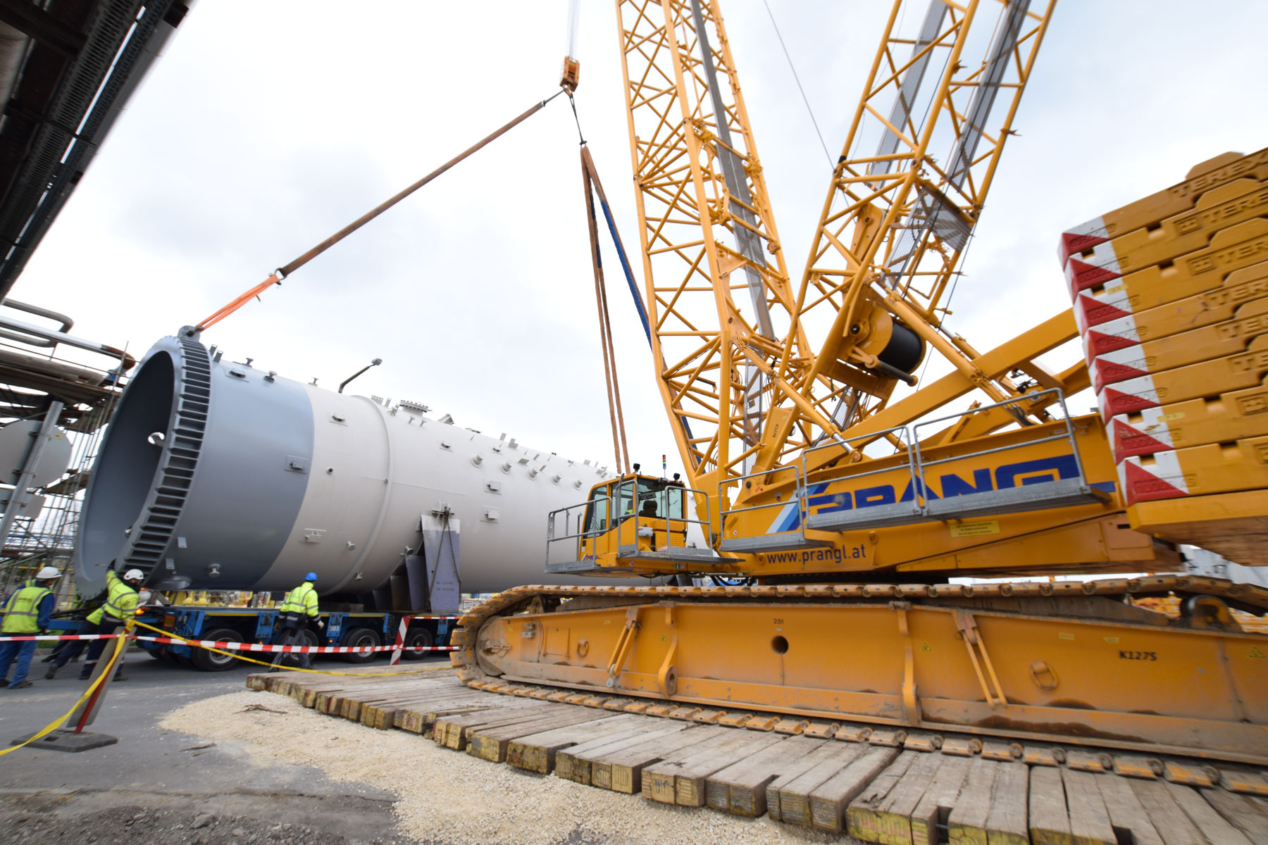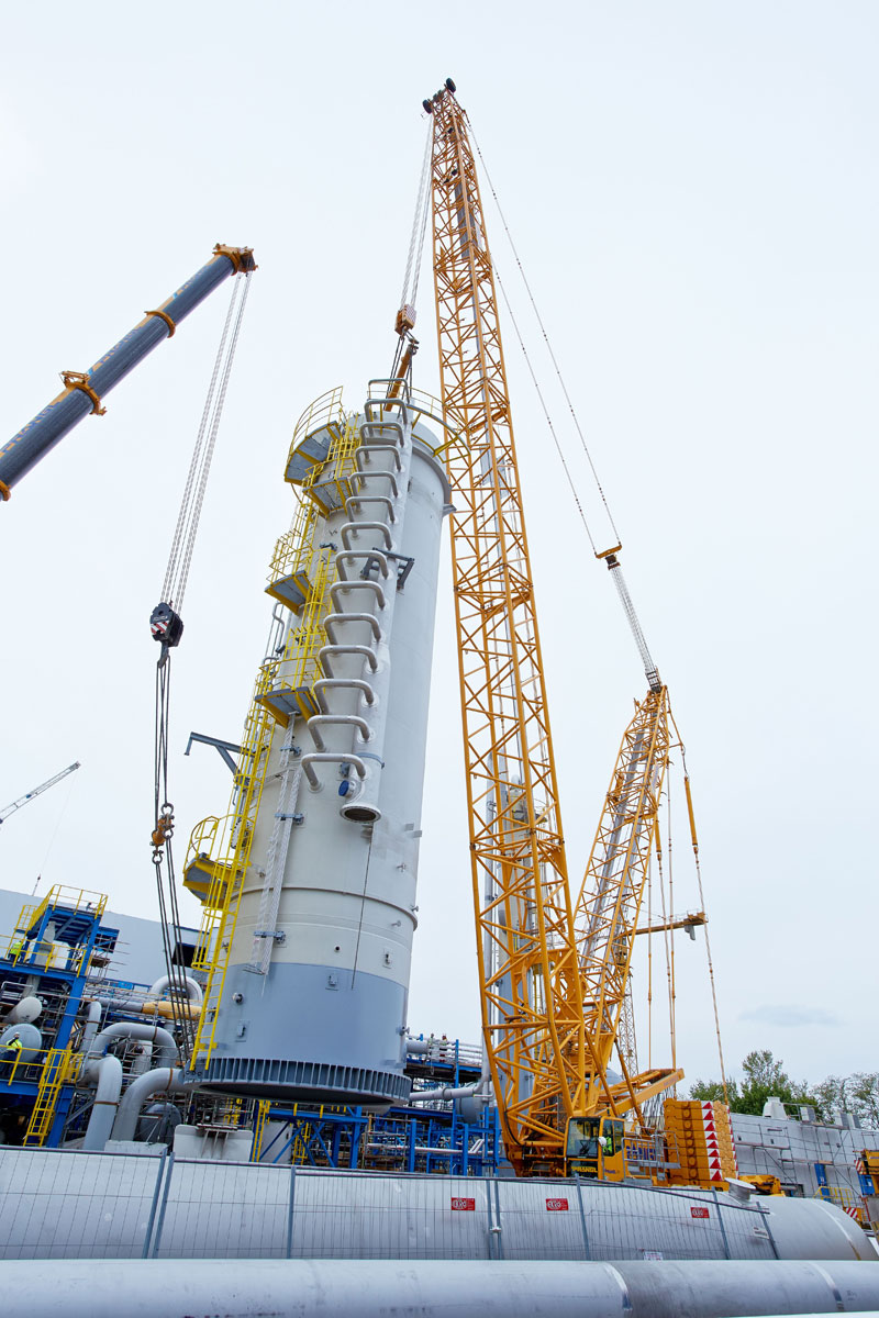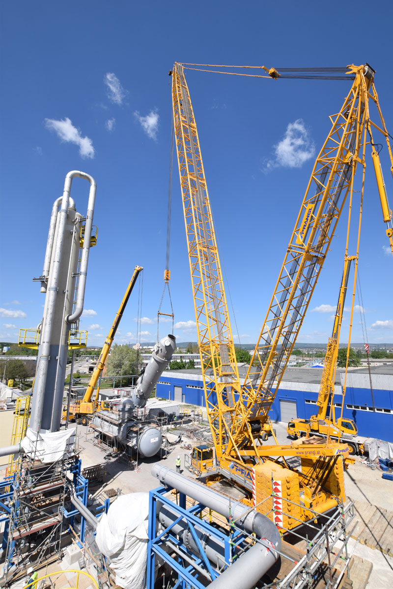 Ebenso anspruchsvoll war das Verheben des Process-Gas-Coolers mit einem Gewicht von 93 Tonnen, einem Durchmesser von 5,8 Meter und einer Höhe von 5,4 Meter. Aufgrund der engen Platzverhältnisse war das gesamte Team auch bei der Zwischenlagerung der acht Apparate gefordert. Unter Mithilfe eines 350 Tonnen und eines 160 Tonnen Teleskopkrans wurden alle Komponenten noch am selben Tag – wie geplant – an ihren definierten Plätzen abgelegt. Anschließend wurde der Raupenkran von der Rohrbrücke auf das Baufeld Nord übersiedelt. Da ein Verfahren nicht möglich war, musste der Großkran komplett abgebaut und wieder neu aufgestellt werden.