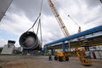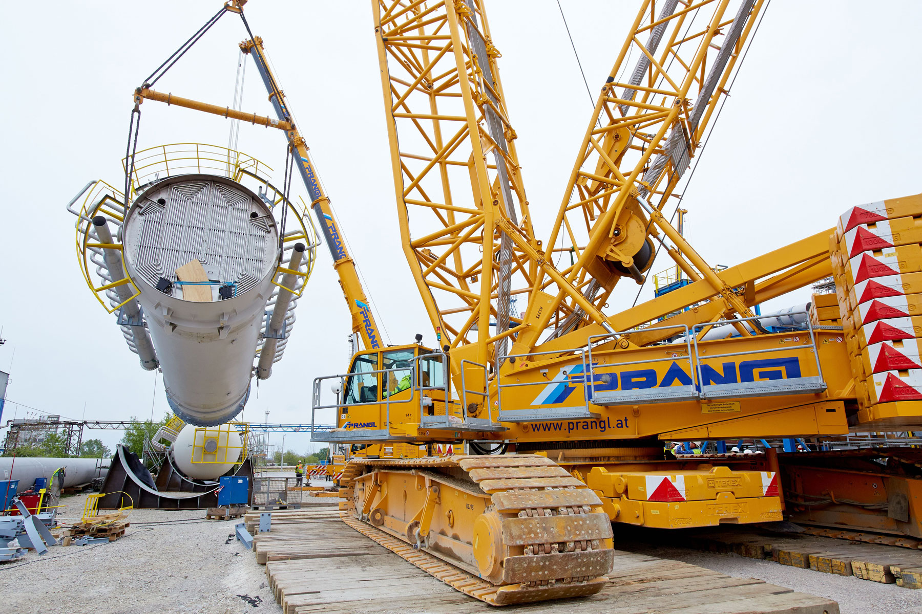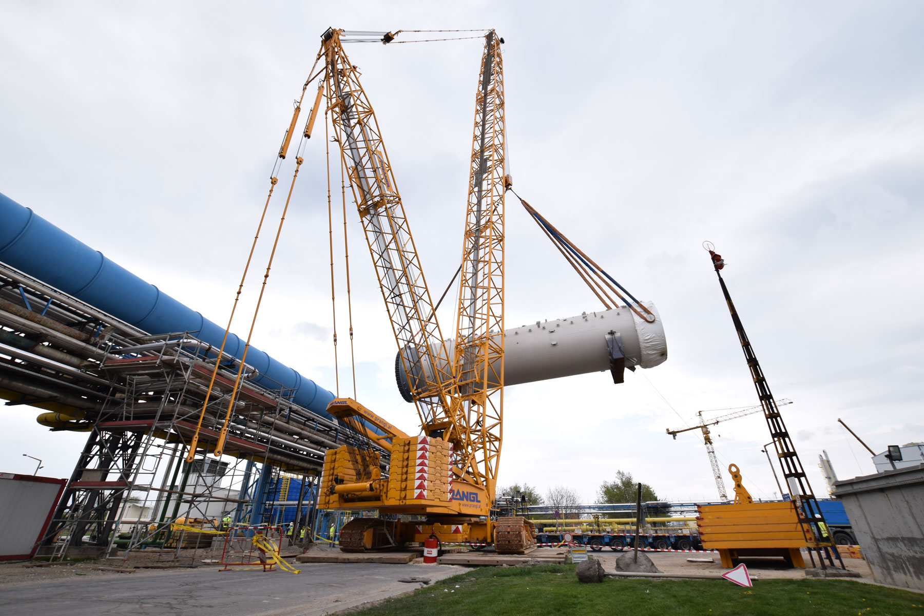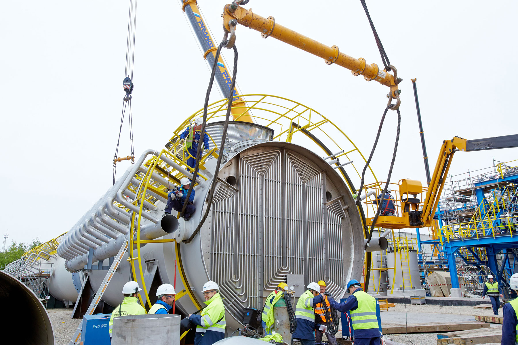 Ebenso anspruchsvoll war das Verheben des Process-Gas-Coolers mit einem Gewicht von 93 Tonnen, einem Durchmesser von 5,8 Meter und einer Höhe von 5,4 Meter. Aufgrund der engen Platzverhältnisse war das gesamte Team auch bei der Zwischenlagerung der acht Apparate gefordert. Unter Mithilfe eines 350 Tonnen und eines 160 Tonnen Teleskopkrans wurden alle Komponenten noch am selben Tag – wie geplant – an ihren definierten Plätzen abgelegt. Anschließend wurde der Raupenkran von der Rohrbrücke auf das Baufeld Nord übersiedelt. Da ein Verfahren nicht möglich war, musste der Großkran komplett abgebaut und wieder neu aufgestellt werden.