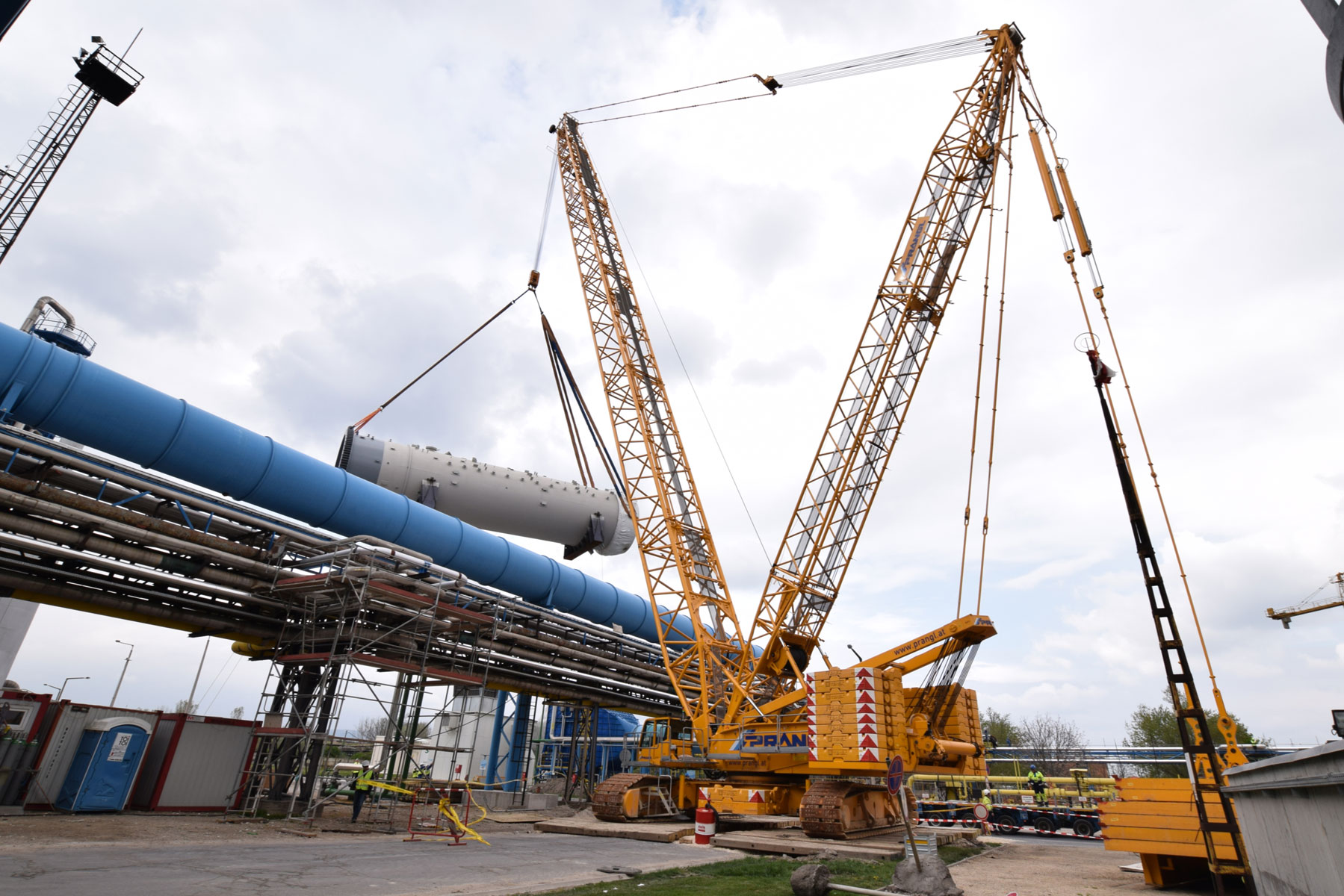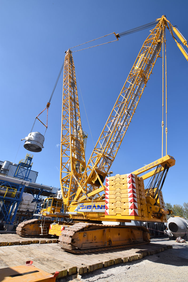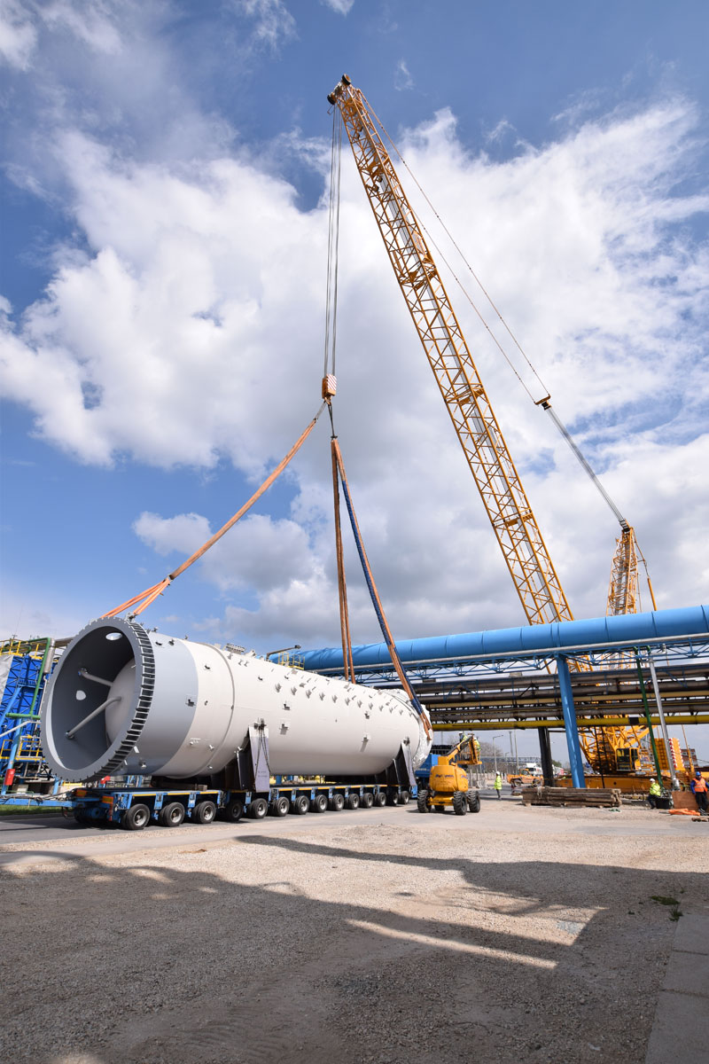 Im April/Mai 2016 standen die schweren Hübe am Programm. Eine Rohrbrücke innerhalb der Düngemittelanlage mit einer Durchfahrtshöhe von 4,8 Meter machte es erforderlich, dass sechs der acht eintreffenden Apparate überhoben werden mussten. Herausfordernd waren die beengten Platzverhältnisse und ein knapper Zeitplan. Für das Überheben der Rohrbrücke kam ein 400 Tonnen Raupenkran mit 66 Meter Haupausleger und einem Superliftgegengewicht von 200 Tonnen zum Einsatz. Mit Einzelgewichten von 112 Tonnen bzw. 80 Tonnen und Gesamtlängen von knapp 23 Meter waren die schwersten Hübe die beiden Teile des Absorptionsturms.