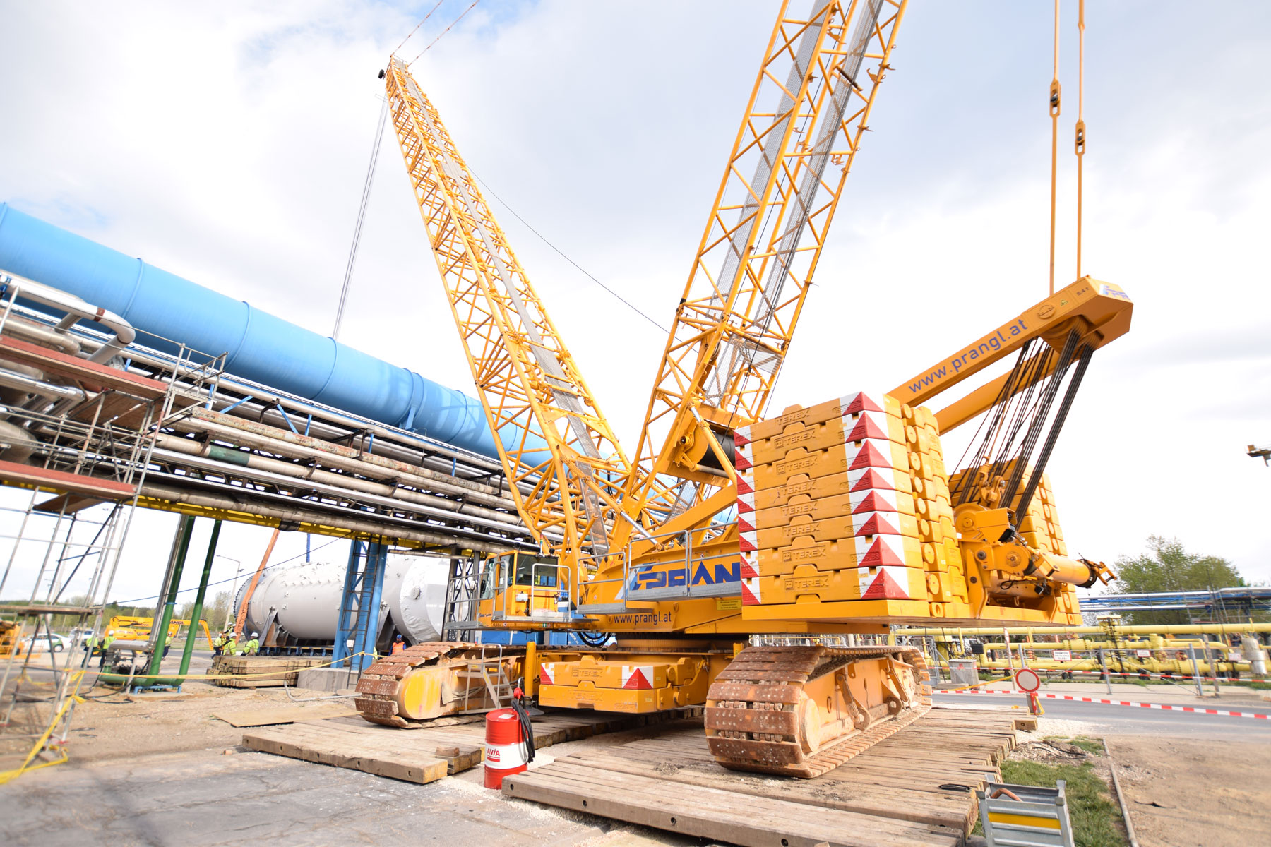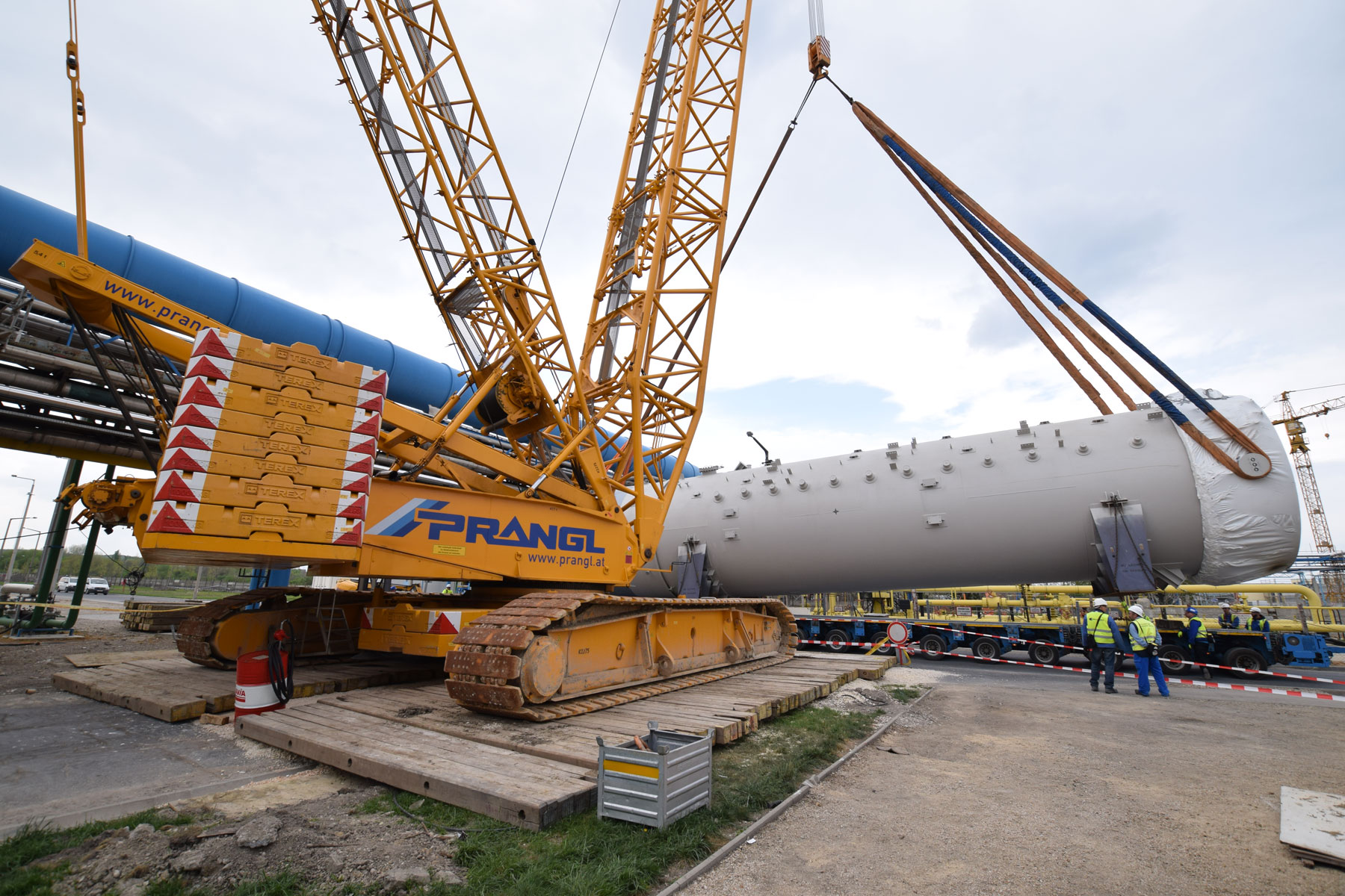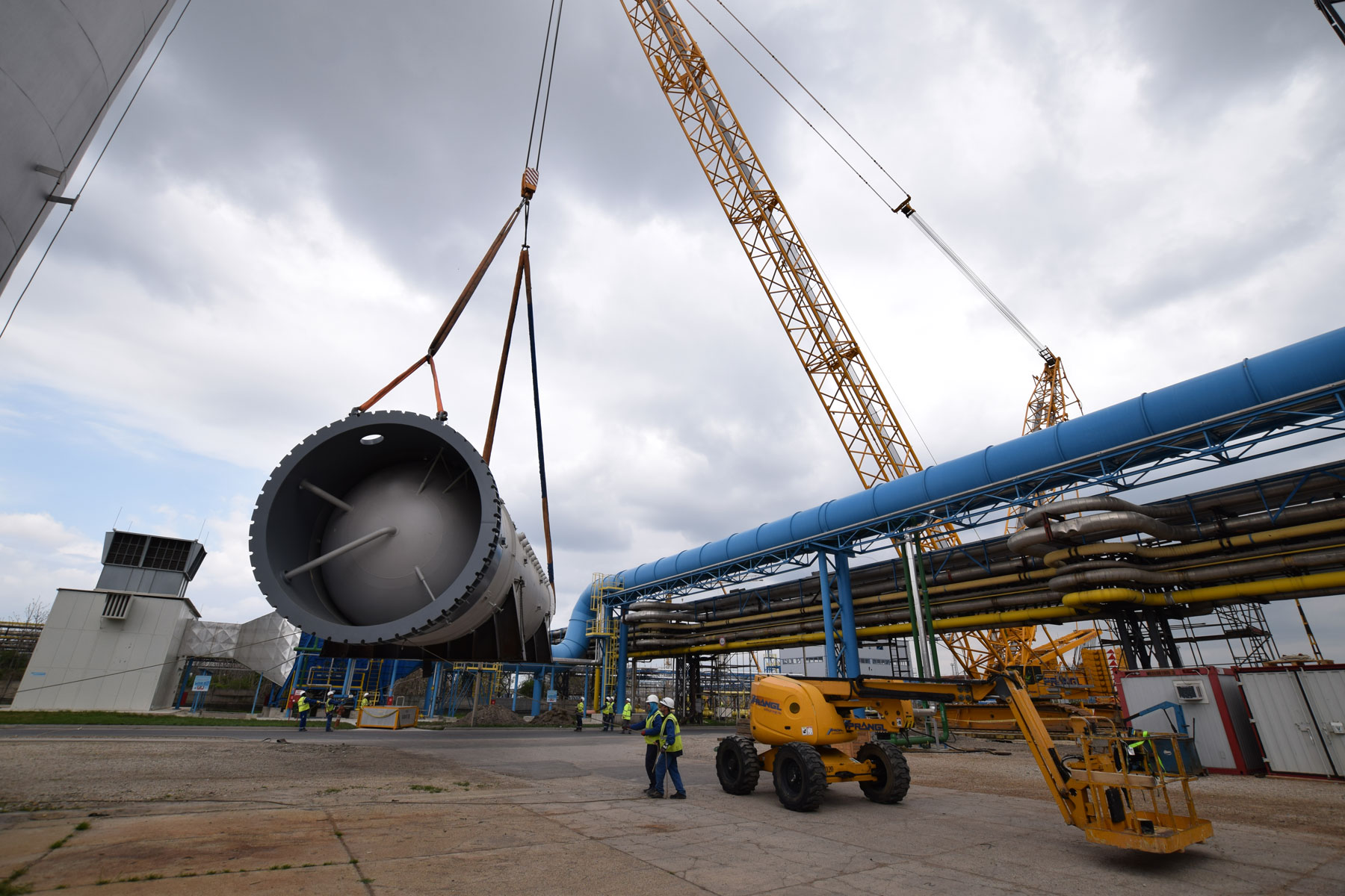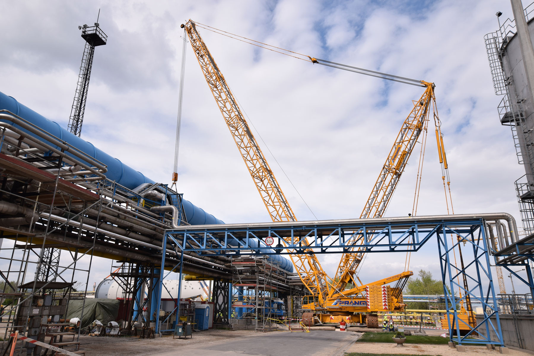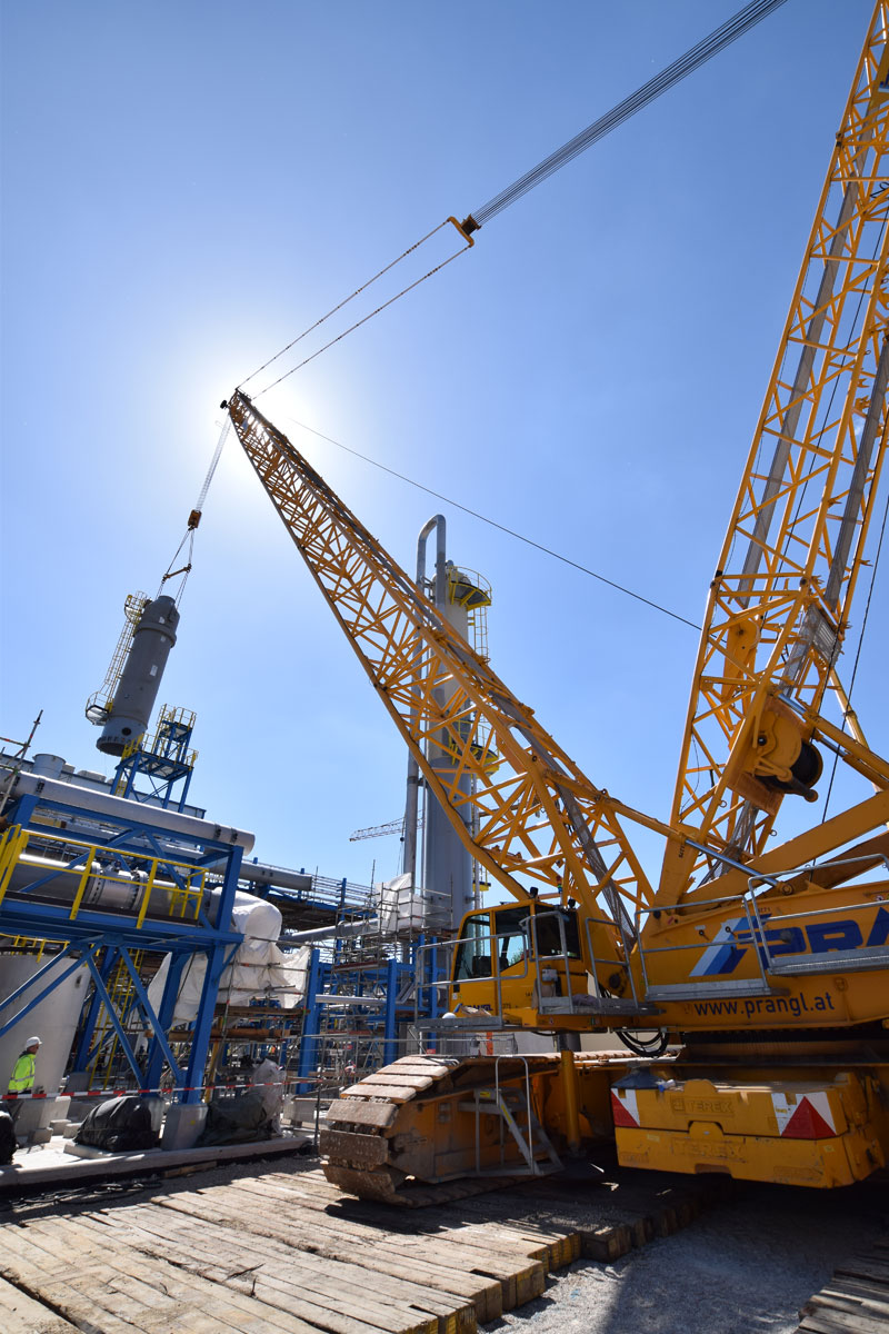 Zu tun gibt es für Prangl sowohl im Bereich der Fertigung und Montage der Rohrleitungen und deren Halterungen als auch bei der Montage von ca. 75 Apparaten mit einem Gesamtgewicht von rund 1 200 Tonnen. Diese Projektphase startete für Prangl im Jänner 2016. Die letzten Einsätze werden im September/Oktober 2016 stattfinden. Die ersten Apparate und Rohrleitungen wurden mit Teleskopkranen mit Hubleistungen zwischen 100 und 350 Tonnen verhoben. Für das Montageteam sind zusätzlich laufend 4 Tonnen und 6 Tonnen Teleskopstapler sowie 20 Meter Diesel-Arbeitsbühnen und 10 Meter Elektro-Arbeitsbühnen im Einsatz.
