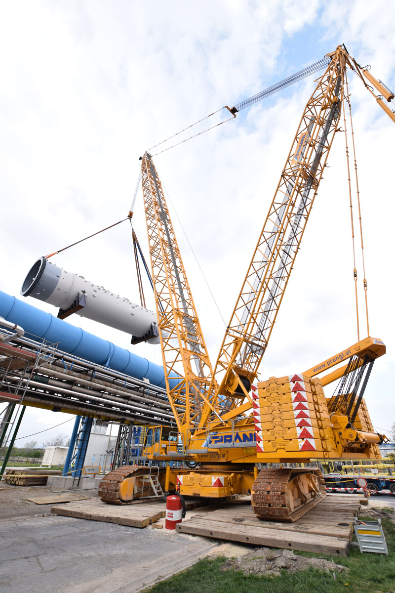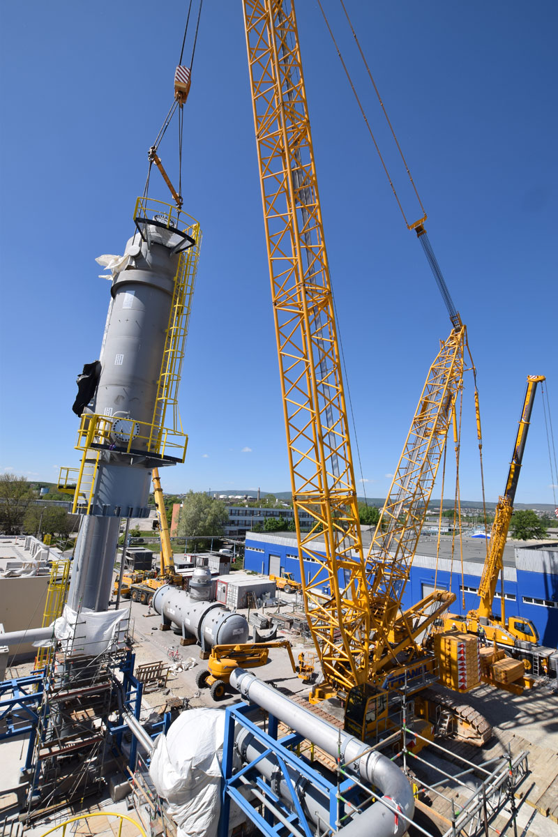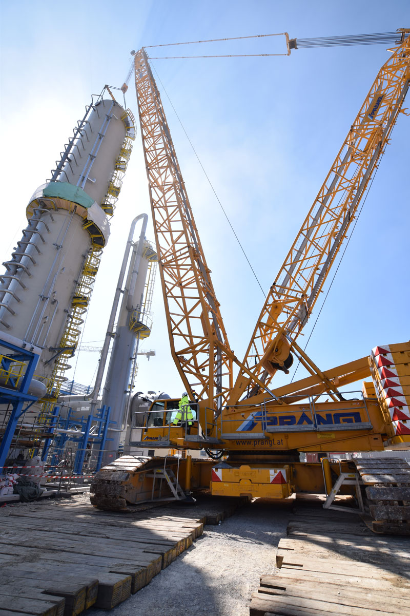 Nach Beendigung dieses Projektschrittes wurde der 400 Tonnen Raupenkran – wieder in voll aufgebautem Zustand – zurück zur Nordseite verfahren, wo nun im Tandemhub mit einem 350 Tonnen Teleskopkran die beiden Teile des Absorptionsturm aufgedreht und verhoben wurden. Für die finalen Montagearbeiten wurde ein 100 Tonnen Teleskopkran mit Mannkorb hinzugezogen. Unter der aktiven Mithilfe des gesamten Prangl-Teams konnten die geplanten Arbeiten bisher schneller als veranschlagt und zur vollsten Zufriedenheit aller Beteiligten abgewickelt werden.