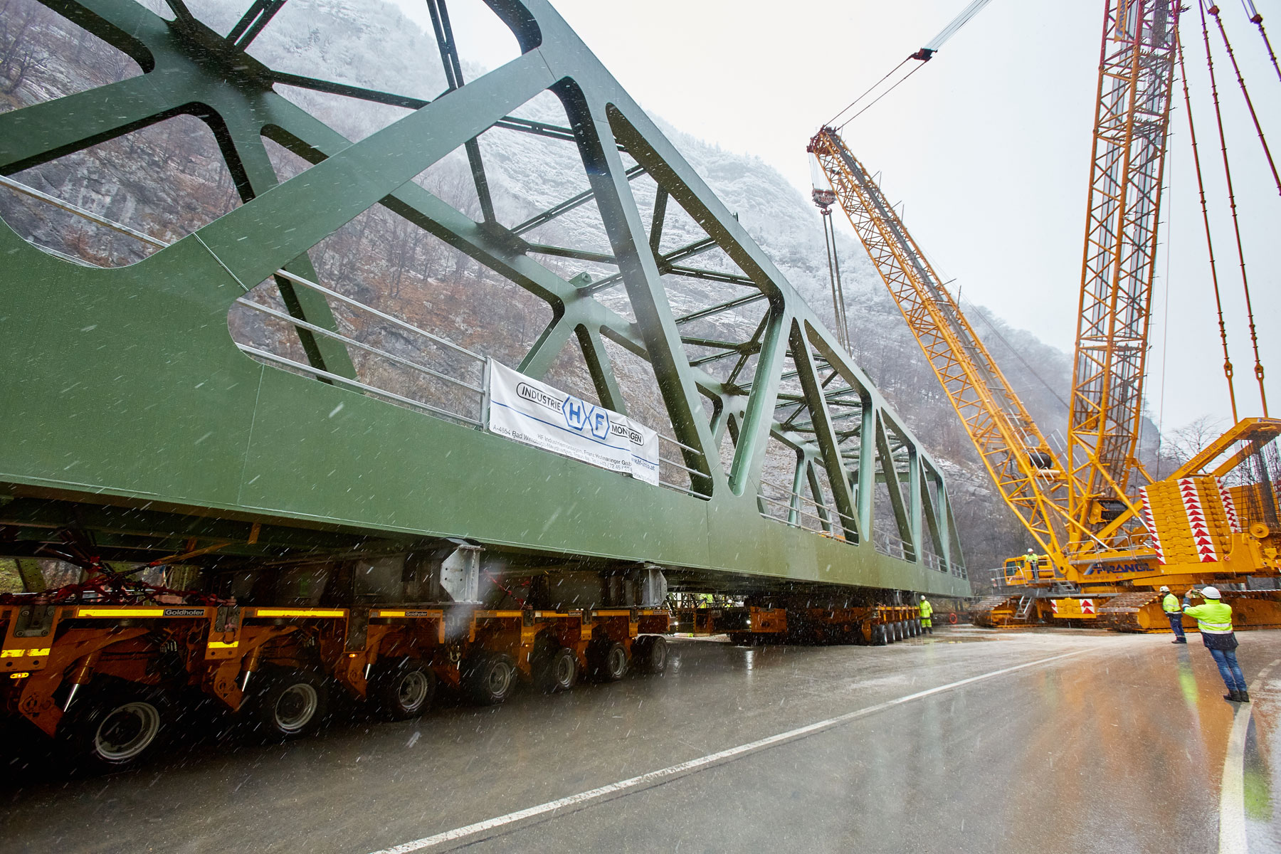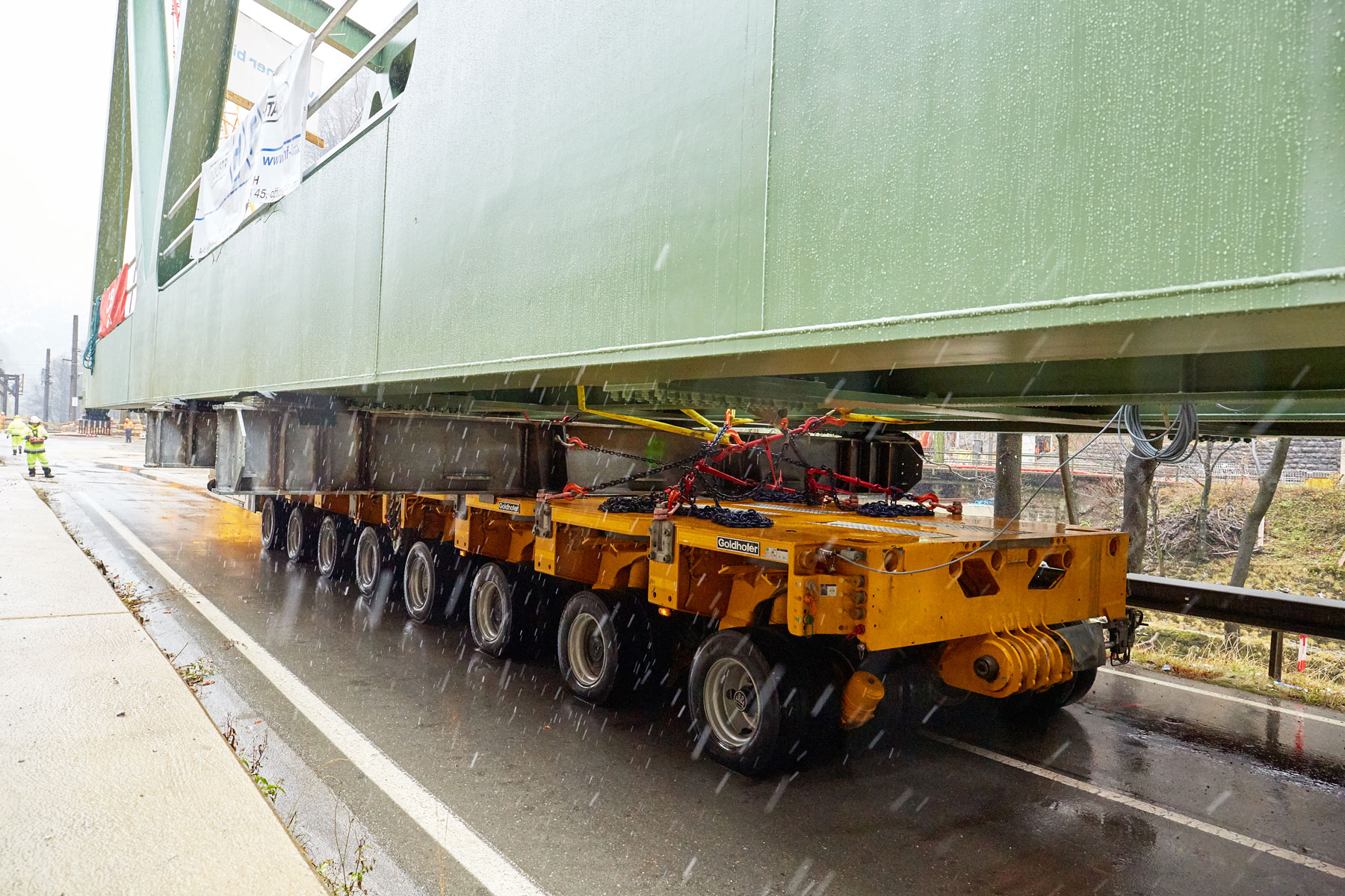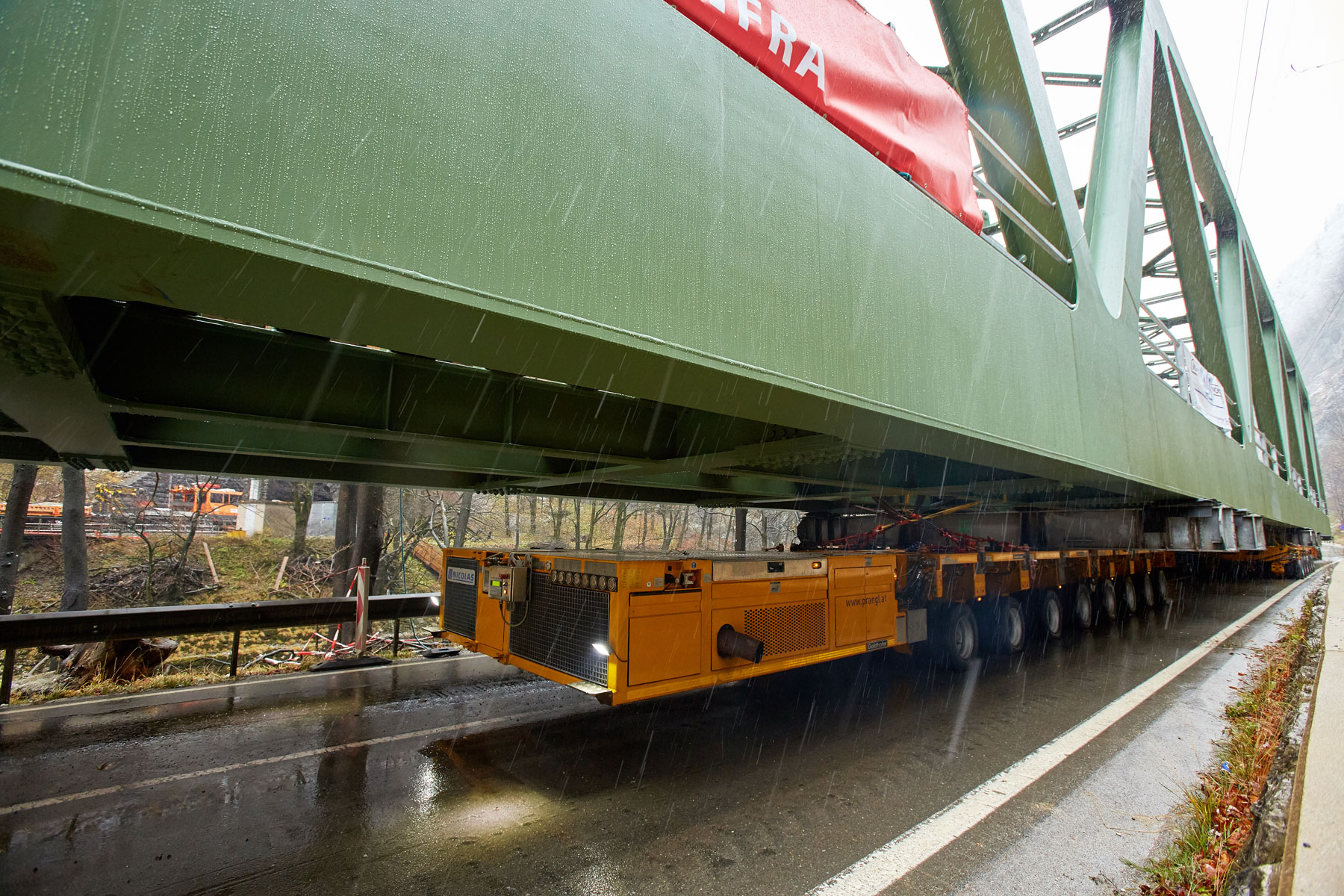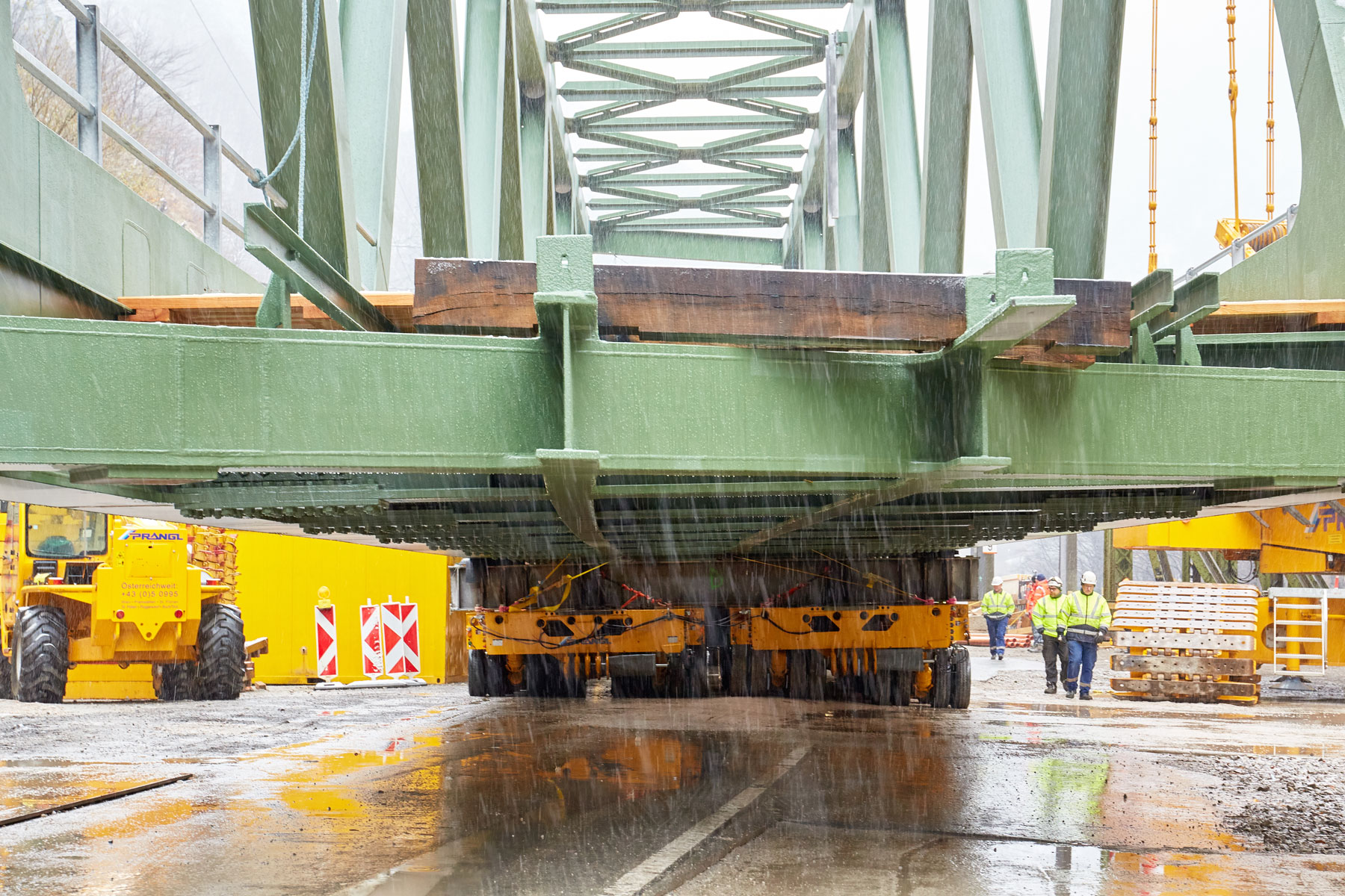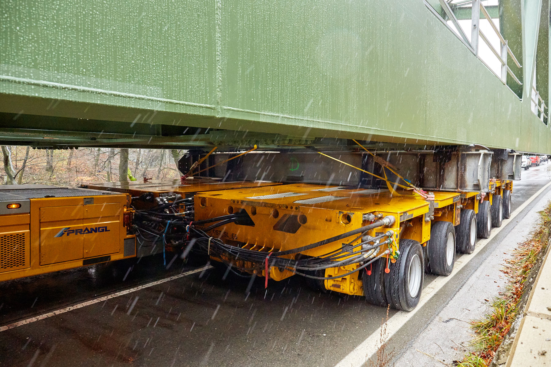 Erste Aufgabe für das Team von Prangl war nun, das alte Brückentragwerk mit 380 Tonnen Gesamtgewicht herauszuheben, auf drei synchronisierte Schwerlastmodule zu verladen und per Fernbedienung zum Zwischenlagerplatz zu fahren. Umgekehrt musste die neue Brücke vor ihrem Transport rund 300 Meter zum Ort der Verhebung verbracht werden. Das passierte ebenfalls mit den selbstfahrenden Schwerlasteinheiten. Aufgrund der engen Platzverhältnisse und der Länge von 70 Meter forderte bereits diese erste Phase höchste Konzentration aller Beteiligten.