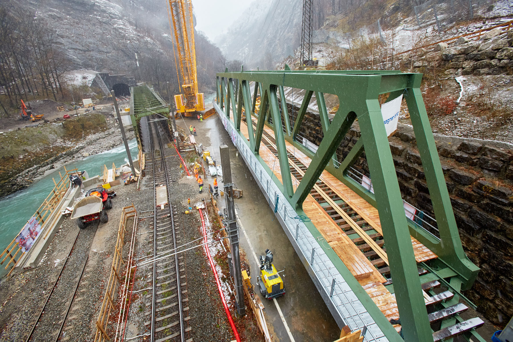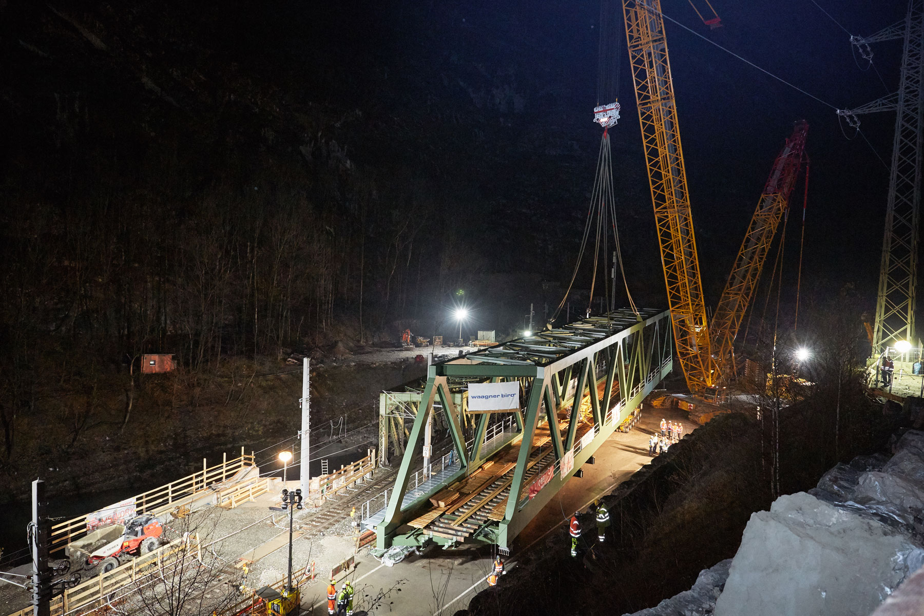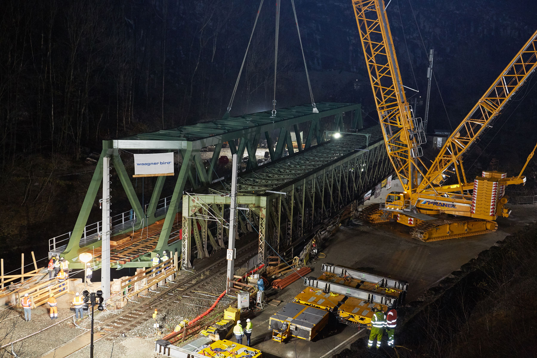 Trotz schwieriger Windverhältnisse wurde die neue Brücke millimetergenau eingehoben. Beide Hübe (alte und neue Brücke) erforderten höchste Konzentration des gesamten Teams, da die 70 Meter langen Konstruktionen zwischenzeitlich in einer Höhe von 20 Meter über dem Boden waren, um das bestehende Tragwerk des daneben liegenden zweiten Gleises nicht zu gefährden. Da sich die Baustelle direkt über dem Wasser befand und kurz unterhalb die gefährliche Salzachklamm beginnt, stand die ganze Nacht unterhalb der Baustelle ein Team der Wasserrettung bereit.