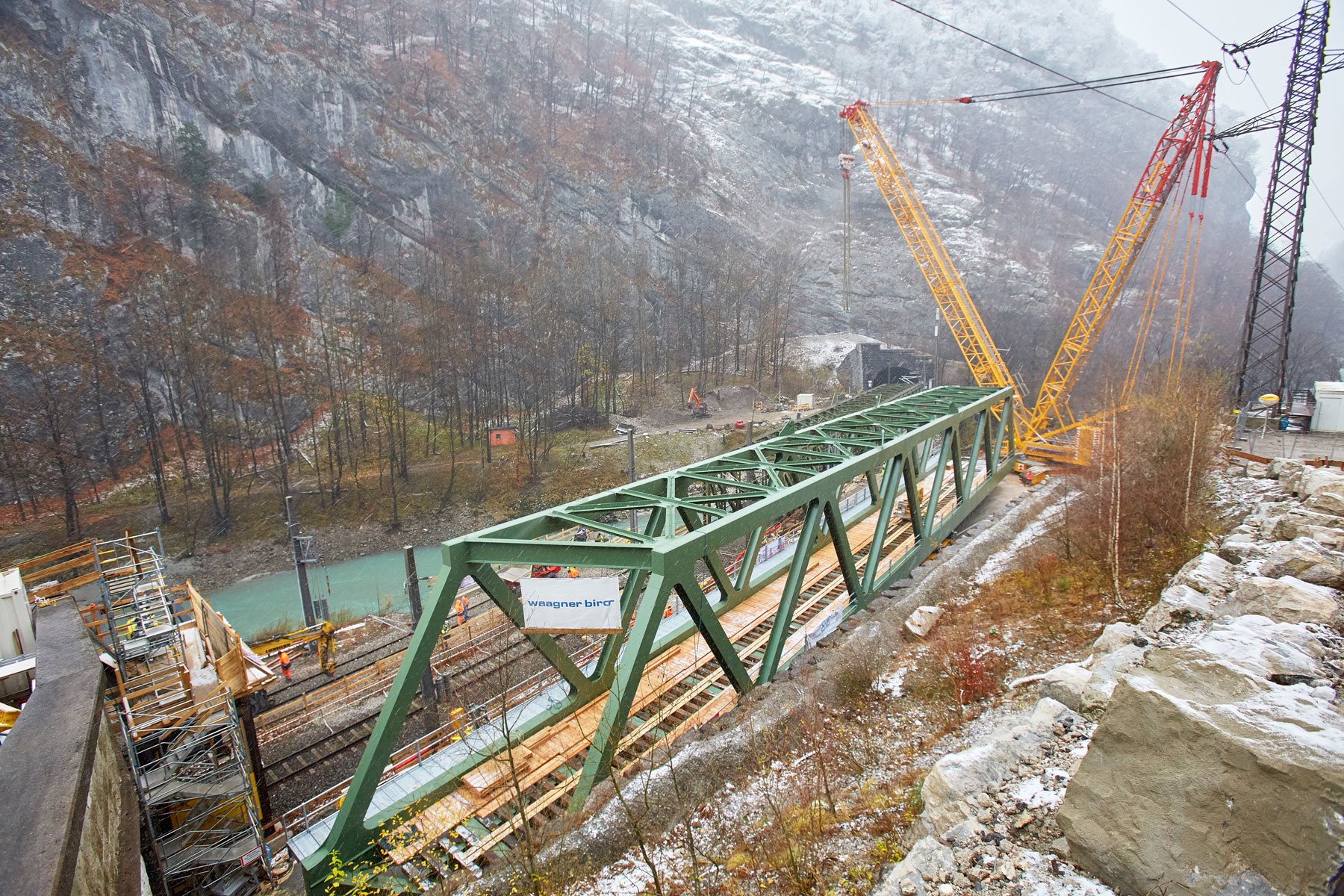 Die mehr als 100 Jahre alte Eisenbahnbrücke war am Ende ihrer Lebensdauer. Eine neue musste her – mit Hilfe der Hub-Experten von Prangl. Neben den Abmessungen des Stahl-Fachwerks (70 Meter Länge, 7 Meter Breite, 8 Meter Höhe und 350 Tonnen) waren es vor allem die beengten Platzverhältnisse, die alle Beteiligten herausforderten.