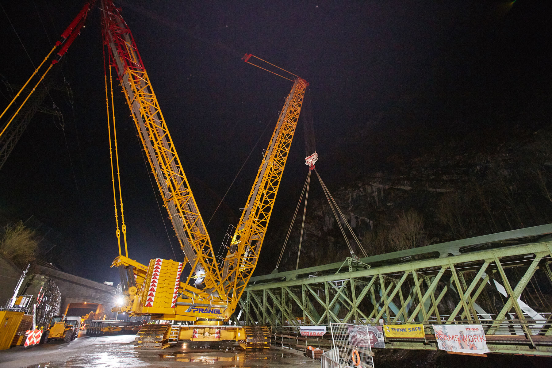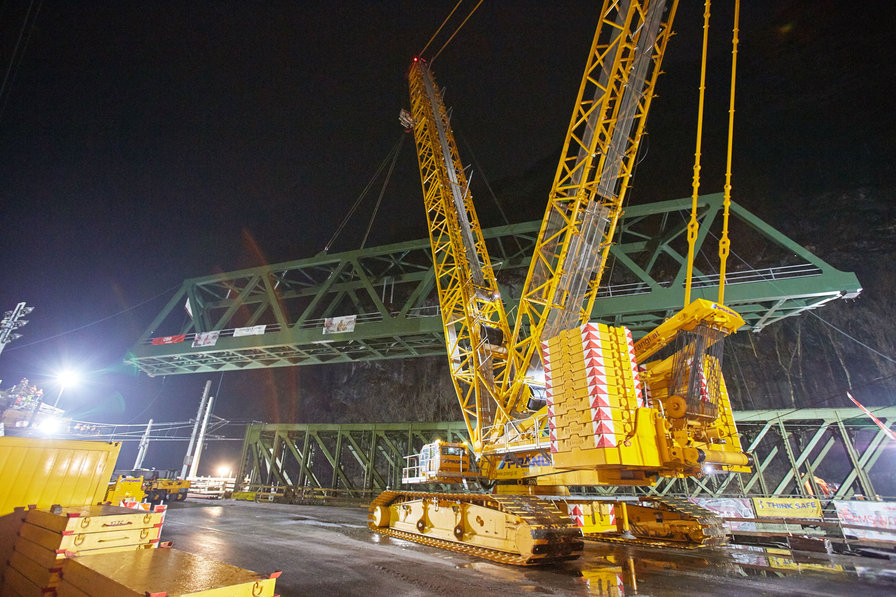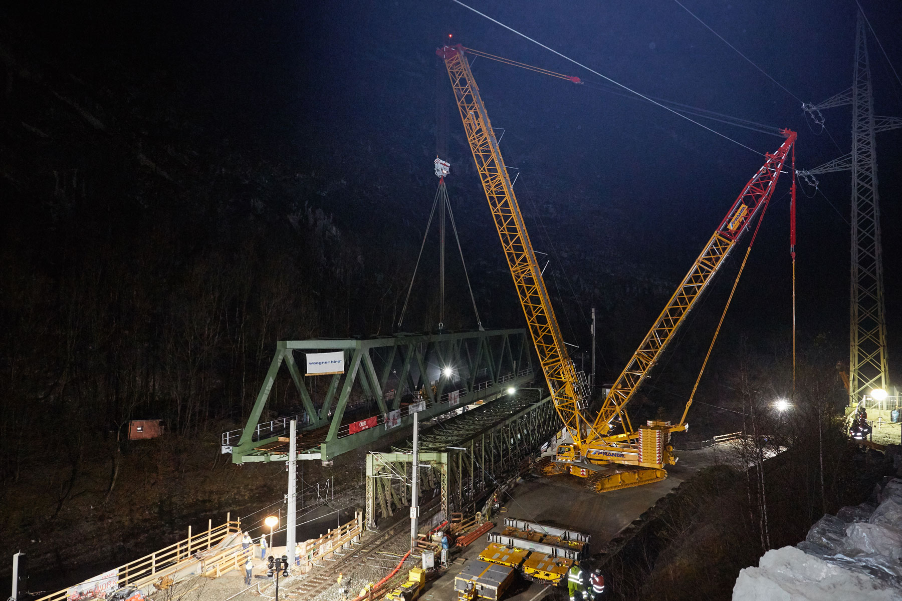 Endlich war es so weit: Kurz nachdem der letzte Zug um 02:00 Uhr die Strecke passierte, konnte mit den eigentlichen Hebearbeiten begonnen werden. Damit der erste planmäßige Zug in der Früh wieder ungehindert fahren kann, stand ein Zeitfenster von knapp zwei Stunden zur Verfügung. Hochspannung für alle Mitwirkenden! Direkt von den selbstfahrenden Schwerlastmodulen wurde das Fachwerk vom Kran übernommen. Aufgrund der Entfernung musste der Raupenkran seine Position einmal verändern und rund 20 Meter mit voller Last verfahren.