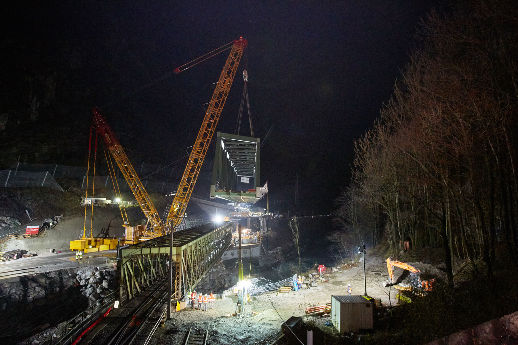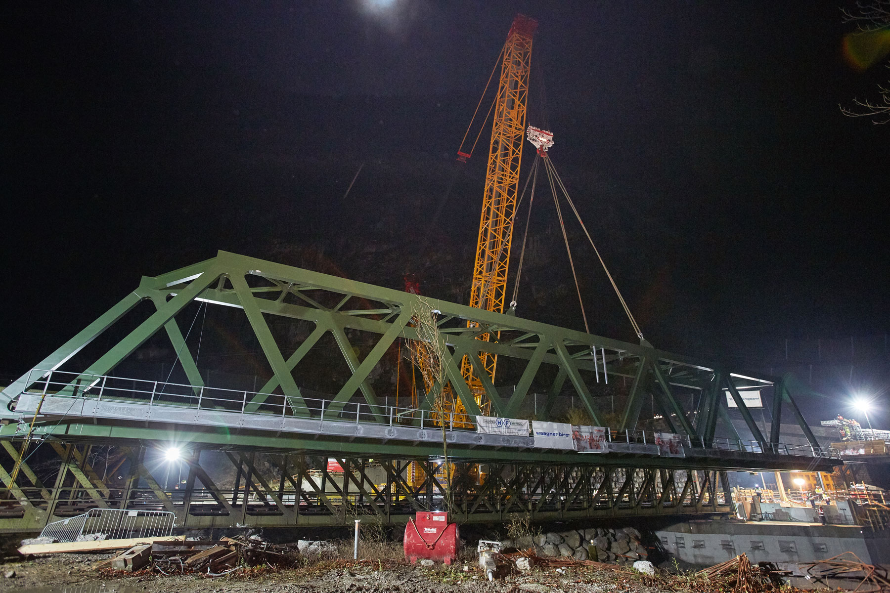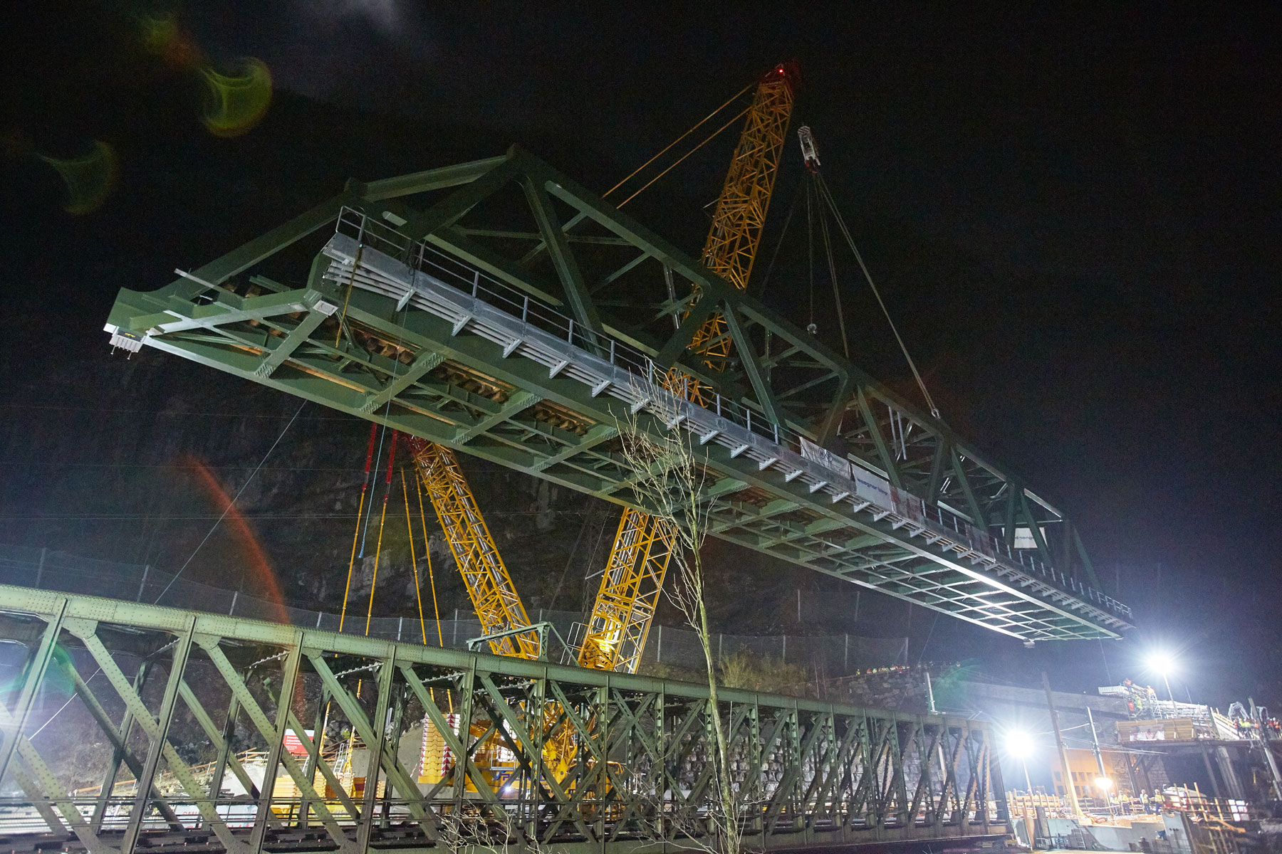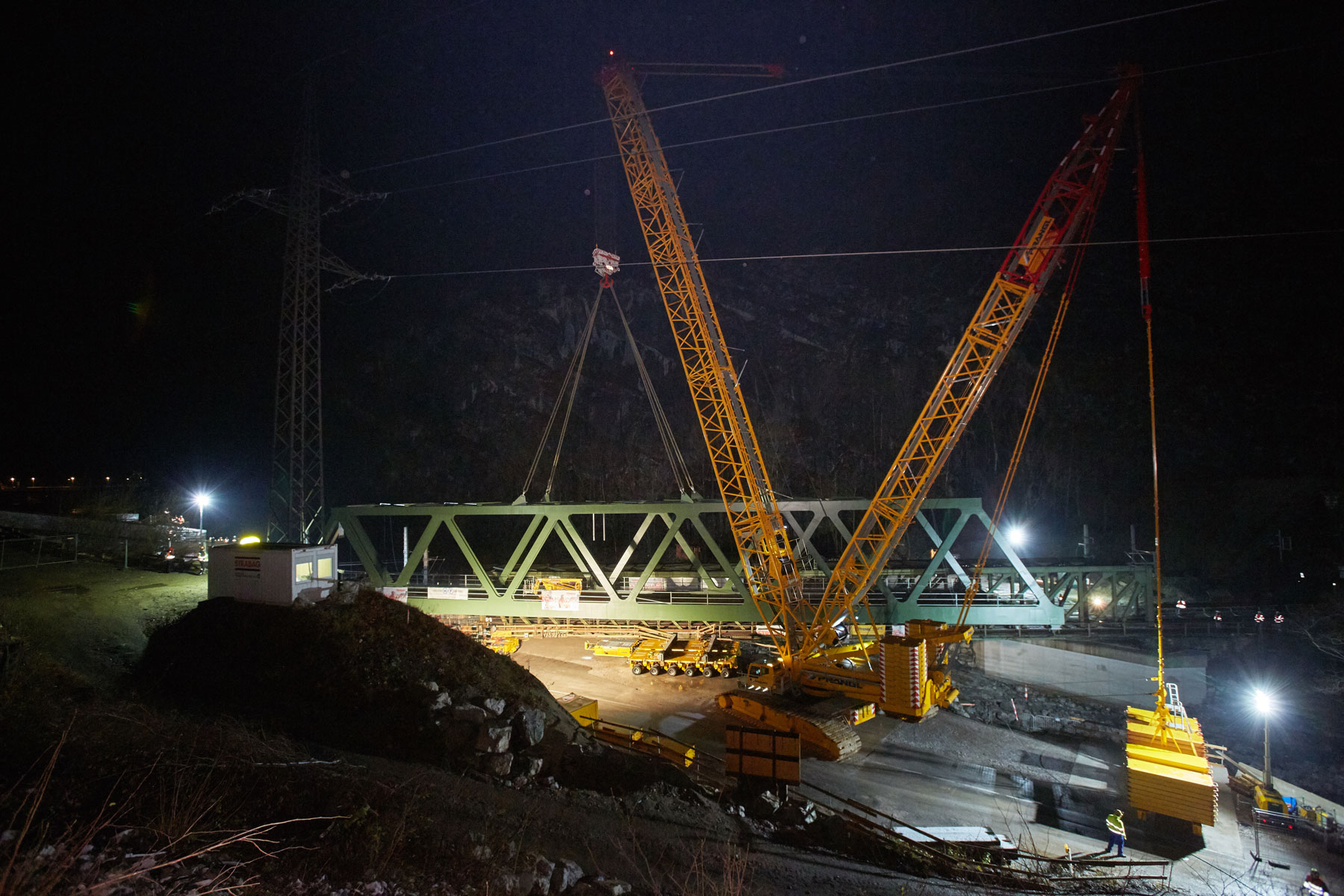 Endlich war es so weit: Kurz nachdem der letzte Zug um 02:00 Uhr die Strecke passierte, konnte mit den eigentlichen Hebearbeiten begonnen werden. Damit der erste planmäßige Zug in der Früh wieder ungehindert fahren kann, stand ein Zeitfenster von knapp zwei Stunden zur Verfügung. Hochspannung für alle Mitwirkenden! Direkt von den selbstfahrenden Schwerlastmodulen wurde das Fachwerk vom Kran übernommen. Aufgrund der Entfernung musste der Raupenkran seine Position einmal verändern und rund 20 Meter mit voller Last verfahren.
