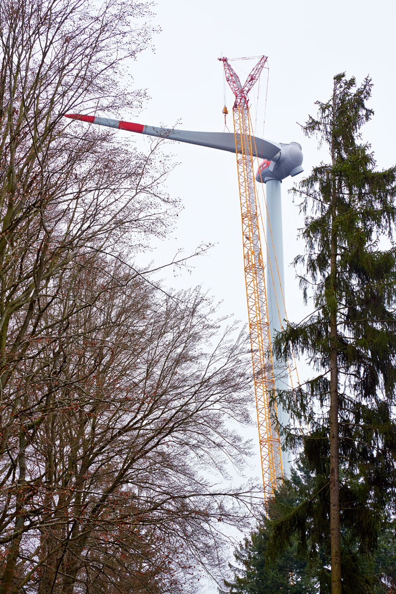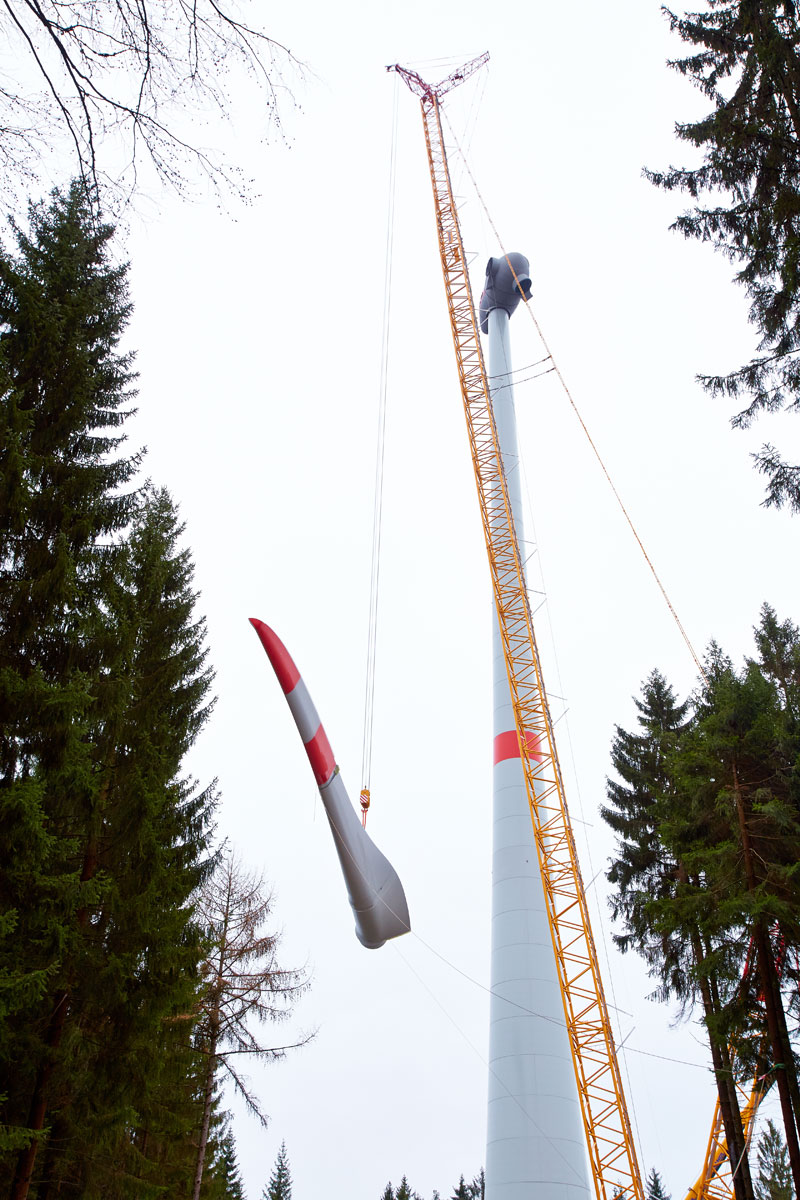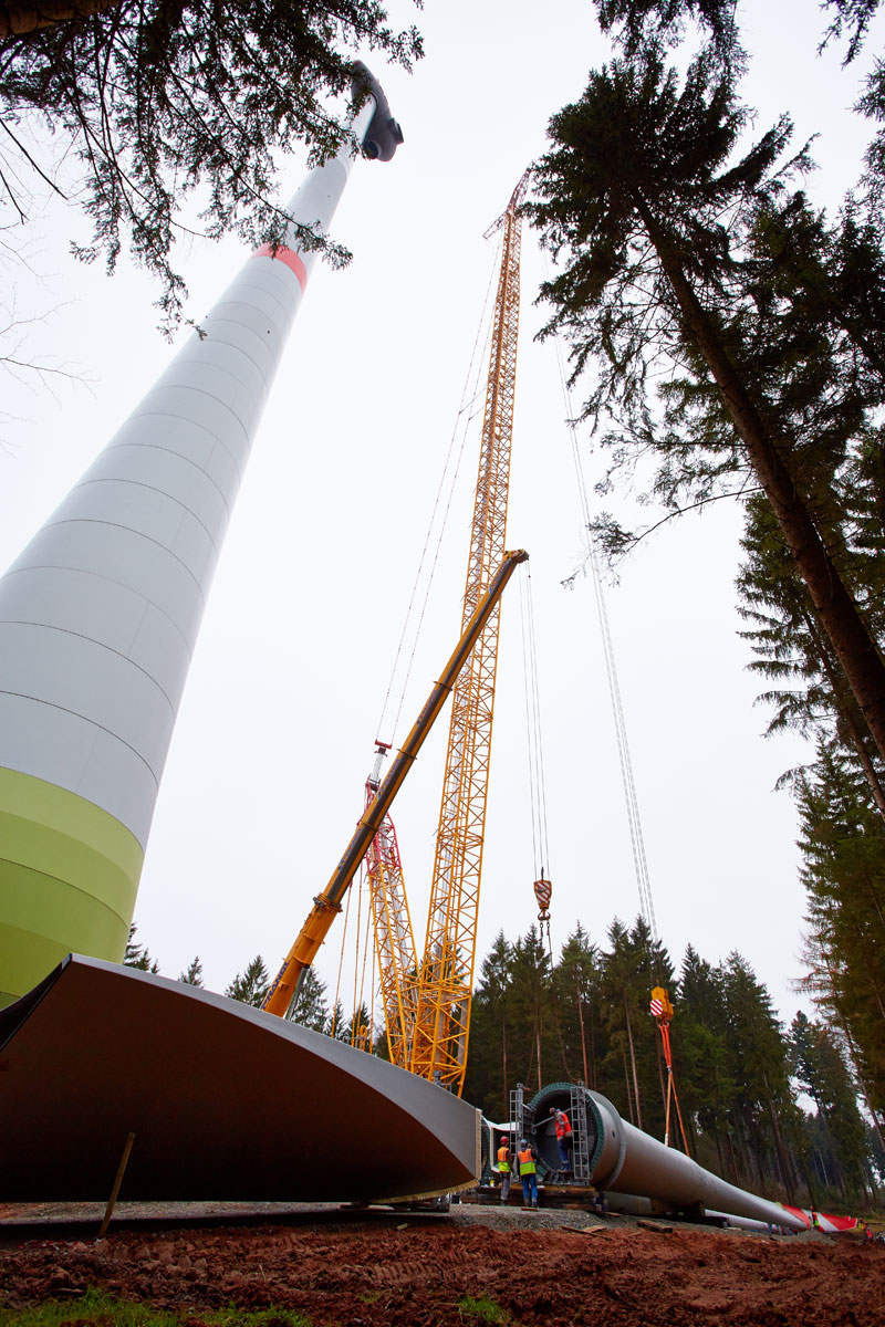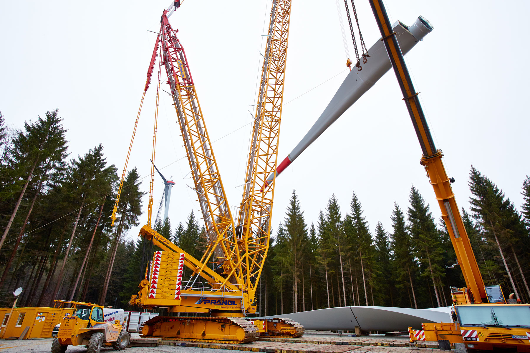 Je Anlage müssen zwei Stahlsektionen mit Maximalgewichten von 55 Tonnen verhoben werden. Die schwersten Komponenten stellen die beiden Maschinenhäuser mit Einzelgewichten bis 64 Tonnen und die beiden Naben mit Einzelgewichten von 65 Tonnen dar. Da sich der Windpark in einem hügeligen Waldgebiet befindet, sind die Platzverhältnisse eher beengt – der Auf- und Abbau der Großkräne ist deshalb eine Herausforderung. In Abstimmung mit dem lokalen Betreiber mussten ein paar Bäume kurzfristig gefällt werden, weil an eine Errichtung sonst nicht zu denken gewesen wäre.