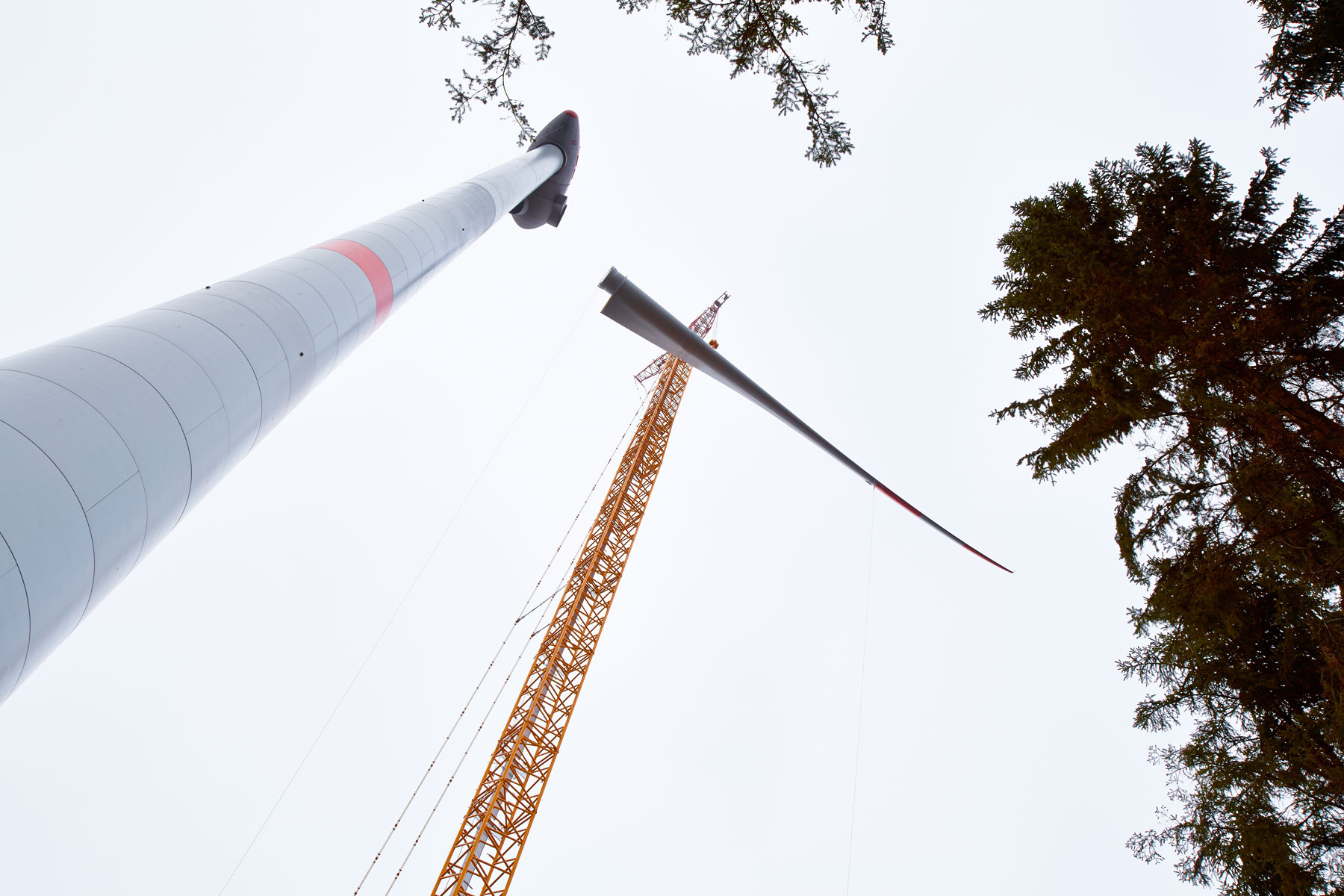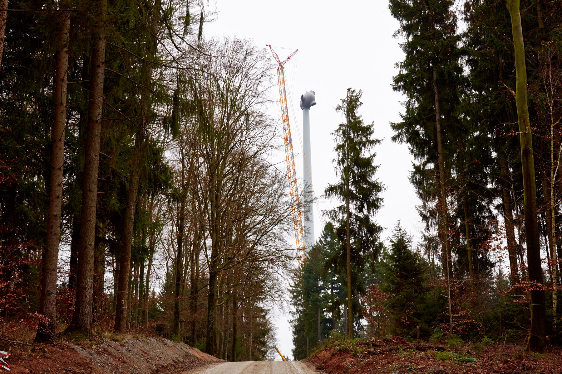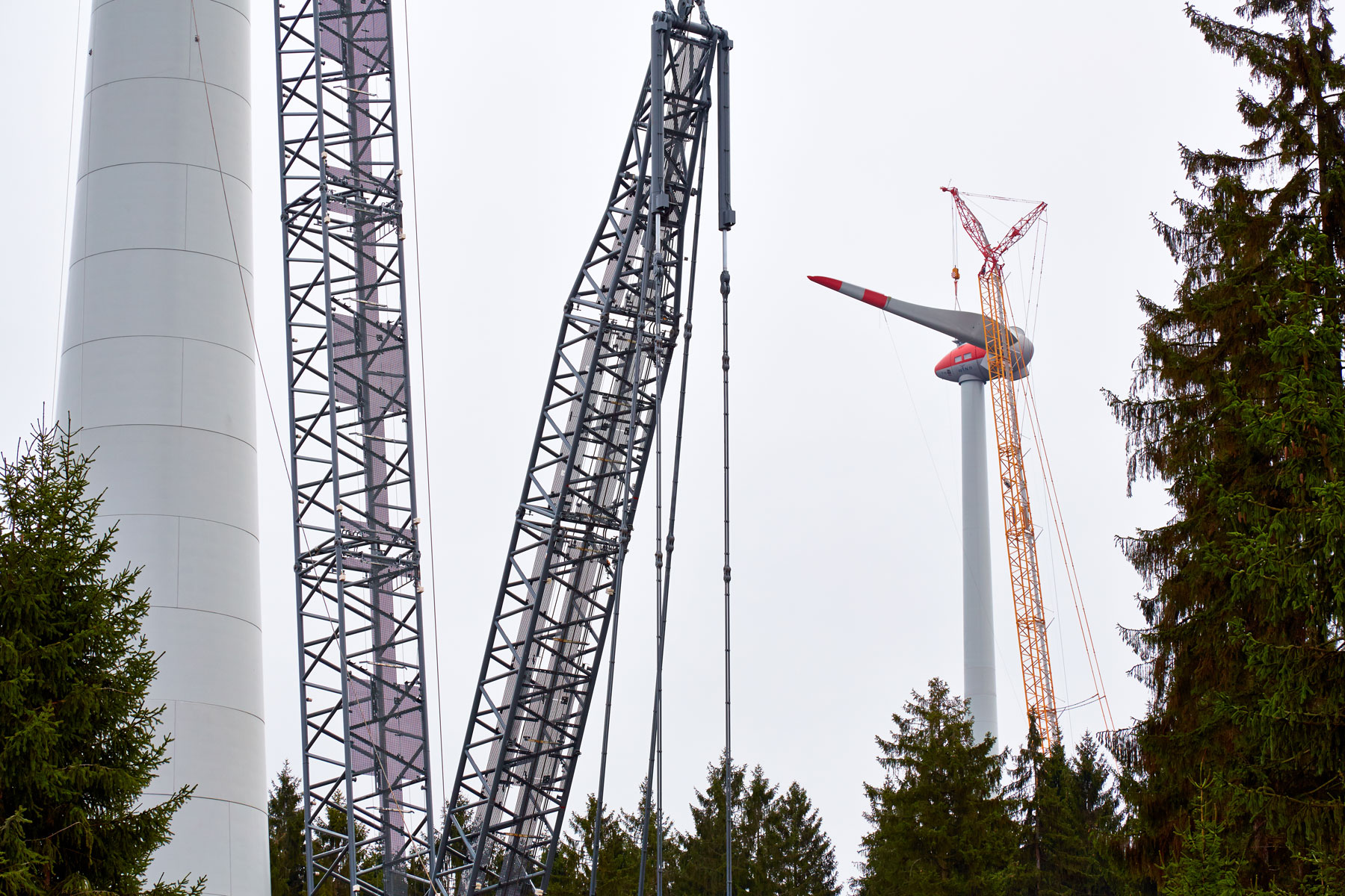 Je Anlage müssen zwei Stahlsektionen mit Maximalgewichten von 55 Tonnen verhoben werden. Die schwersten Komponenten stellen die beiden Maschinenhäuser mit Einzelgewichten bis 64 Tonnen und die beiden Naben mit Einzelgewichten von 65 Tonnen dar. Da sich der Windpark in einem hügeligen Waldgebiet befindet, sind die Platzverhältnisse eher beengt – der Auf- und Abbau der Großkräne ist deshalb eine Herausforderung. In Abstimmung mit dem lokalen Betreiber mussten ein paar Bäume kurzfristig gefällt werden, weil an eine Errichtung sonst nicht zu denken gewesen wäre.