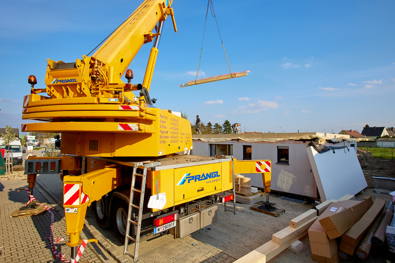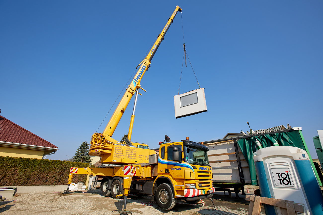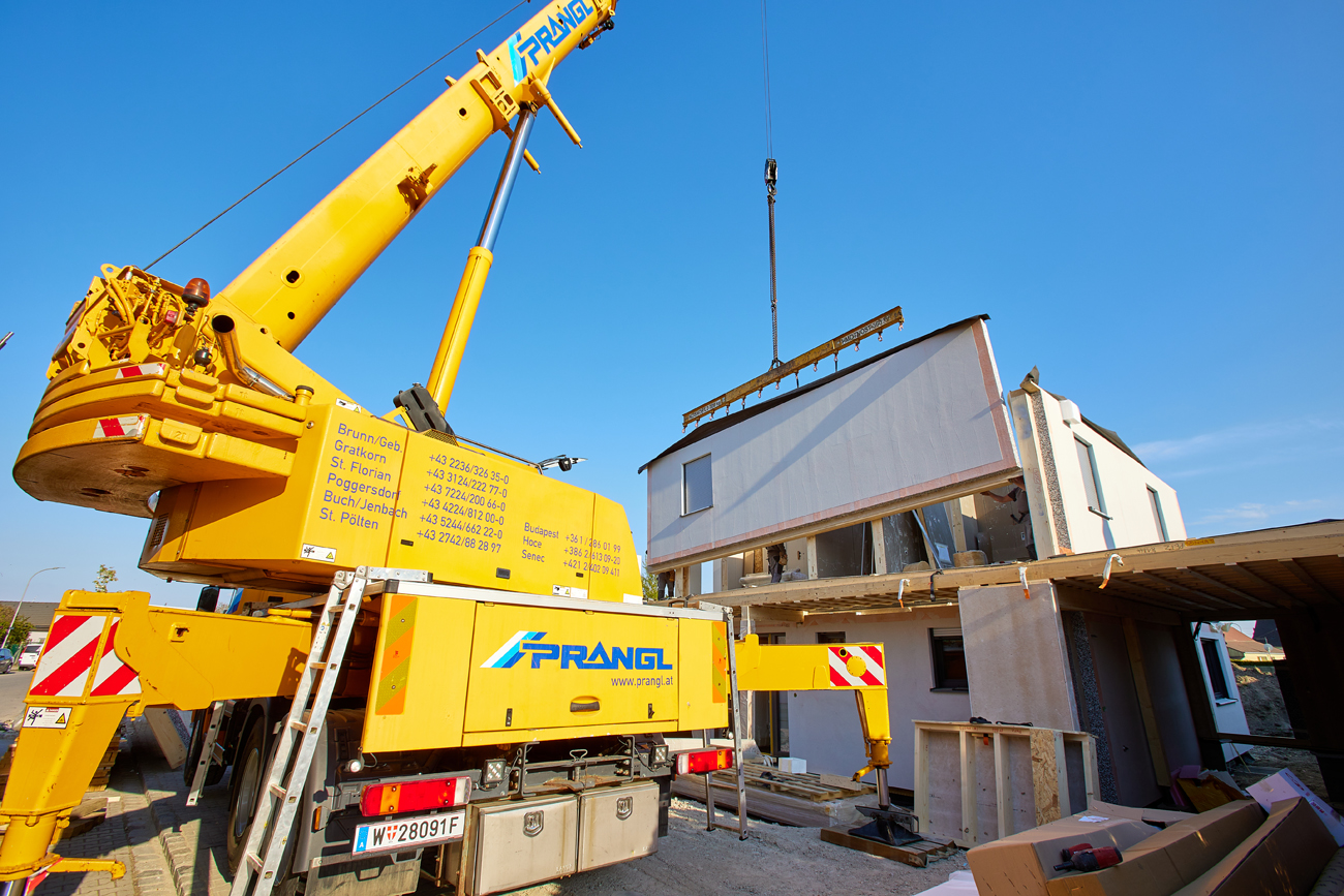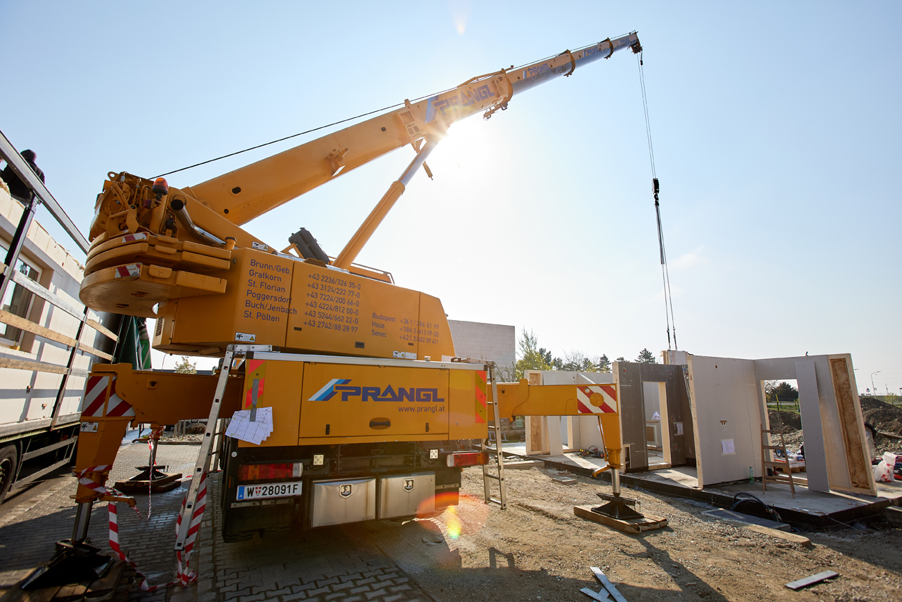 Von Anfang an stand fest, dass hier keine Standardmontage wie üblich auf das Prangl-Team wartete. Zunächst musste auch bei diesem besonders aufwändigen Haus alles perfekt vorbereitet sein, damit der straffe Zeitplan eingehalten werden kann. Sämtliche Lkw-Lieferungen mussten in der richtigen Reihenfolge bereit stehen, die Monteure alles vorbereitet haben. Der Aufbau erfolgte nach einem vorher ausgeklügelten Schema, an das sich alle zu halten hatten. Für das Aufstellen der vorgefertigten Außen- und Innenwände, sowie des Daches wählten die Experten von Prangl einen 35 Tonnen Fahrzeugkran.