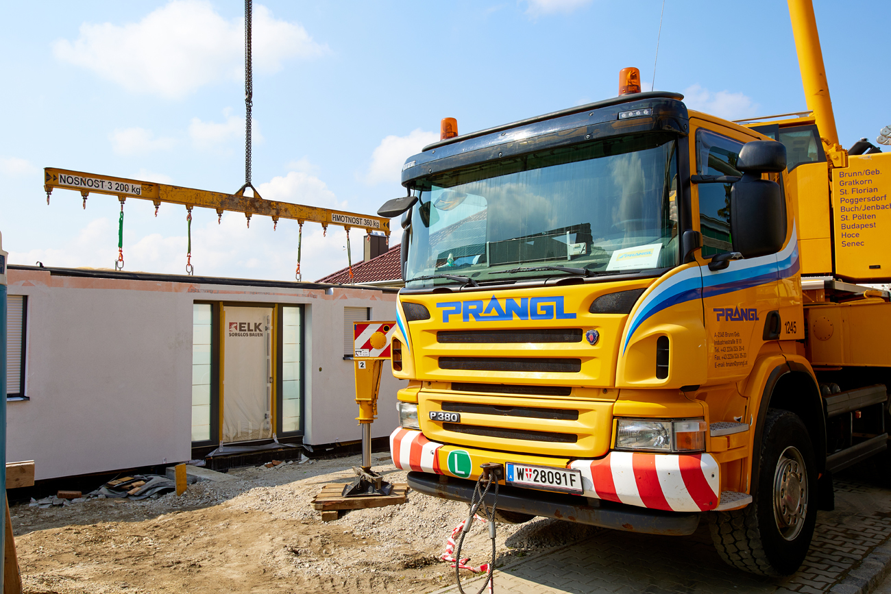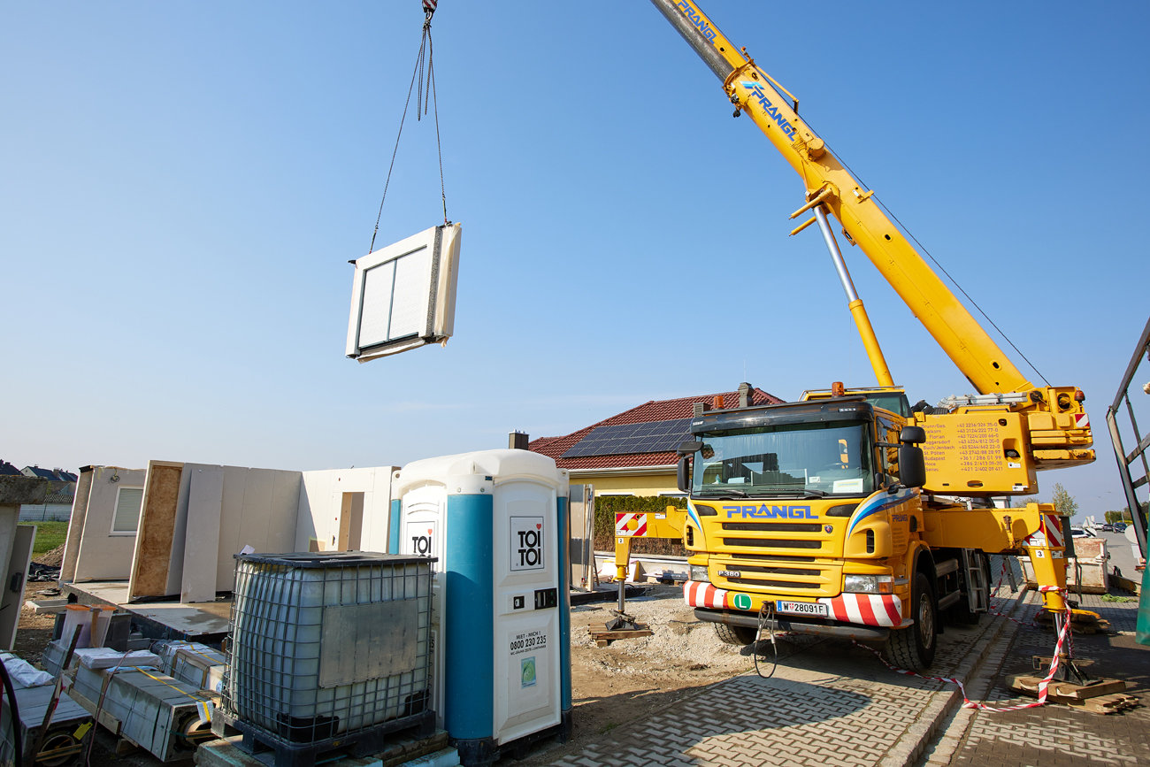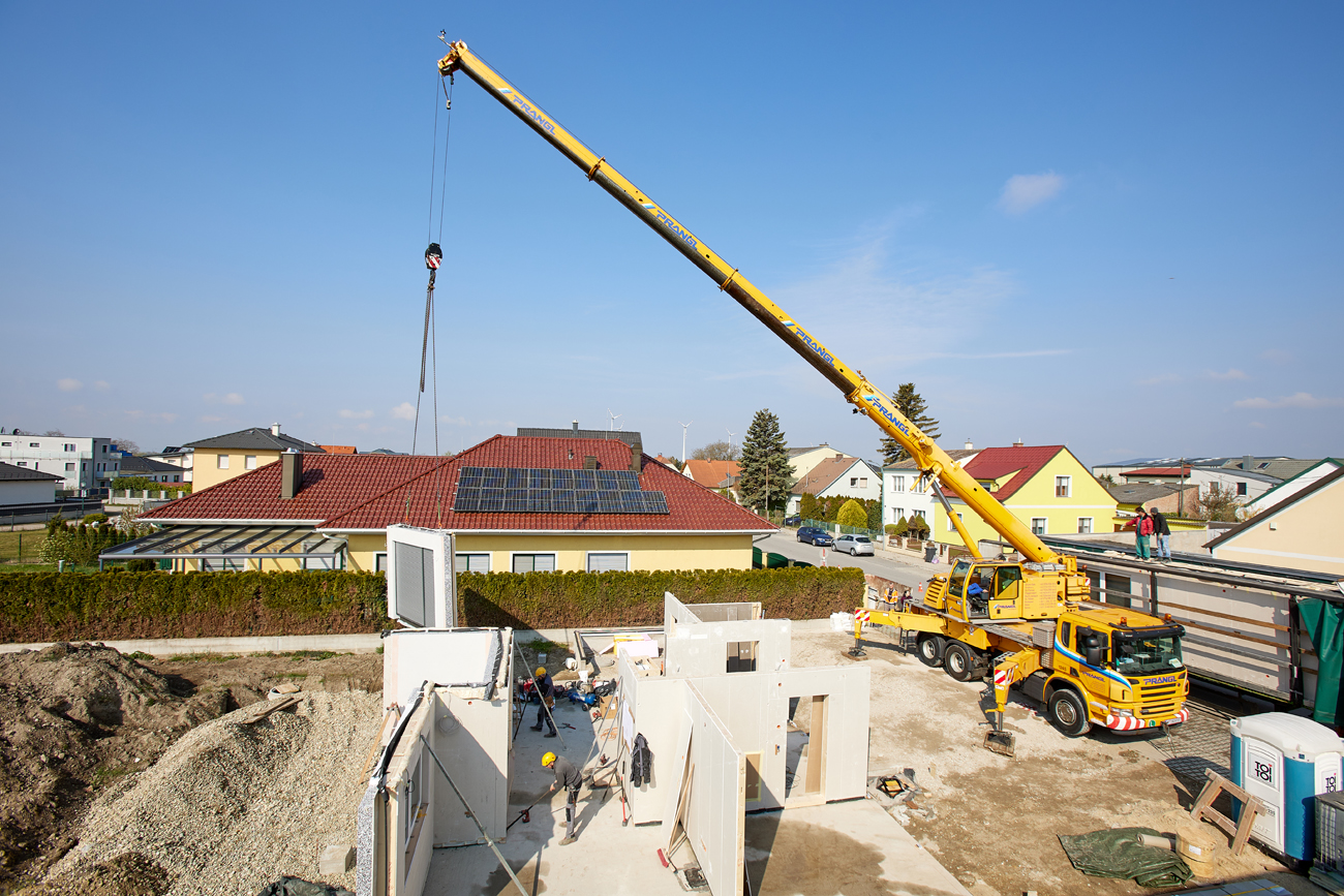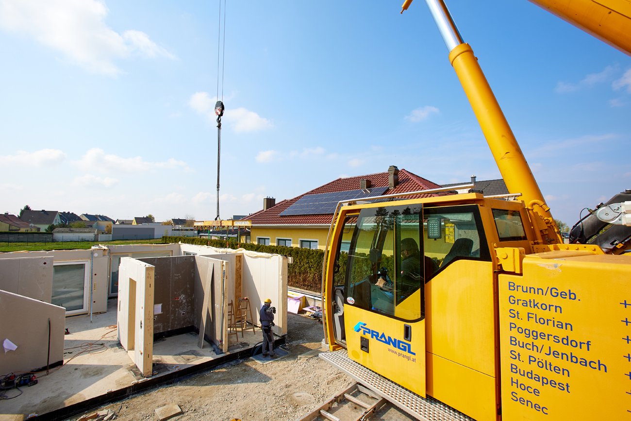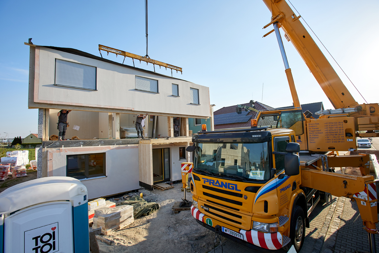 Von Anfang an stand fest, dass hier keine Standardmontage wie üblich auf das Prangl-Team wartete. Zunächst musste auch bei diesem besonders aufwändigen Haus alles perfekt vorbereitet sein, damit der straffe Zeitplan eingehalten werden kann. Sämtliche Lkw-Lieferungen mussten in der richtigen Reihenfolge bereit stehen, die Monteure alles vorbereitet haben. Der Aufbau erfolgte nach einem vorher ausgeklügelten Schema, an das sich alle zu halten hatten. Für das Aufstellen der vorgefertigten Außen- und Innenwände, sowie des Daches wählten die Experten von Prangl einen 35 Tonnen Fahrzeugkran.