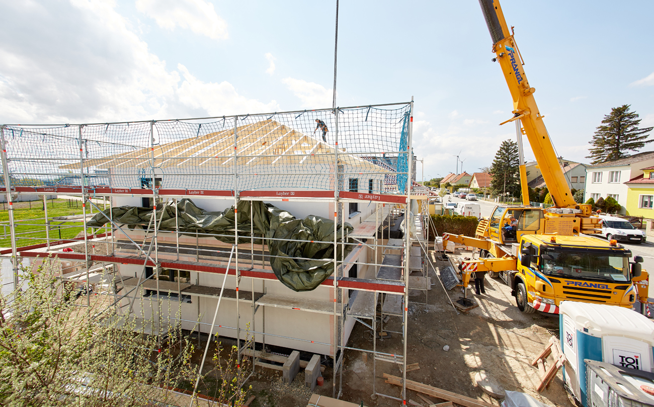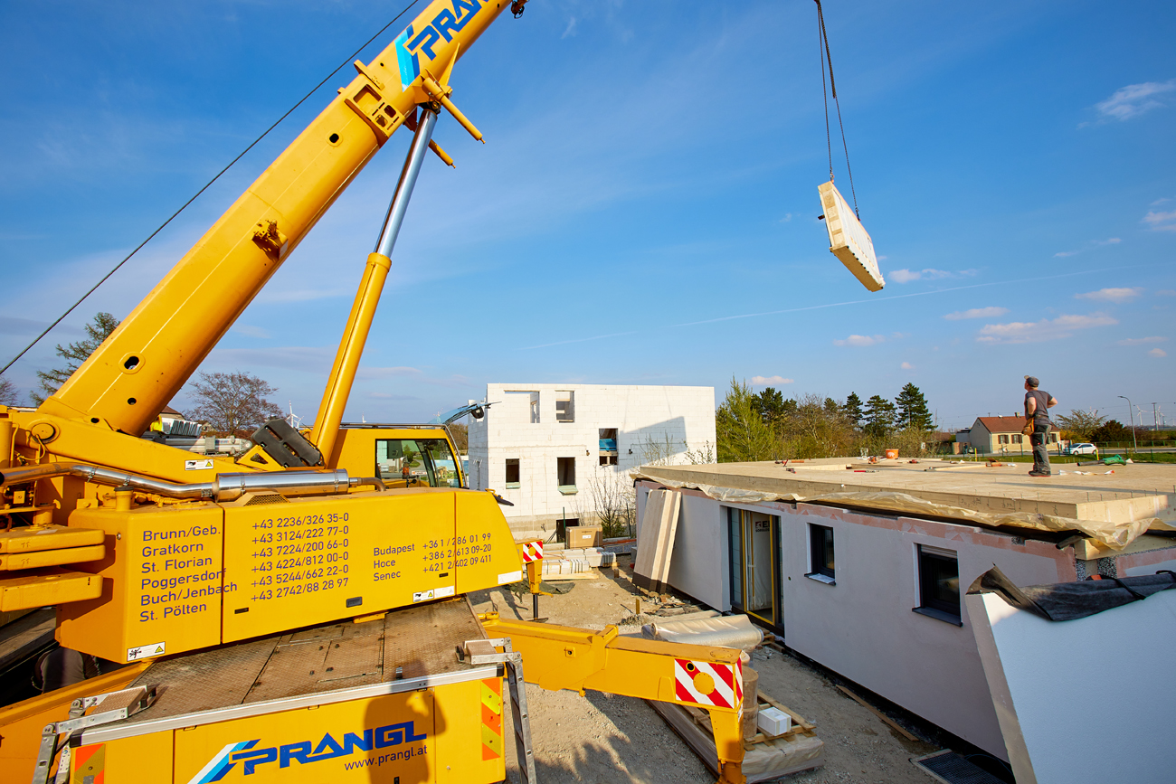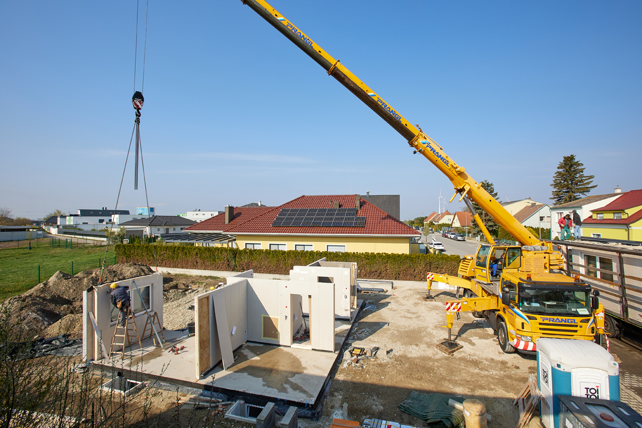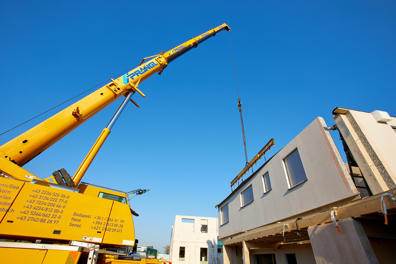 Von Anfang an stand fest, dass hier keine Standardmontage wie üblich auf das Prangl-Team wartete. Zunächst musste auch bei diesem besonders aufwändigen Haus alles perfekt vorbereitet sein, damit der straffe Zeitplan eingehalten werden kann. Sämtliche Lkw-Lieferungen mussten in der richtigen Reihenfolge bereit stehen, die Monteure alles vorbereitet haben. Der Aufbau erfolgte nach einem vorher ausgeklügelten Schema, an das sich alle zu halten hatten. Für das Aufstellen der vorgefertigten Außen- und Innenwände, sowie des Daches wählten die Experten von Prangl einen 35 Tonnen Fahrzeugkran.