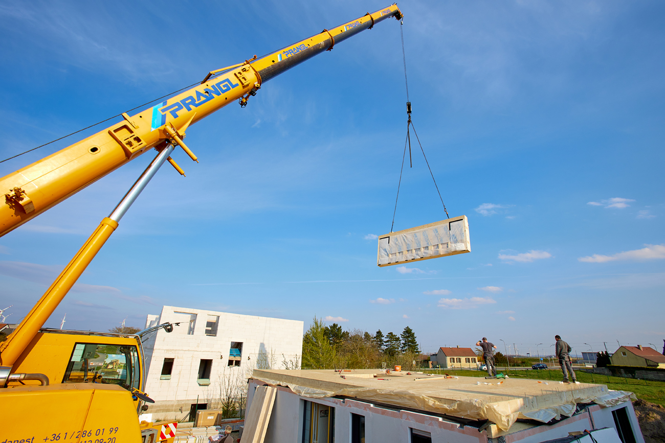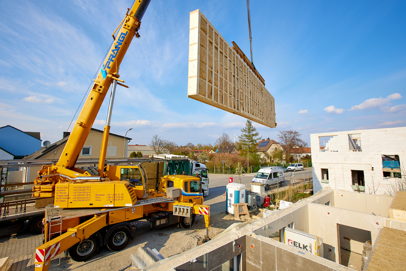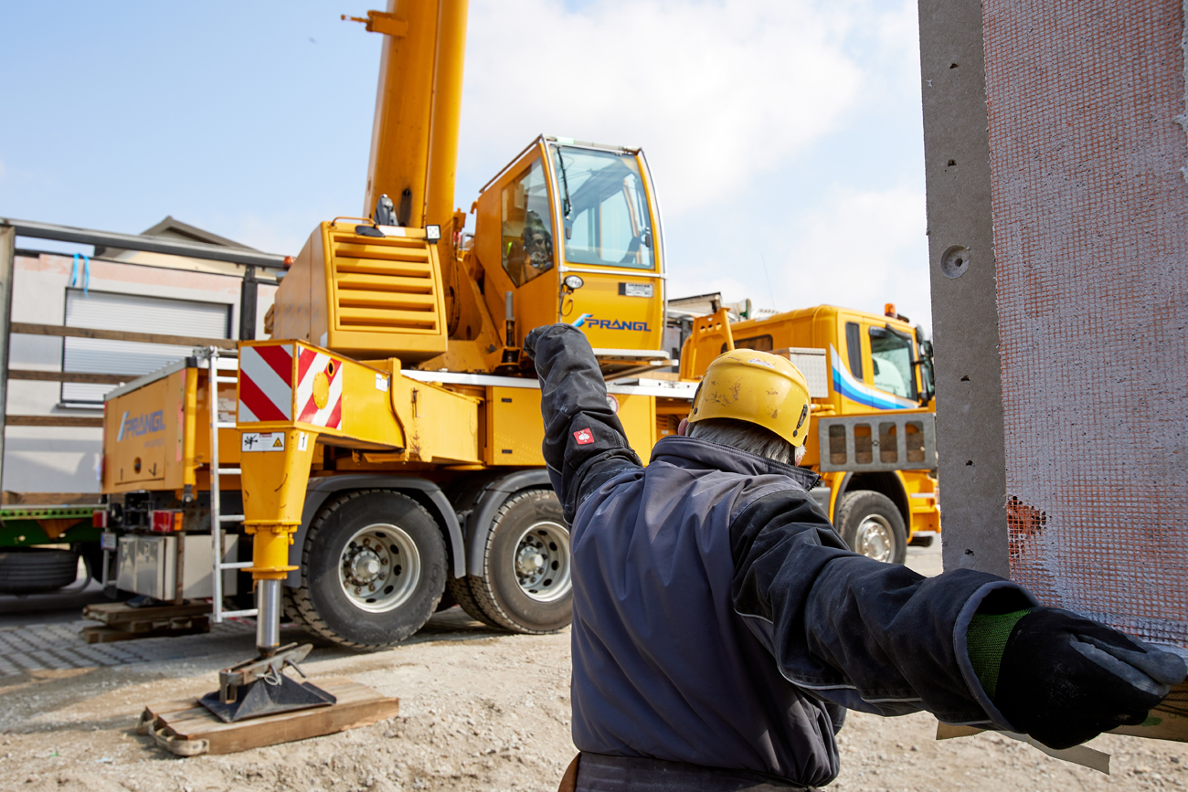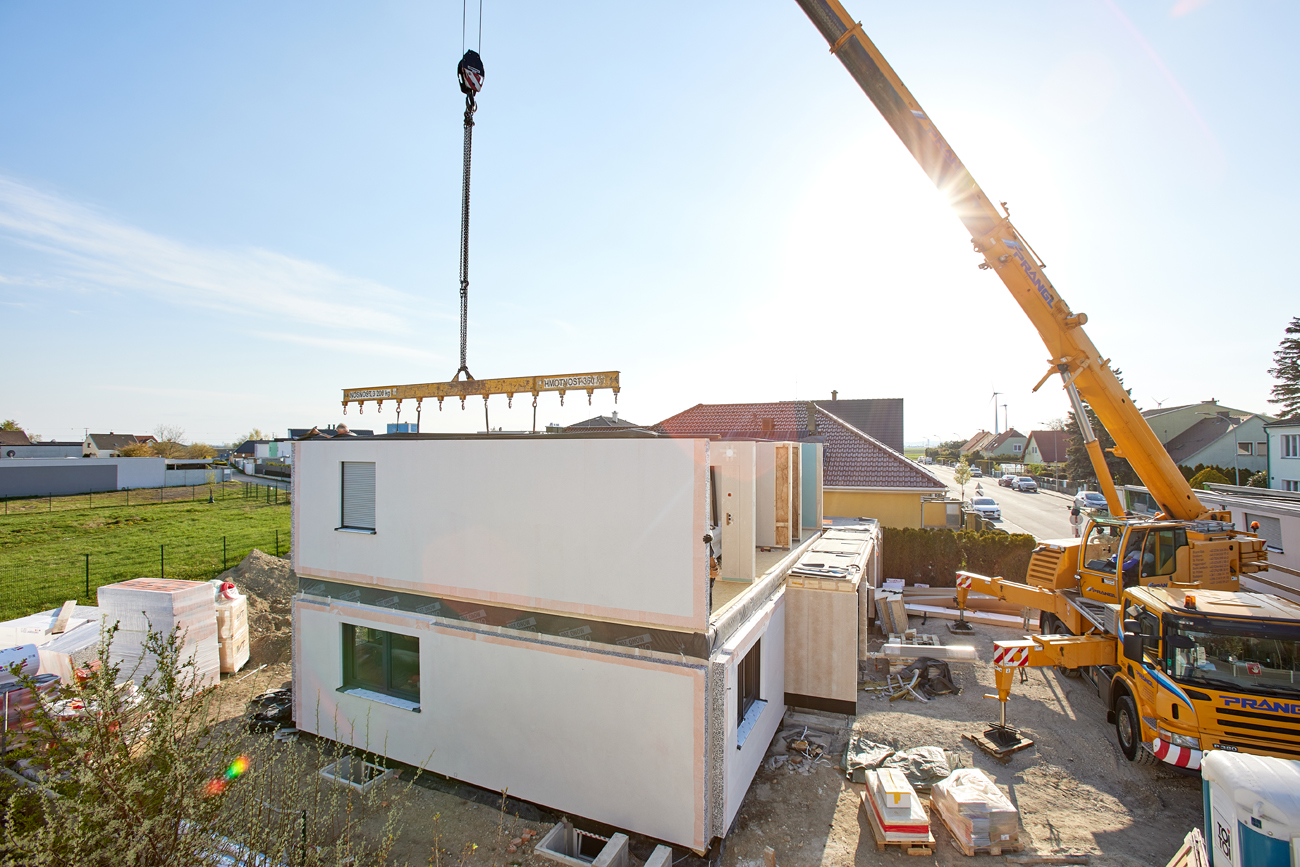 Dank der ausgesprochen guten Zusammenarbeit zwischen Kranfahrer, Bauleitung und Monteuren wuchs das Haus rasch und ohne Verzögerung in die Höhe. Auch das Aufsetzen des Daches klappte wie am Schnürchen. Beim gesamten Ablauf spielte die große Erfahrung des Prangl-Spezialisten in Sachen Fertigteilhaus eine große Rolle. Mit Ruhe, Übersicht und großer Präzision beim Aufstellen der Hausteile überzeugte er den Auftraggeber. Dass der Zeitplan exakt eingehalten wurde, war dabei Ehrensache. Und so wird das neue Eigenheim schon bald bezogen werden können.