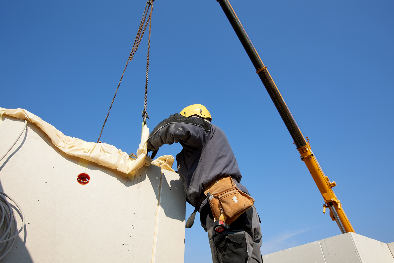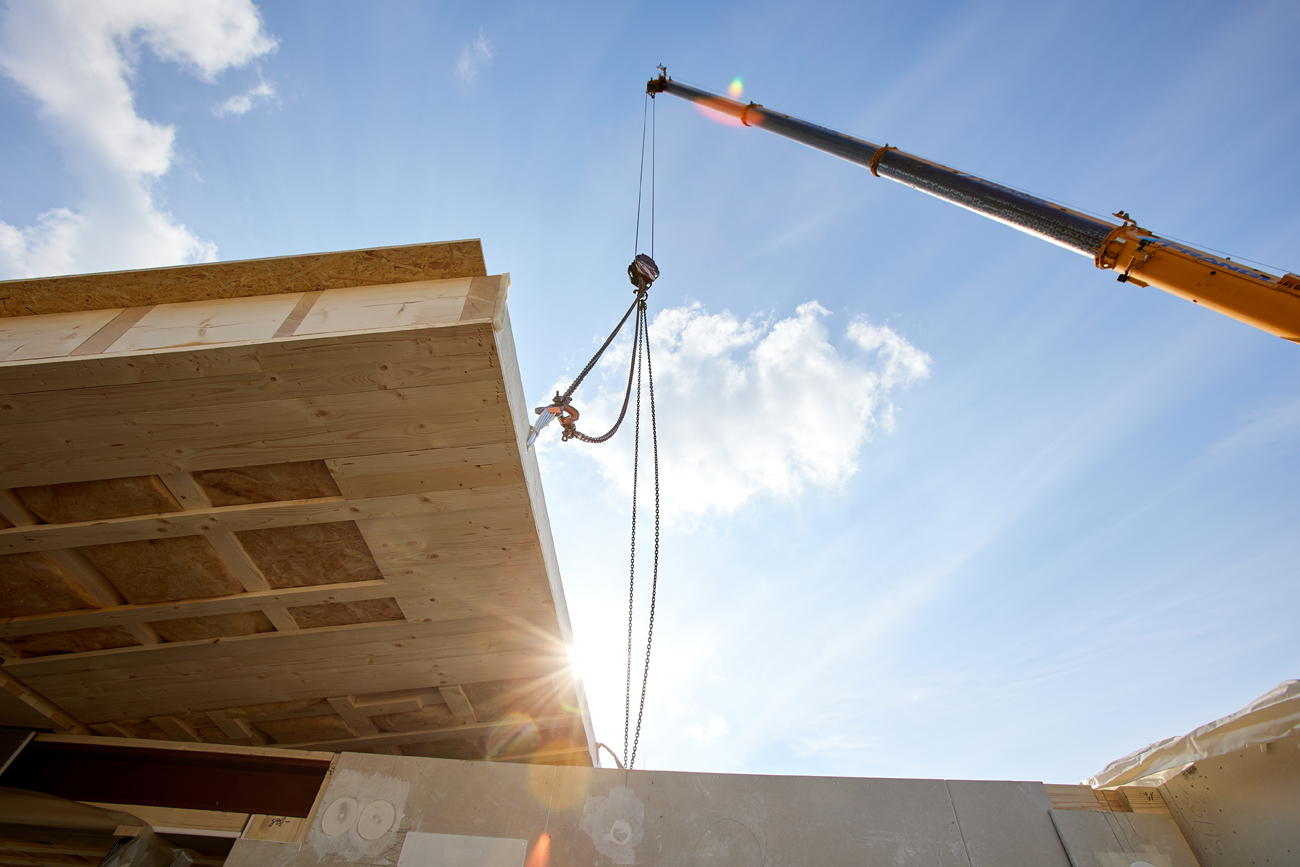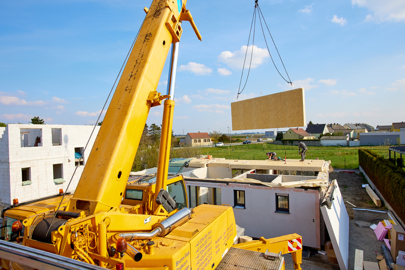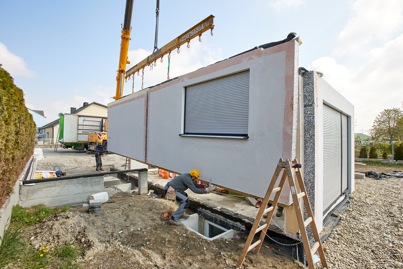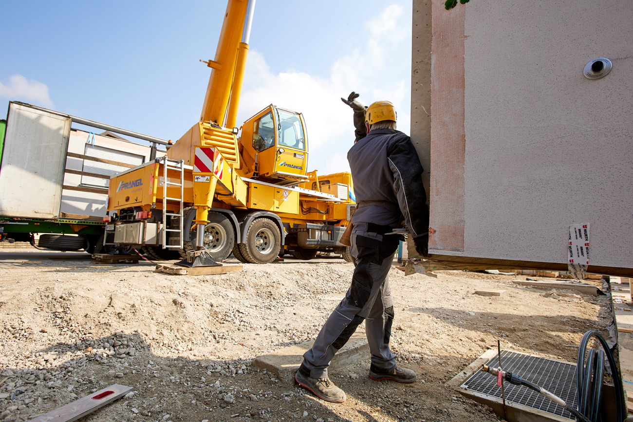 Dank der ausgesprochen guten Zusammenarbeit zwischen Kranfahrer, Bauleitung und Monteuren wuchs das Haus rasch und ohne Verzögerung in die Höhe. Auch das Aufsetzen des Daches klappte wie am Schnürchen. Beim gesamten Ablauf spielte die große Erfahrung des Prangl-Spezialisten in Sachen Fertigteilhaus eine große Rolle. Mit Ruhe, Übersicht und großer Präzision beim Aufstellen der Hausteile überzeugte er den Auftraggeber. Dass der Zeitplan exakt eingehalten wurde, war dabei Ehrensache. Und so wird das neue Eigenheim schon bald bezogen werden können.