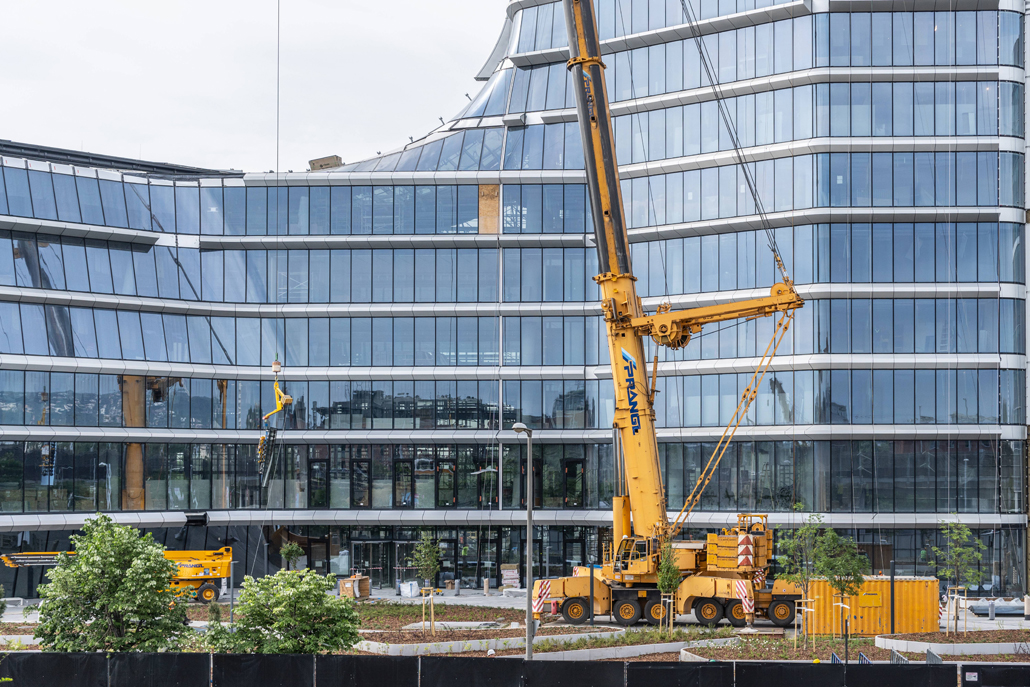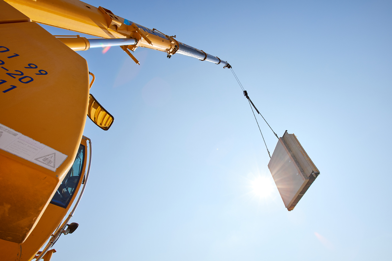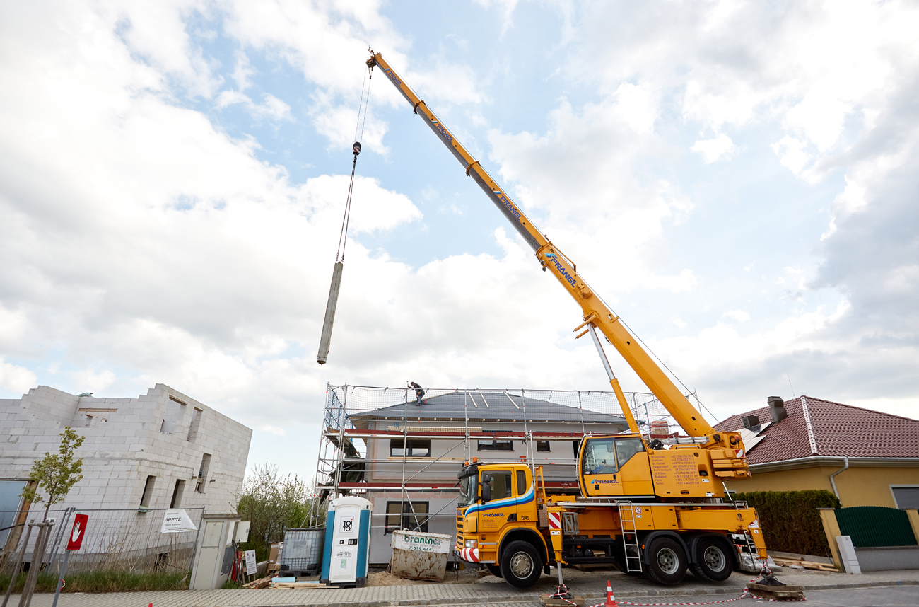 Dieser Kran hat gegenüber anderen Geräten klare Vorteile: Er ist wendig und effizient, denn er kann mit kompletter Ausrüstung einfach auf jede Baustelle fahren. Dort ist er dann auf der Stelle einsatzbereit. Mit dem 30 Meter Hauptausleger und einer maximalen Systemlänge von 45 Meter ist er die optimale Lösung für den Aufbau eines solchen Hauses. Und so verlief der Aufbau des neuen Eigenheimes bilderbuchmäßig ab: Die Fertigteile mit Einzelgewichten von bis zu 3 Tonnen wurden mit einer maximalen Ausladung von 16 Meter Stück für Stück an ihren Platz gehoben, ausgerichtet und von den Monteuren verschraubt.