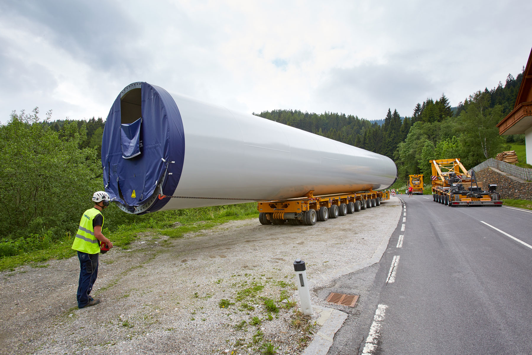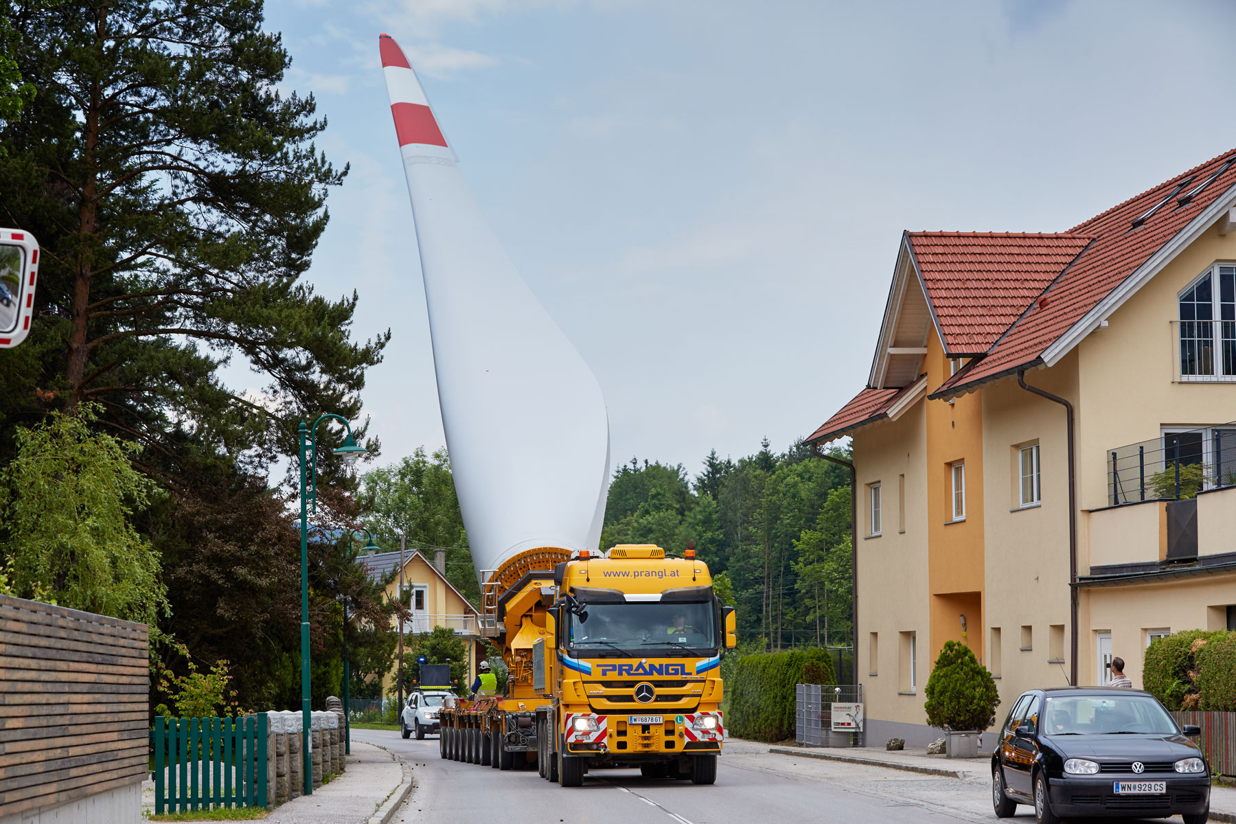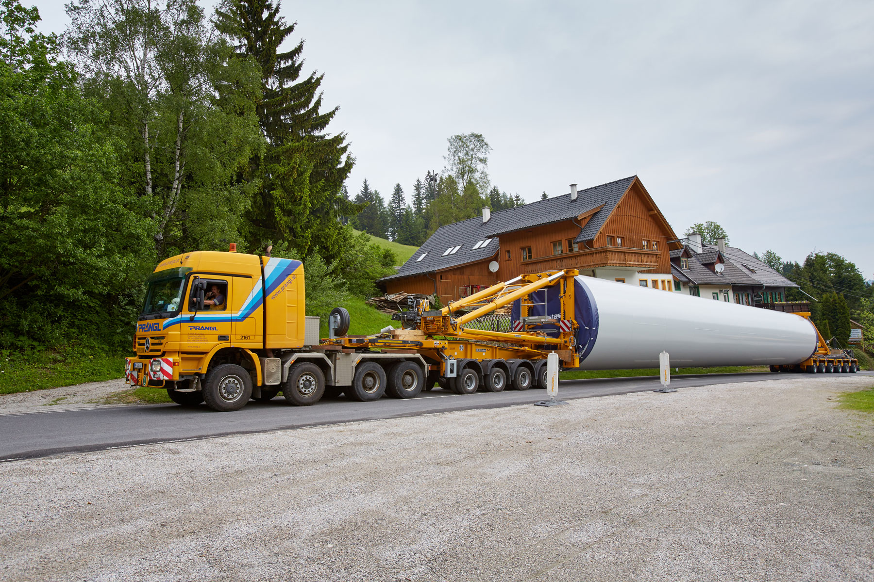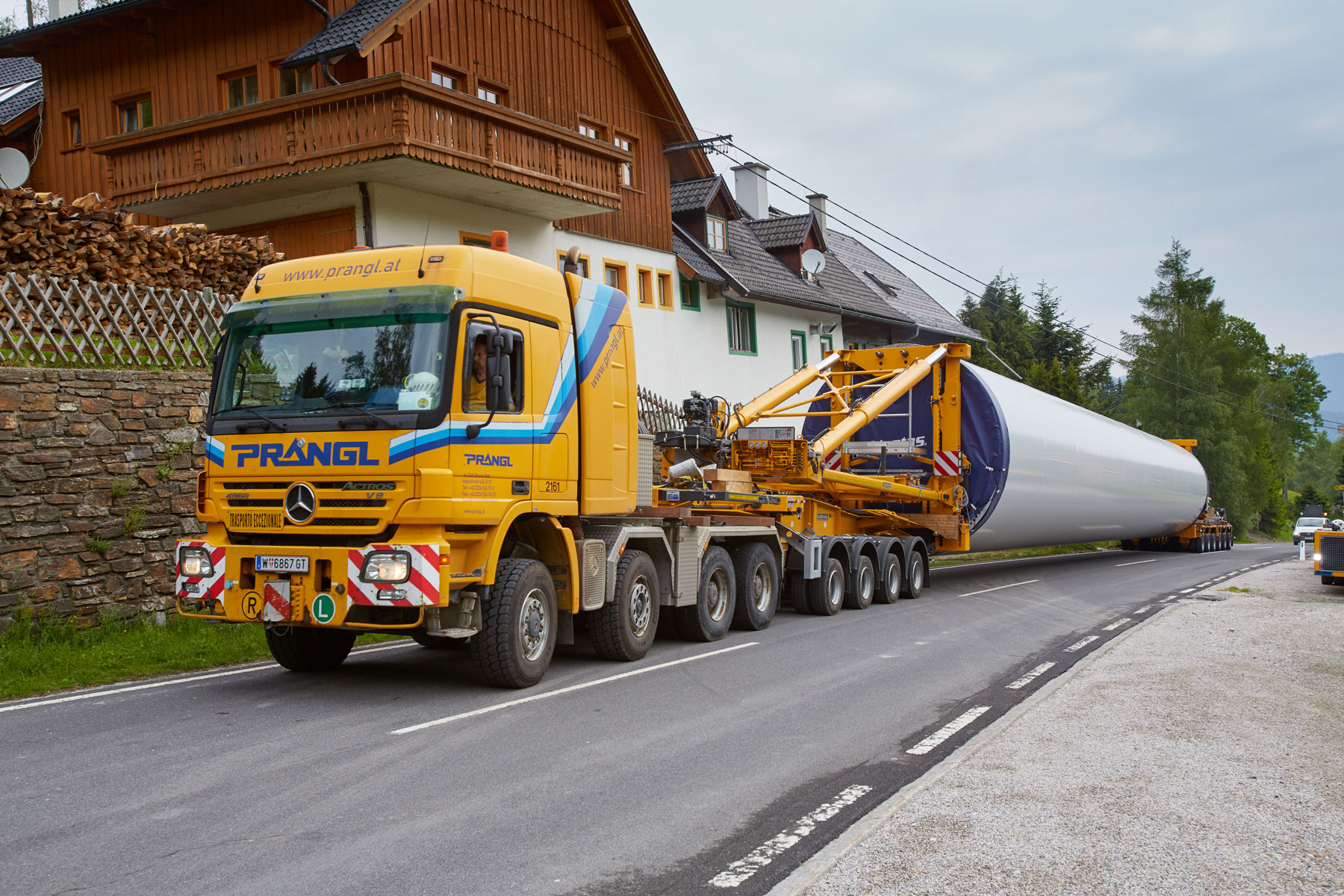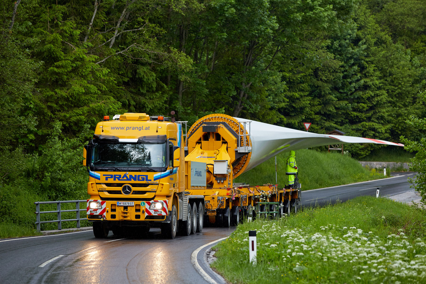 Erstmalig in Europa war auch der Transport der knapp 55 Meter langen Rotorblätter. Wurde Prangls Flügeltransportvorrichtung bisher nur auf einem ferngesteuerten Selbstfahrer montiert, wurde sie dieses Mal auf Modulachsanhängern in Kombination mit einer Allradzugmaschine angebracht. Zwar sind die selbstfahrenden Schwerlastmodule wendiger, dafür können sie aber nur im Schritttempo fahren. Bei einer verbleibenden Strecke von 39 Kilometer wäre das zu langsam, unwirtschaftlich und vor allem auch zu verkehrsblockierend gewesen. Mit den straßenzugelassenen Achsmodulen konnten immerhin Geschwindigkeiten bis 30 km/h erreicht werden – trotz der enormen Gesamtzuglänge von 73 Meter.