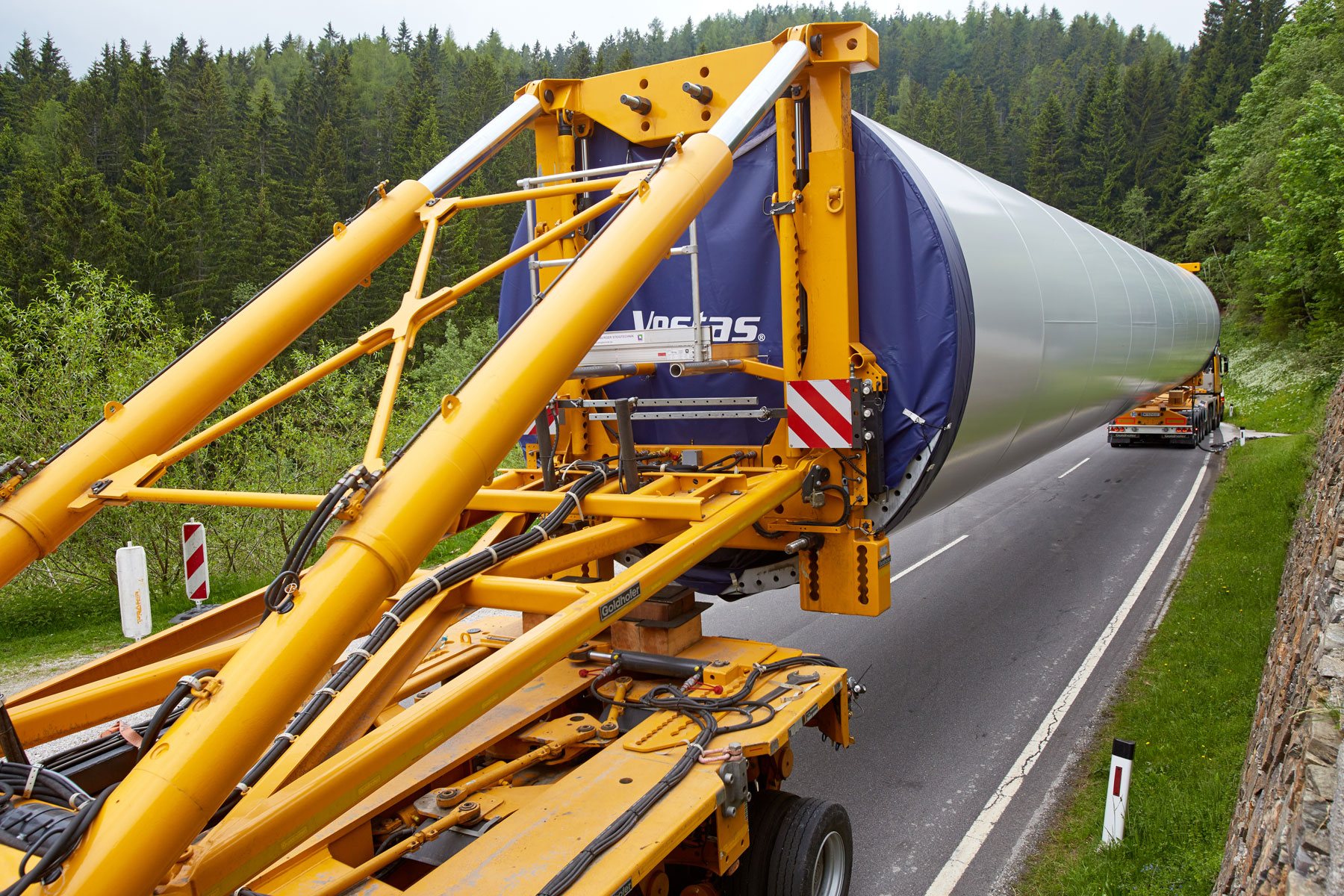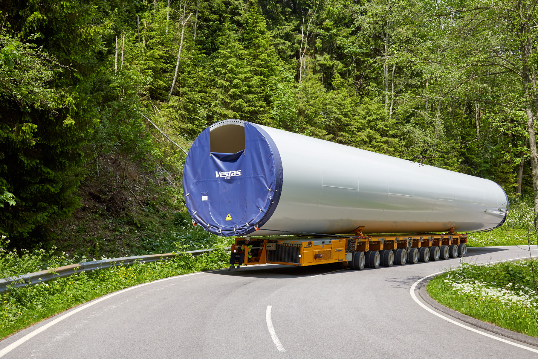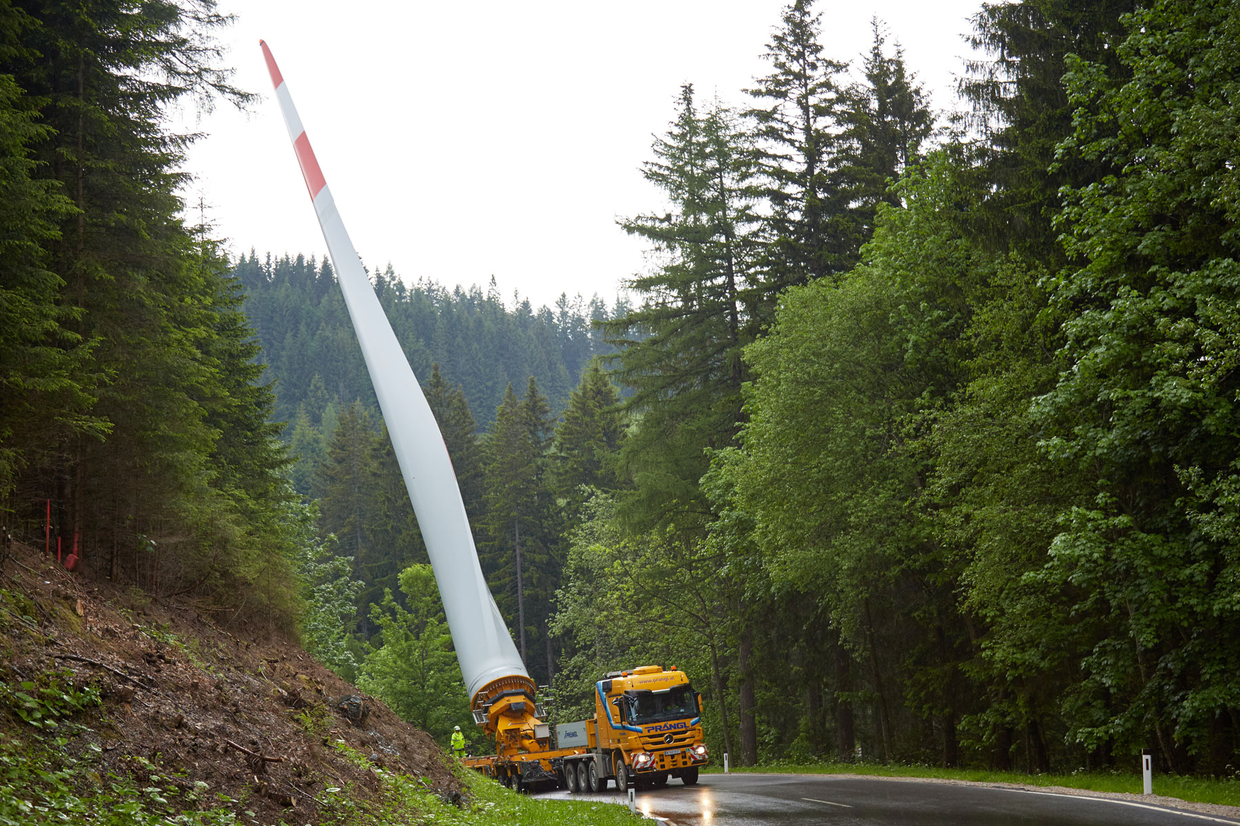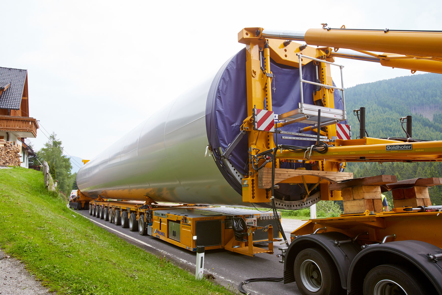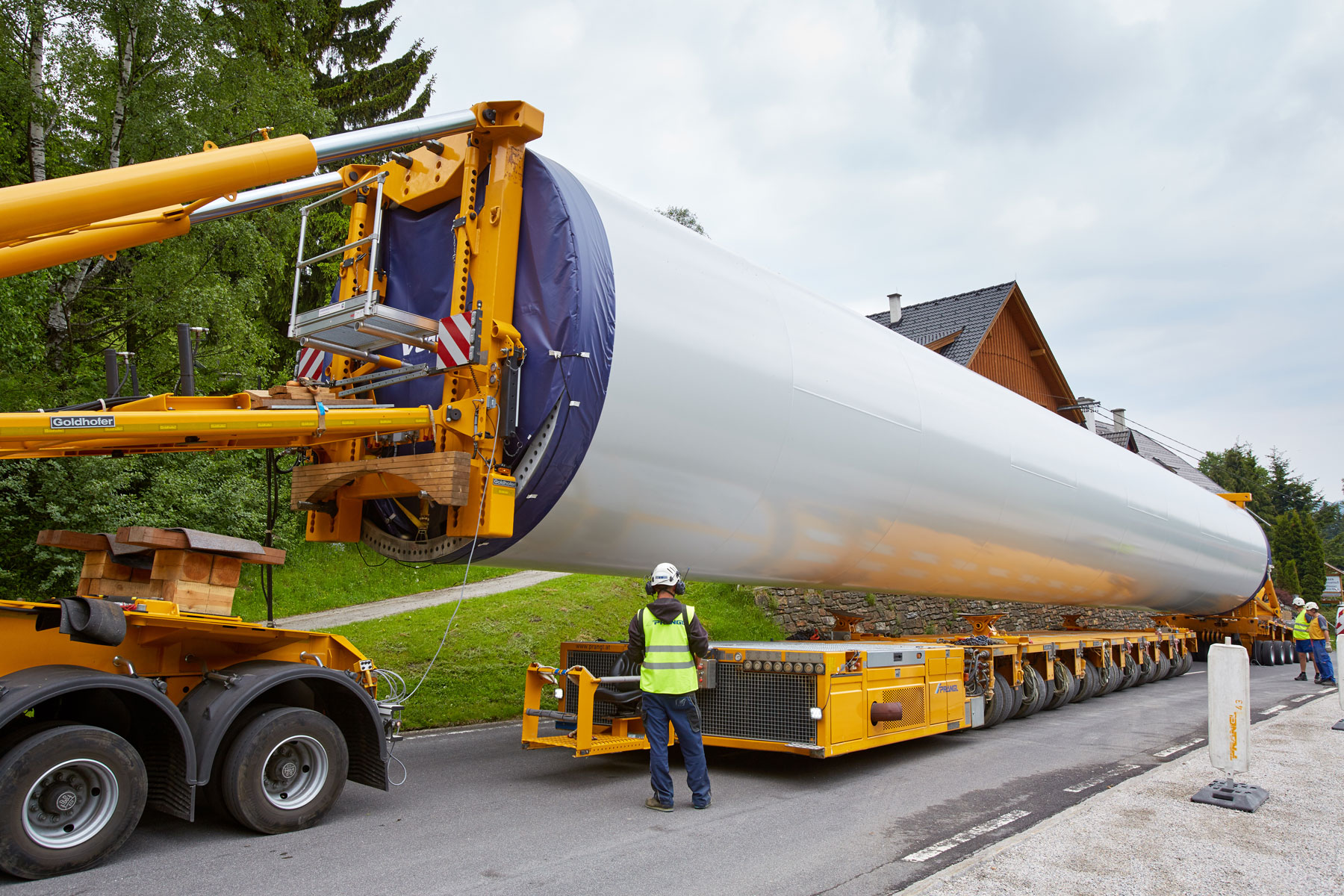 Erstmalig in Europa war auch der Transport der knapp 55 Meter langen Rotorblätter. Wurde Prangls Flügeltransportvorrichtung bisher nur auf einem ferngesteuerten Selbstfahrer montiert, wurde sie dieses Mal auf Modulachsanhängern in Kombination mit einer Allradzugmaschine angebracht. Zwar sind die selbstfahrenden Schwerlastmodule wendiger, dafür können sie aber nur im Schritttempo fahren. Bei einer verbleibenden Strecke von 39 Kilometer wäre das zu langsam, unwirtschaftlich und vor allem auch zu verkehrsblockierend gewesen. Mit den straßenzugelassenen Achsmodulen konnten immerhin Geschwindigkeiten bis 30 km/h erreicht werden – trotz der enormen Gesamtzuglänge von 73 Meter.