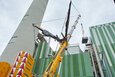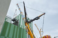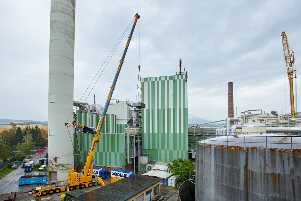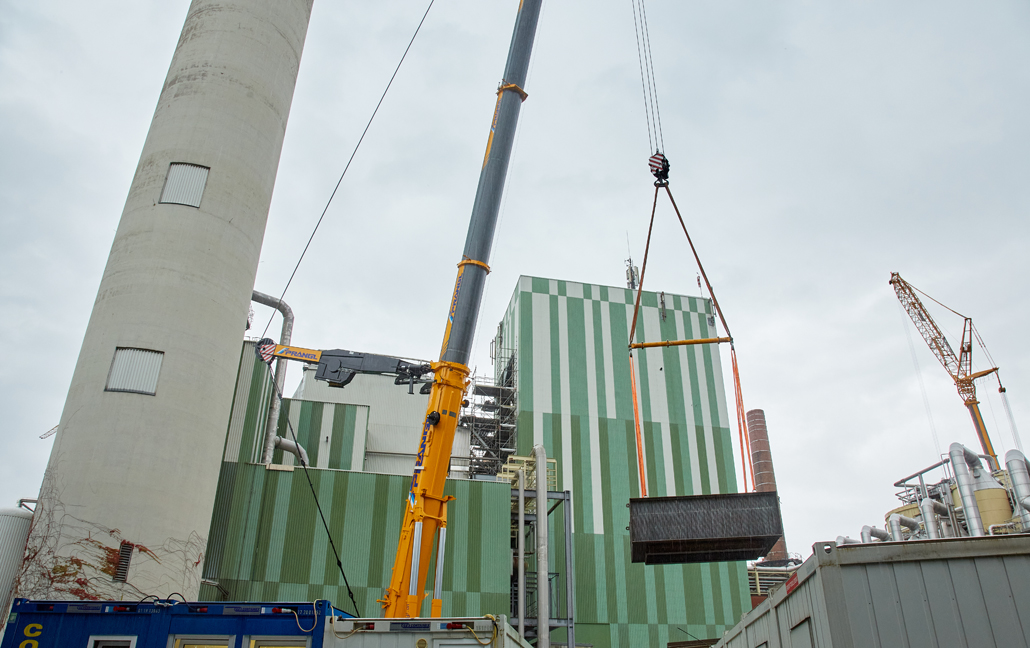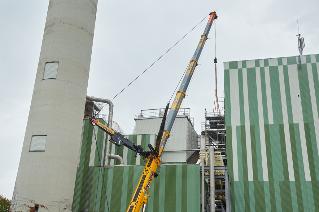 Im ersten Schritt wurde mit Hilfe eines 160 Tonnen Teleskopkrans die Hallenwand in Höhe des Wärmetauschers geöffnet, gefolgt von der Montage einer Hilfskonstruktion. Anschließend wurde ein speziell konzipiertes Schienensystem installiert, welches das Ein- und Ausschieben sowie das Anheben der Wärmetauscherpakete ermöglichte. Der präzise positionierte 700 Tonnen Mobilkran hob zunächst kleinere Komponenten des alten Wärmetauschers heraus. Das Hauptpaket des alten Wärmetauschers wurde ausgeschoben und sicher vom Schwerlastkran entfernt. Danach wurde das neue Wärmetauscherpaket millimetergenau auf die Hilfskonstruktion gesetzt, eingeschoben und montiert.